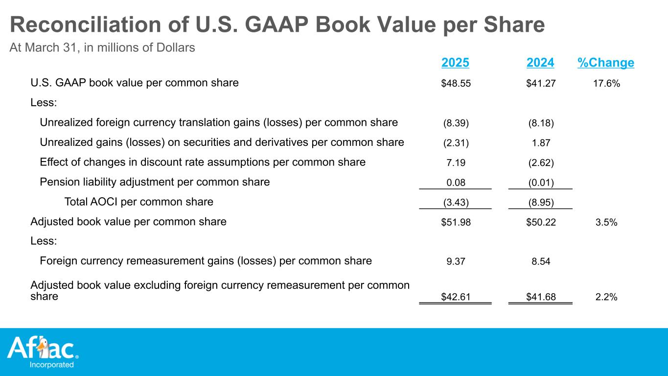 第1四半期、アフラック・インコーポレーテッドは9億ドルの資本を投入し、850万株の普通株式を買い戻した。2025年3月末現在、同社には3,880万株の自社株買戻し枠が残っている。