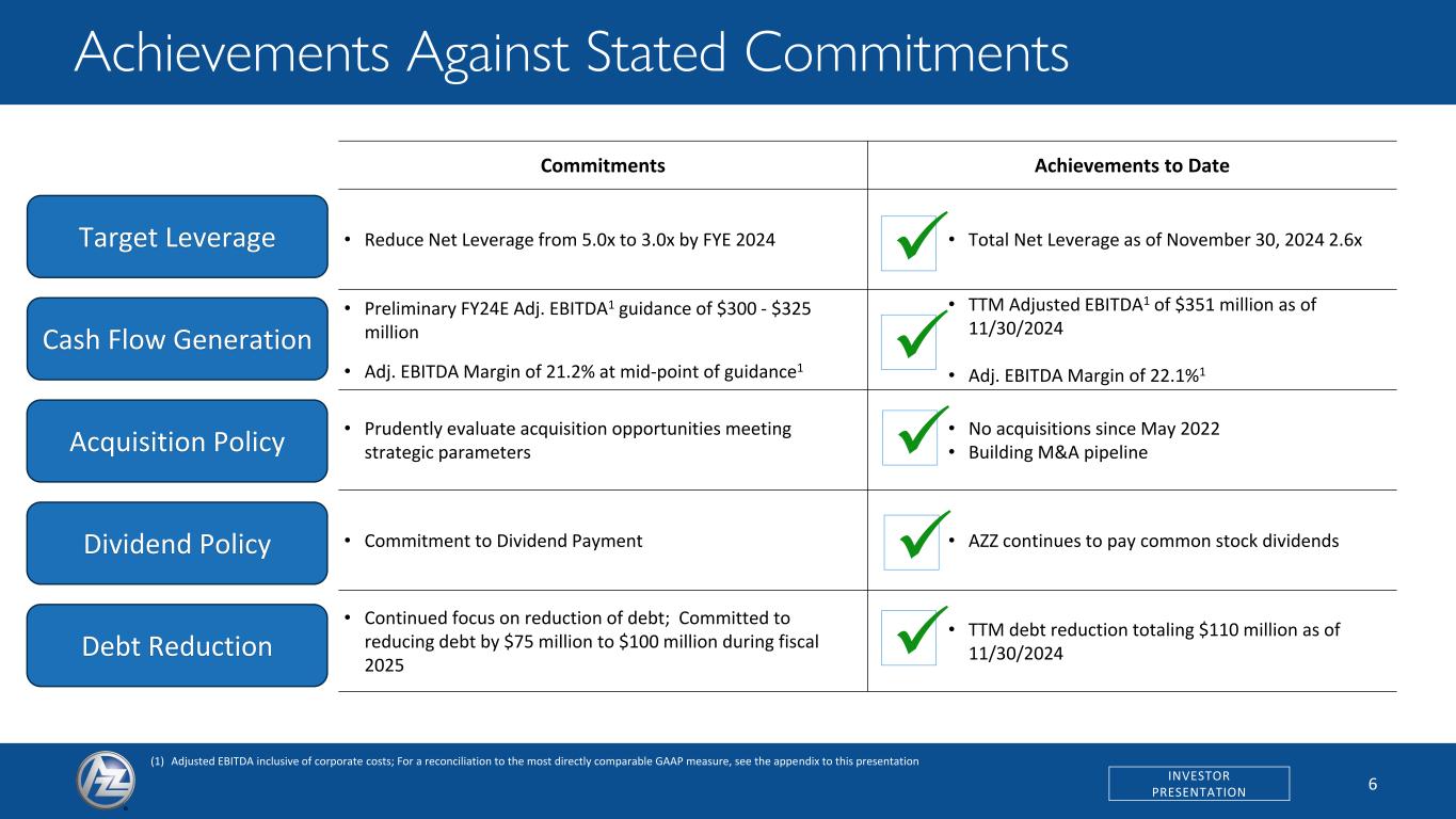 5 INVESTOR PRESENTATION AZZ’s Strategic Journey 2 2013-2018 Optimized Legacy Footprint • Improved capabilities and profitability of Metal Coatings • Combined Electrical and Industrial assets into one operating segment (infrastructure Solutions) 2019-2022 Strategic Transformation – Positioning for the Future • Divested nuclear and labor augmentation related businesses • Divested majority stake (60%) of non-core Infrastructure Solutions segment to a joint venture • Acquired Precoat Metals • Returned $79 million to shareholders through stock repurchases FY2021-FY2022 • Reduced leverage from 4.2X to 3.5X 2023 -2024 Focused Metal Coatings Company • Invested in our future - New aluminum coil coating facility; on-budget and on–track for full production in FY 2026 • Drove operational excellence with ESG focus • Expanded use of customer-centric and digital technology (DGS, Coil Mart, Coil Zone) • Reduced debt while improving the cost of capital • Identified and pursued customer facing synergies • Attain target leverage of 2.5X-3.0X $571 $810 $903 $1,538 Sales, in millions Strengthen the Core; Invest in the Future • Commitment to continuous process improvement initiatives across the segments • Capture opportunities associated with long- term growth drivers in end markets to sustain >GDP level growth • Invest in technologies to maintain competitiveness • Pursue strategic acquisitions as well as bolt- on opportunities to support growth • Maintain emphasis on Sustainability initiatives • Ensure capital is deployed to highest ROIC opportunities while maintaining a safe operating environment 2025 -2028 $2,0001 (1) Based on management estimates as of 10/30/2024.