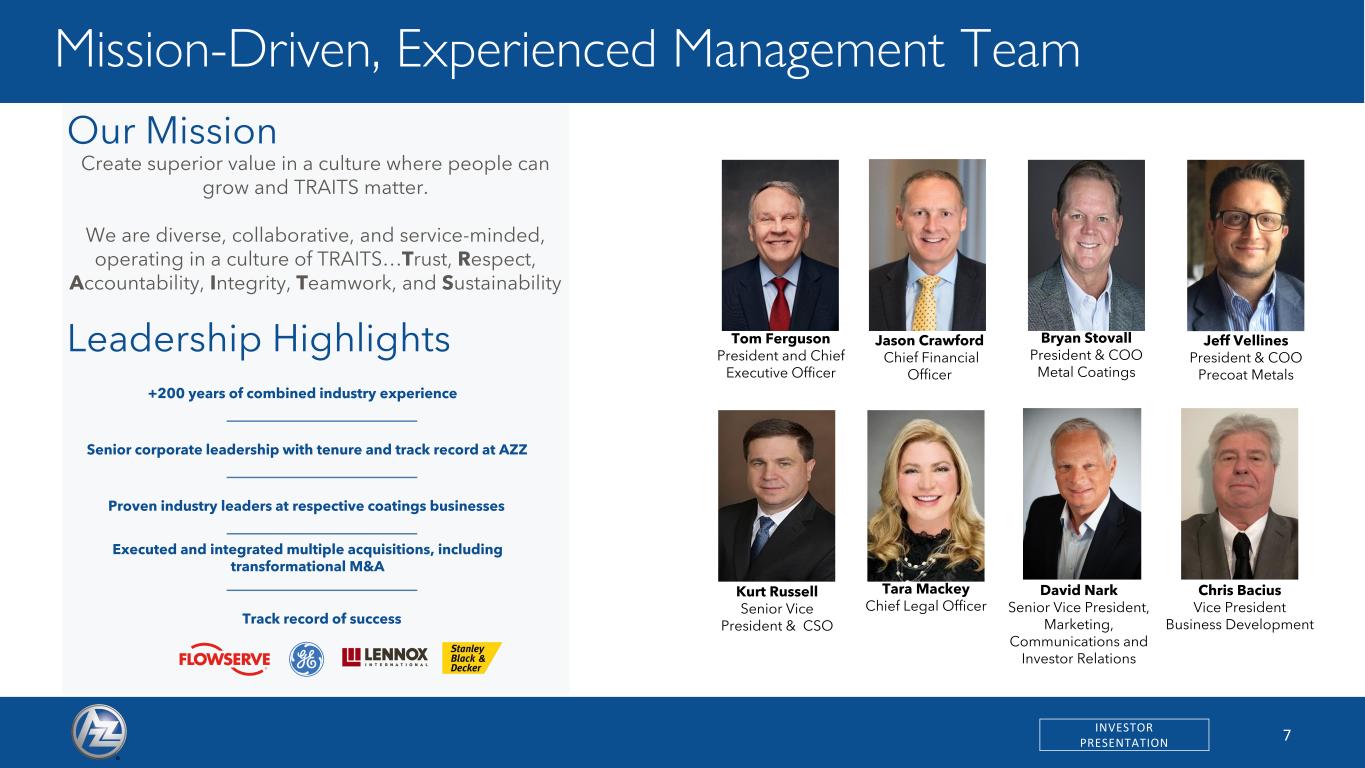 6 INVESTOR PRESENTATION Achievements Against Stated Commitments 2 ✓ Commitments Achievements to Date • Reduce Net Leverage from 5.0x to 3.0x by FYE 2024 • Total Net Leverage as of November 30, 2024 2.6x • Preliminary FY24E Adj. EBITDA1 guidance of $300 - $325 million • Adj. EBITDA Margin of 21.2% at mid-point of guidance1 • TTM Adjusted EBITDA1 of $351 million as of 11/30/2024 • Adj. EBITDA Margin of 22.1%1 • Prudently evaluate acquisition opportunities meeting strategic parameters • No acquisitions since May 2022 • Building M&A pipeline • Commitment to Dividend Payment • AZZ continues to pay common stock dividends • Continued focus on reduction of debt; Committed to reducing debt by $75 million to $100 million during fiscal 2025 • TTM debt reduction totaling $110 million as of 11/30/2024 Target Leverage Cash Flow Generation Acquisition Policy Dividend Policy Debt Reduction ✓ ✓ ✓ ✓ (1) Adjusted EBITDA inclusive of corporate costs; For a reconciliation to the most directly comparable GAAP measure, see the appendix to this presentation