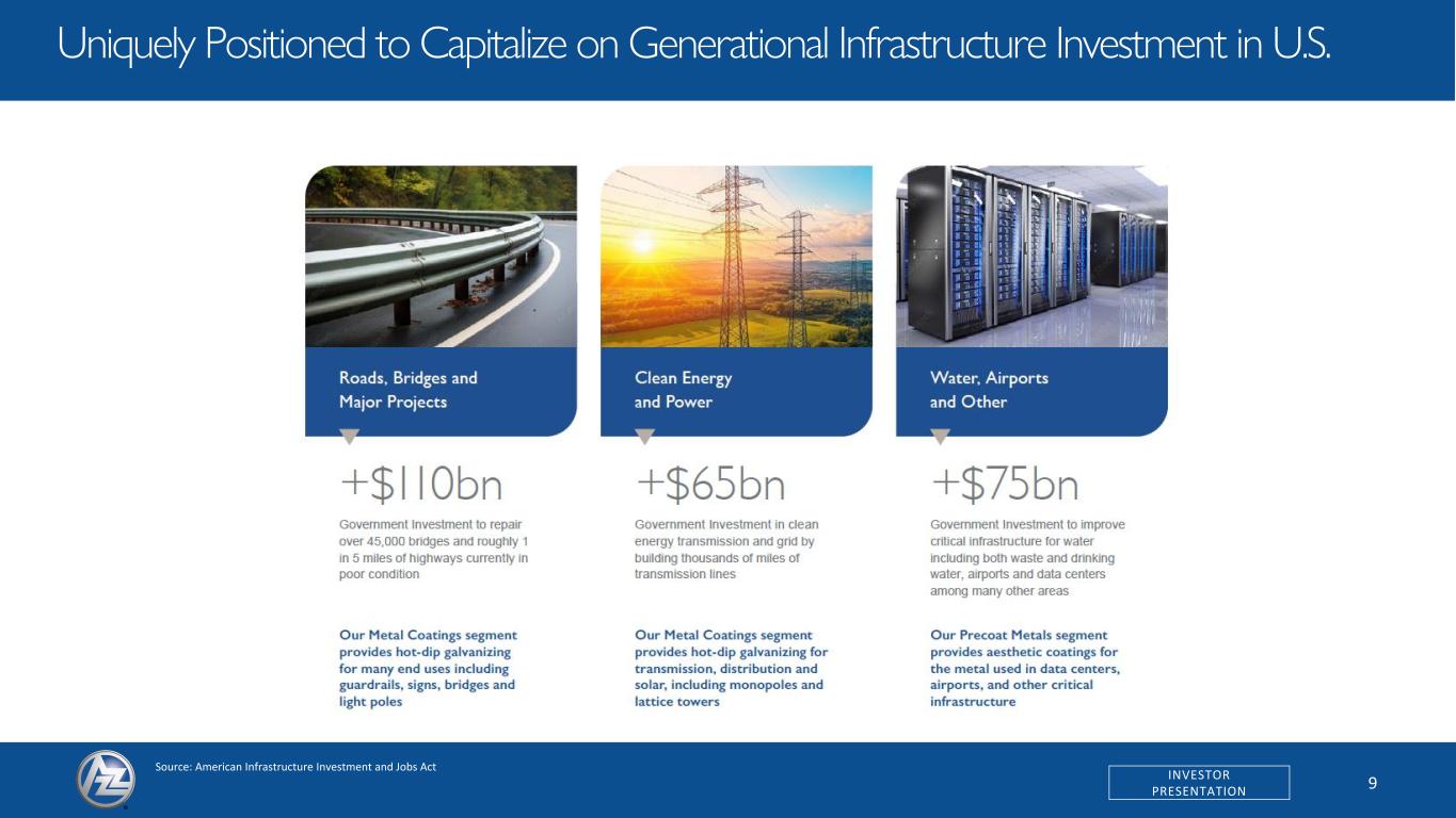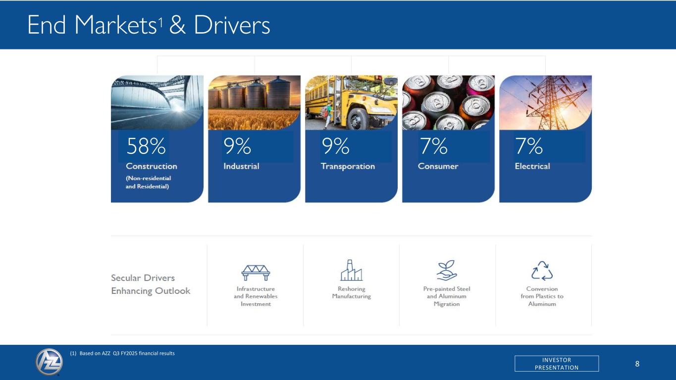 8 INVESTOR PRESENTATION 8 End Markets1 & Drivers 58% 9% 9% 7% 7% (1) Based on AZZ Q3 FY2025 financial results