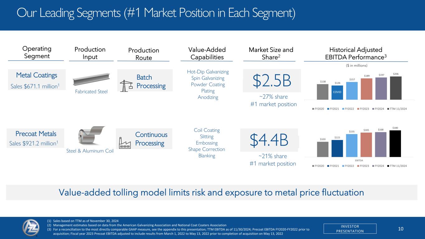 10 INVESTOR PRESENTATION Operating Segment Production Route Value-Added Capabilities Market Size and Share2 Historical Adjusted EBITDA Performance3 ($ in millions) Metal Coatings Precoat Metals Batch Processing Continuous Processing Hot-Dip Galvanizing Spin Galvanizing Powder Coating Plating Anodizing Coil Coating Slitting Embossing Shape Correction Blanking $2.5B $4.4B ~27% share #1 market position ~21% share #1 market position $138 $126 $157 $189 $197 $206 FY2020 FY2021 FY2022 FY2023 FY2024 TTM 11/2024 $103 $115 $155 $165 $168 $180 EBITDA FY2020 FY2021 FY2022 FY2023 FY2024 TTM 11/2024 Production Input Fabricated Steel Steel & Aluminum Coil Sales $671.1 million1 Sales $921.2 million1 (1) Sales based on TTM as of November 30, 2024 (2) Management estimates based on data from the American Galvanizing Association and National Coat Coaters Association (3) For a reconciliation to the most directly comparable GAAP measure, see the appendix to this presentation; TTM EBITDA as of 11/30/2024; Precoat EBITDA FY2020-FY2022 prior to acquisition; Fiscal year 2023 Precoat EBITDA adjusted to include results from March 1, 2022 to May 13, 2022 prior to completion of acquisition on May 13, 2022 Value-added tolling model limits risk and exposure to metal price fluctuation COVID Our Leading Segments (#1 Market Position in Each Segment)