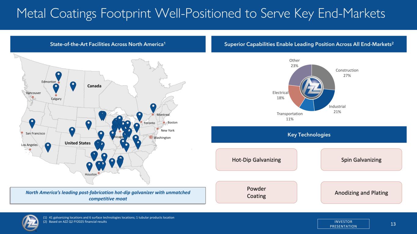 12 INVESTOR PRESENTATION Technology: Digital Galvanizing System (DGS) provides customers with near real-time updates and operational efficiencies Metal Coatings Value Proposition Key Value Propositions ✓ Embracing Complexity: Quick turns on special projects to meet demanding customer schedules✓ Value-Added Services: Over 30+ solutions offerings, including surface preparation, ground line coating and a dedicated transportation network✓ Operational Flexibility: Unmatched solutions offering validated through best-in-class Net Promoter Score ✓ Cost, Efficiency and Environmental Benefits: Galvanizing can last between 50-100 years and is then 100% recyclable thereafter✓ Expanded Footprint and Redundancy: Scaled network ensures proximity and logistical cost advantages across the supply chain✓