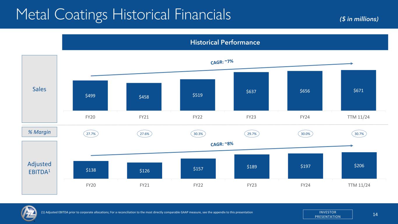 13 INVESTOR PRESENTATION Metal Coatings Footprint Well-Positioned to Serve Key End-Markets Superior Capabilities Enable Leading Position Across All End-Markets2 North America’s leading post-fabrication hot-dip galvanizer with unmatched competitive moat Spin GalvanizingHot-Dip Galvanizing Powder Coating Anodizing and Plating State-of-the-Art Facilities Across North America1 Construction 27% Industrial 21%Transportation 11% Electrical 18% Other 23% Key Technologies (1) 41 galvanizing locations and 6 surface technologies locations; 1 tubular products location (2) Based on AZZ Q2 FY2025 financial results 10