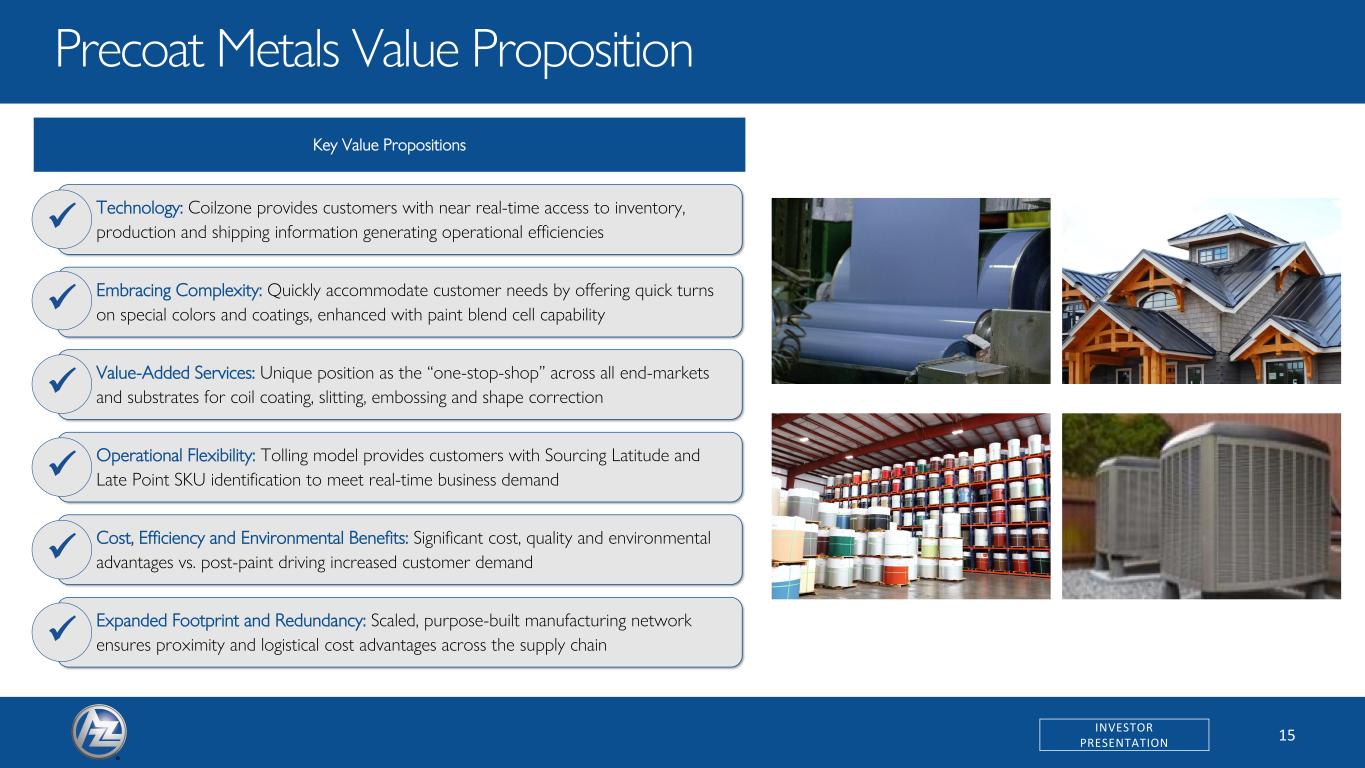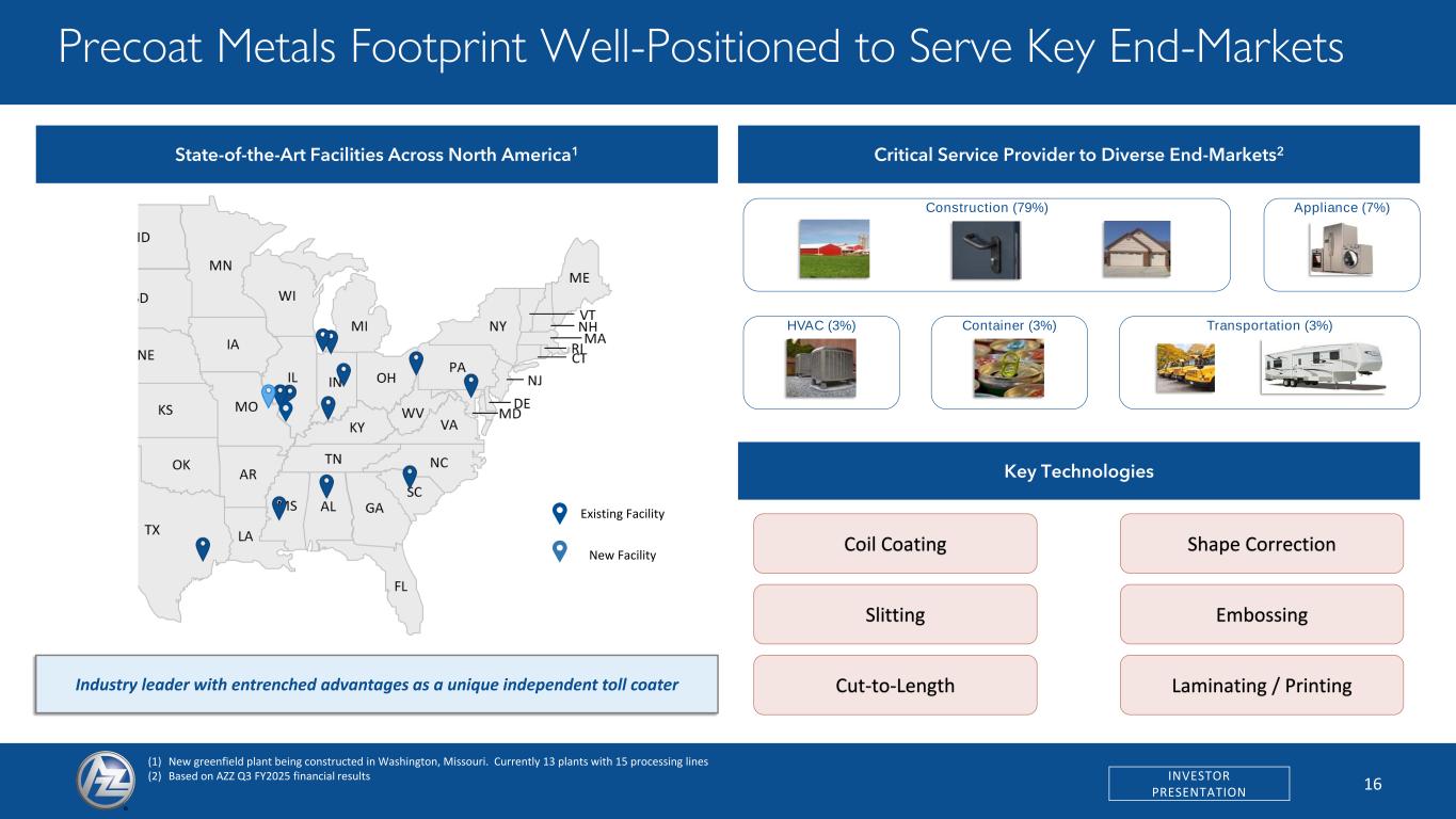15 INVESTOR PRESENTATION Precoat Metals Value Proposition Key Value Propositions Technology: Coilzone provides customers with near real-time access to inventory, production and shipping information generating operational efficiencies ✓ Embracing Complexity: Quickly accommodate customer needs by offering quick turns on special colors and coatings, enhanced with paint blend cell capability✓ Value-Added Services: Unique position as the “one-stop-shop” across all end-markets and substrates for coil coating, slitting, embossing and shape correction✓ Operational Flexibility: Tolling model provides customers with Sourcing Latitude and Late Point SKU identification to meet real-time business demand✓ Cost, Efficiency and Environmental Benefits: Significant cost, quality and environmental advantages vs. post-paint driving increased customer demand✓ Expanded Footprint and Redundancy: Scaled, purpose-built manufacturing network ensures proximity and logistical cost advantages across the supply chain✓