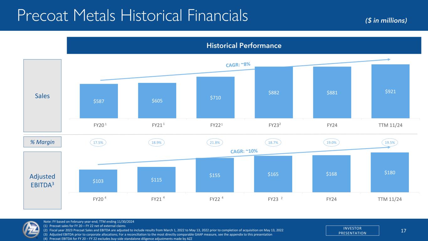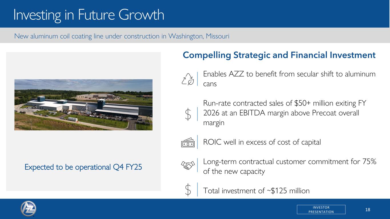17 INVESTOR PRESENTATION Precoat Metals Historical Financials $587 $605 $710 $882 $881 $921 FY20 FY21 FY22 FY23 FY24 TTM 11/24 $103 $115 $155 $165 $168 $180 17.5% 18.9% 21.8% 18.7% 19.0% 19.5% FY20 FY21 FY22 FY23 FY24 TTM 11/24 Sales Adjusted EBITDA3 ($ in millions) Historical Performance 13 % Margin Note: FY based on February year-end; TTM ending 11/30/2024 (1) Precoat sales for FY 20 – FY 22 net of external claims (2) Fiscal year 2023 Precoat Sales and EBITDA are adjusted to include results from March 1, 2022 to May 13, 2022 prior to completion of acquisition on May 13, 2022 (3) Adjusted EBITDA prior to corporate allocations; For a reconciliation to the most directly comparable GAAP measure, see the appendix to this presentation (4) Precoat EBITDA for FY 20 – FY 22 excludes buy-side standalone diligence adjustments made by AZZ 2 2 1 1 1 4 4 4