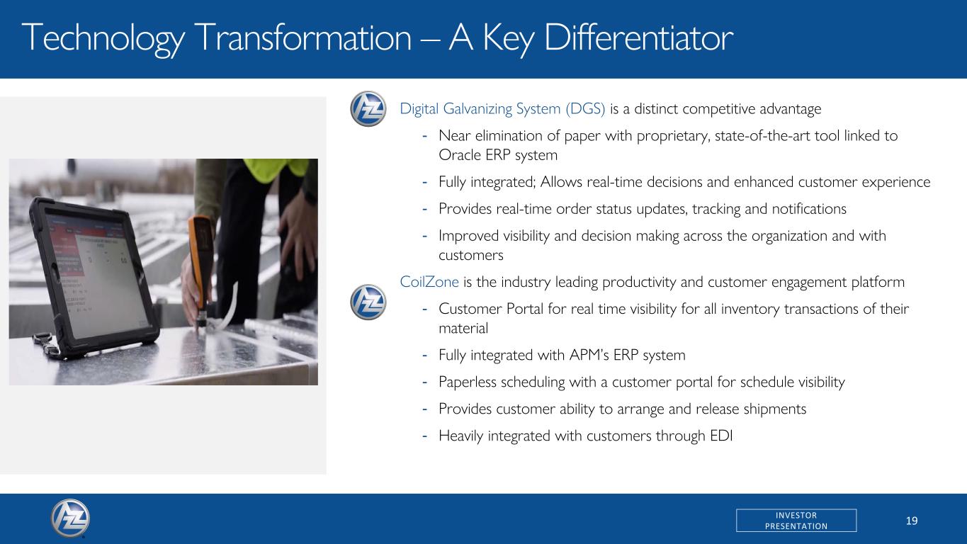 19 INVESTOR PRESENTATION Digital Galvanizing System (DGS) is a distinct competitive advantage - Near elimination of paper with proprietary, state-of-the-art tool linked to Oracle ERP system - Fully integrated; Allows real-time decisions and enhanced customer experience - Provides real-time order status updates, tracking and notifications - Improved visibility and decision making across the organization and with customers CoilZone is the industry leading productivity and customer engagement platform - Customer Portal for real time visibility for all inventory transactions of their material - Fully integrated with APM’s ERP system - Paperless scheduling with a customer portal for schedule visibility - Provides customer ability to arrange and release shipments - Heavily integrated with customers through EDI Technology Transformation – A Key Differentiator
