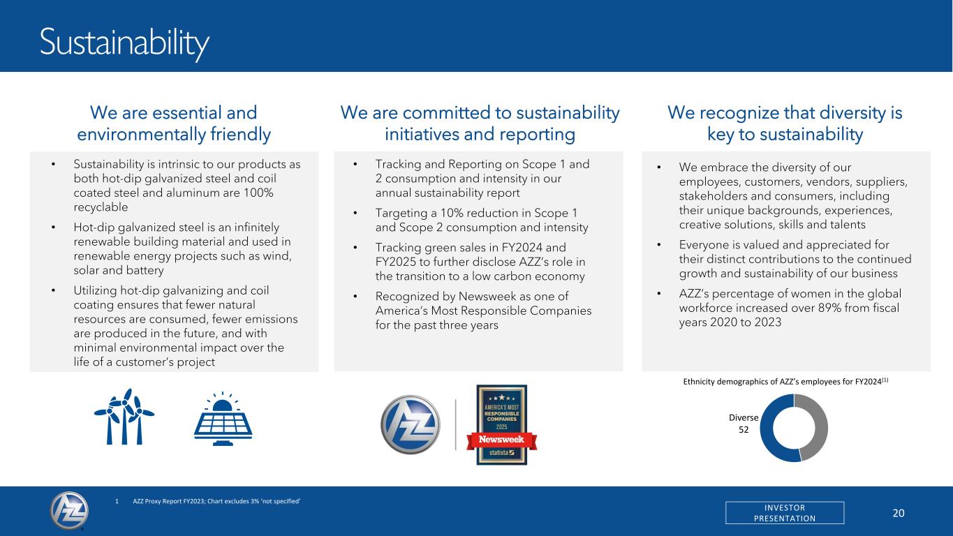 20 INVESTOR PRESENTATION 20 Investing in Future Growth Sustai ability • Sustainability is intrinsic to our products as both hot-dip galvanized steel and coil coated steel and aluminum are 100% recyclable • Hot-dip galvanized steel is an infinitely renewable building material and used in renewable energy projects such as wind, solar and battery • Utilizing hot-dip galvanizing and coil coating ensures that fewer natural resources are consumed, fewer emissions are produced in the future, and with minimal environmental impact over the life of a customer’s project Diverse 52 We are essential and environmentally friendly We are committed to sustainability initiatives and reporting We recognize that diversity is key to sustainability • Tracking and Reporting on Scope 1 and 2 consumption and intensity in our annual sustainability report • Targeting a 10% reduction in Scope 1 and Scope 2 consumption and intensity • Tracking green sales in FY2024 and FY2025 to further disclose AZZ’s role in the transition to a low carbon economy • Recognized by Newsweek as one of America’s Most Responsible Companies for the past three years • We embrace the diversity of our employees, customers, vendors, suppliers, stakeholders and consumers, including their unique backgrounds, experiences, creative solutions, skills and talents • Everyone is valued and appreciated for their distinct contributions to the continued growth and sustainability of our business • AZZ’s percentage of women in the global workforce increased over 89% from fiscal years 2020 to 2023 Ethnicity demographics of AZZ’s employees for FY2024(1) 1 AZZ Proxy Report FY2023; Chart excludes 3% ‘not specified’