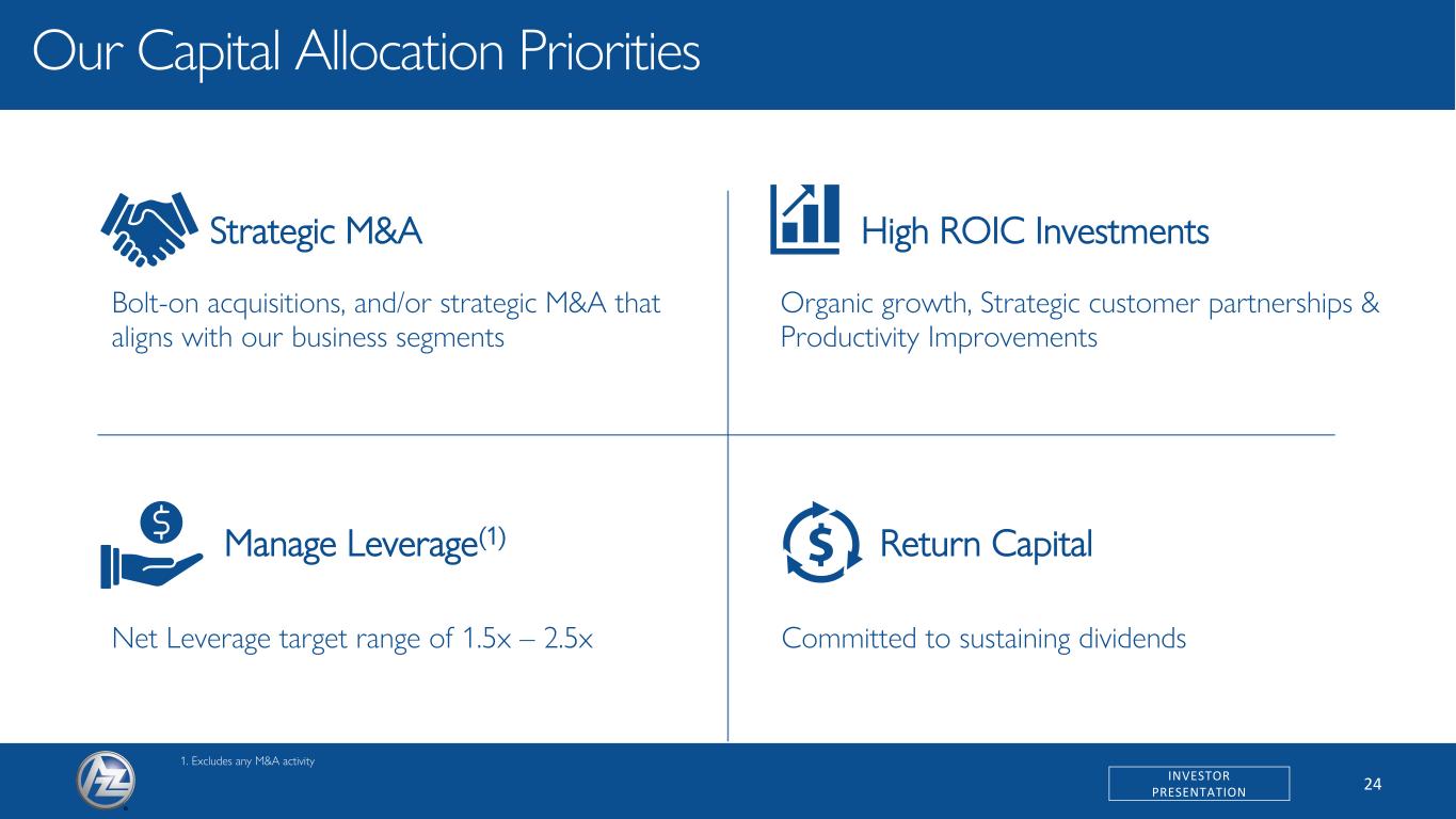 23 INVESTOR PRESENTATION Q2 FY23 Q2 FY24 Impactful Deleveraging Post Transformational Acquisition Net Leverage Since Precoat Metals Acquisition1 Note: Financials exclude AIS in which AZZ divested 60% into a joint venture in September 2022 (1) Reflects net leverage inclusive of credit agreement-related adjustments; Adjusted EBITDA inclusive of corporate costs (2) Free Cash Flow Conversion defined as (CFO – Capex) / Net Income; Free Cash Flow is a non-GAAP financial measure that requires reconciliation to Cash Flow from Operations. Accordingly, Free Cash Flow conversion is a ratio of a non-GAAP financial measure to a GAAP financial measure that requires reconciliation. • Strong free cash flow generation • ~$115M debt reduction in fiscal year 2024 • $80M debt reduction YTD as of Q3 2025 • Fully Redeemed Series A Convertible Preferred Stock in Q1 FY 2025 Net Debt / Adjusted EBITDA (excl. preferred) Net Debt / Adjusted EBITDA (incl. preferred) 16 (1.7x) No significant debt maturities until FY30 Q2FY23 Q3FY25 2.6x 4.3x 3.6x