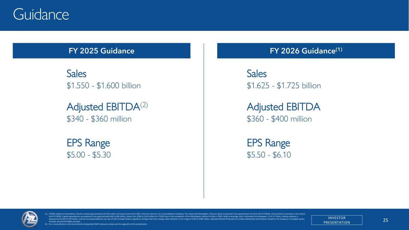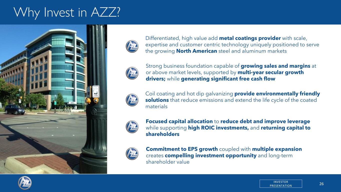 25 INVESTOR PRESENTATION Sales $1.550 - $1.600 billion Guidance Adjusted EBITDA(2) $340 - $360 million EPS Range $5.00 - $5.30 Sales $1.625 - $1.725 billion Adjusted EBITDA $360 - $400 million EPS Range $5.50 - $6.10 FY 2025 Guidance FY 2026 Guidance(1) (1) FY2026 Guidance Assumptions: Results include approximately $15-$18 million of equity income from AZZ’s minority interest in its unconsolidated subsidiary; The newly built Washington, Missouri plant is expected to be operational in the first half of FY2026, and accretive to earnings in the second half of FY2026; Capital expenditures are expected to be approximately $60 to $80 million, down from $100 to $120 million for FY2025 due to the completion of the Washington, Missouri facility in 2025; Debt-to-leverage ratio is estimated to be between 1.5 to 2.5 times, interest expense is expected to be $60 to $70 million, and the annualized effective tax rate of 25% excludes federal regulatory changes that may emerge; Debt reduction in the range of $140 to $180 million; Adjusted Diluted EPS guidance includes adding back amortization related to the Company’s intangible assets; Excludes all potential M&A activities. (2) For a reconciliation to the most directly comparable GAAP measures, please see the appendix to this presentation