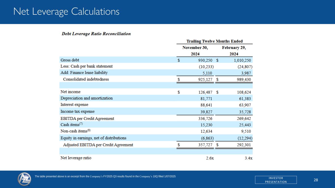 28 INVESTOR PRESENTATION Net Leverage Calculations The table presented above is an excerpt from the Company’s FY2025 Q3 results found in the Company’s 10Q filed 1/07/2025