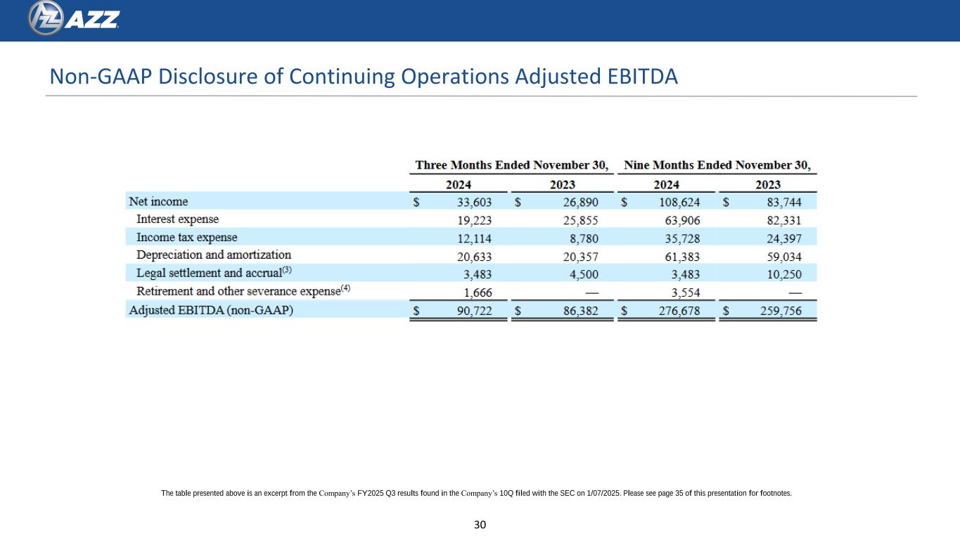 2 INVESTOR PRESENTATION Disclaimers Cautionary Statements Regarding Forward Looking Statements — Certain statements herein about our expectations of future events or results constitute forward-looking statements for purposes of the safe harbor provisions of The Private Securities Litigation Reform Act of 1995. You can identify forward-looking statements by terminology such as "may," "could," "should," "expects," "plans," "will," "might," "would," "projects," "currently," "intends," "outlook," "forecasts," "targets," "anticipates," "believes," "estimates," "predicts," "potential," "continue," or the negative of these terms or other comparable terminology. Such forward-looking statements are based on currently available competitive, financial, and economic data and management’s views and assumptions regarding future events. Such forward-looking statements are inherently uncertain, and investors must recognize that actual results may differ from those expressed or implied in the forward-looking statements. Forward-looking statements speak only as of the date they are made and are subject to risks that could cause them to differ materially from actual results. Certain factors could affect the outcome of the matters described herein. This presentation may contain forward-looking statements that involve risks and uncertainties including, but not limited to, changes in customer demand for our manufactured solutions, including demand by the construction markets, the industrial markets, and the metal coatings markets. We could also experience additional increases in labor costs, components and raw materials including zinc and natural gas, which are used in our hot-dip galvanizing process, paint used in our coil coating process; supply-chain vendor delays; customer requested delays of our manufactured solutions; delays in additional acquisition opportunities; an increase in our debt leverage and/or interest rates on our debt, of which a significant portion is tied to variable interest rates; availability of experienced management and employees to implement AZZ’s growth strategy; a downturn in market conditions in any industry relating to the manufactured solutions that we provide; economic volatility, including a prolonged economic downturn or macroeconomic conditions such as inflation or changes in the political stability in the United States and other foreign markets in which we operate; acts of war or terrorism inside the United States or abroad; and other changes in economic and financial conditions. AZZ has provided additional information regarding risks associated with the business, including in Part I, Item 1A. Risk Factors, in AZZ's Annual Report on Form 10-K for the fiscal year ended February 29, 2024, and other filings with the SEC, available for viewing on AZZ's website at www.azz.com and on the SEC's website at www.sec.gov. You are urged to consider these factors carefully when evaluating the forward-looking statements herein and are cautioned not to place undue reliance on such forward-looking statements, which are qualified in their entirety by this cautionary statement. These statements are based on information as of the date hereof and AZZ assumes no obligation to update any forward-looking statements, whether as a result of new information, future events, or otherwise. Non-GAAP – Regulation G Disclosures — In addition to reporting financial results in accordance with Generally Accepted Accounting Principles in the United States ("GAAP"), AZZ has provided EBITDA, Adjusted EBITDA, Net Debt, Net Leverage, Free Cash Flow and Free Cash Flow Conversion which are non-GAAP measures, which should be considered supplemental to, not a substitute for, or superior to, the financial measures calculated in accordance with GAAP. Management believes that the presentation of these measures provides investors with a greater transparency comparison of operating results across a broad spectrum of companies, which provides a more complete understanding of AZZ’s financial performance, competitive position and prospects for the future. Management also believes that investors regularly rely on non-GAAP financial measures, such as EBITDA and Adjusted EBITDA, to assess operating performance and that such measures may highlight trends in the Company’s business that may not otherwise be apparent when relying on financial measures calculated in accordance with GAAP. There are a number of limitations related to the use of these non-GAAP financial measures and their nearest GAAP equivalents. For example, AZZ's definitions of non-GAAP financial measures may differ from non-GAAP financial measures used by other companies. For reconciliations to the most directly comparable GAAP measure, see the appendix to this presentation.