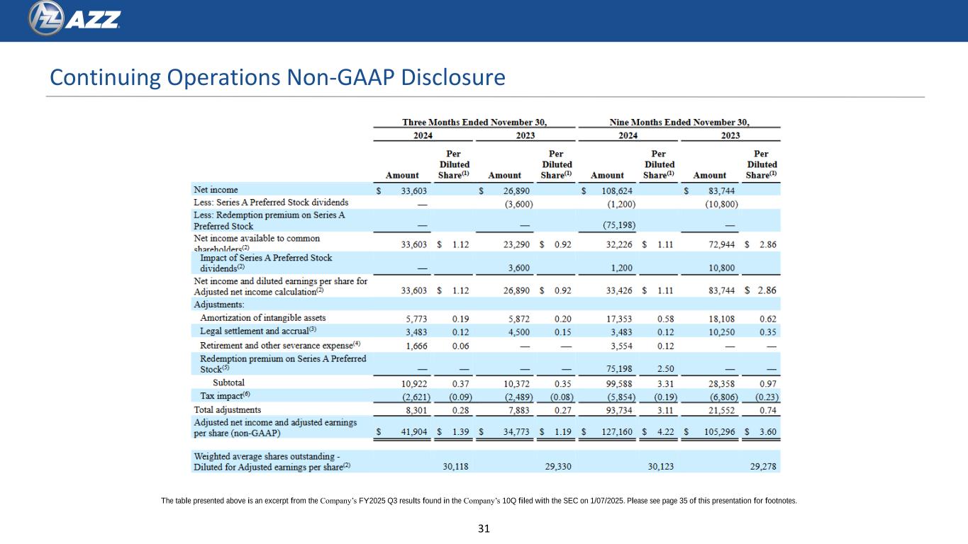 Non-GAAP Disclosure of Continuing Operations Adjusted EBITDA 30 The table presented above is an excerpt from the Company’s FY2025 Q3 results found in the Company’s 10Q filed with the SEC on 1/07/2025. Please see page 35 of this presentation for footnotes.