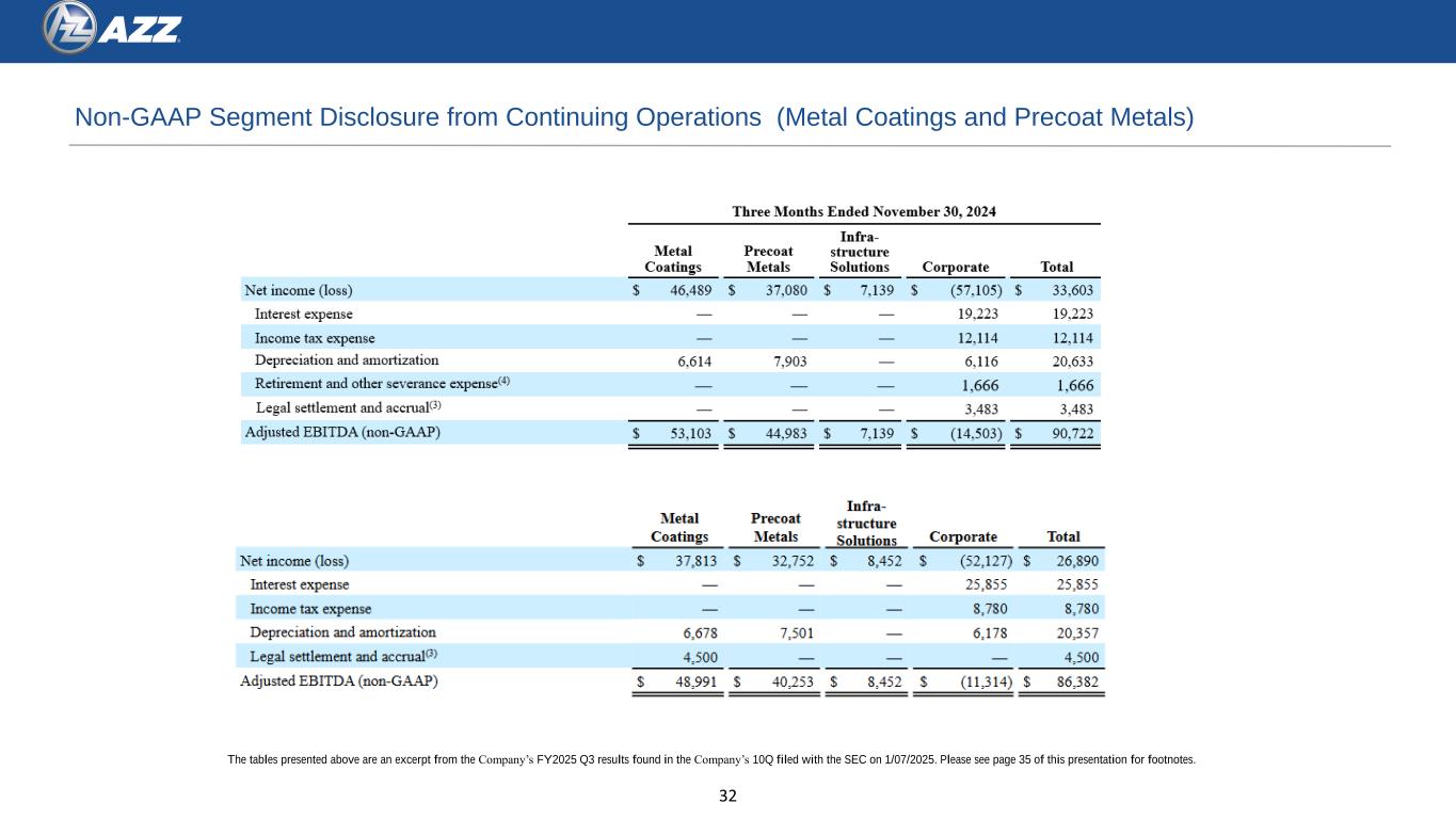 Continuing Operations Non-GAAP Disclosure 31 The table presented above is an excerpt from the Company’s FY2025 Q3 results found in the Company’s 10Q filed with the SEC on 1/07/2025. Please see page 35 of this presentation for footnotes.