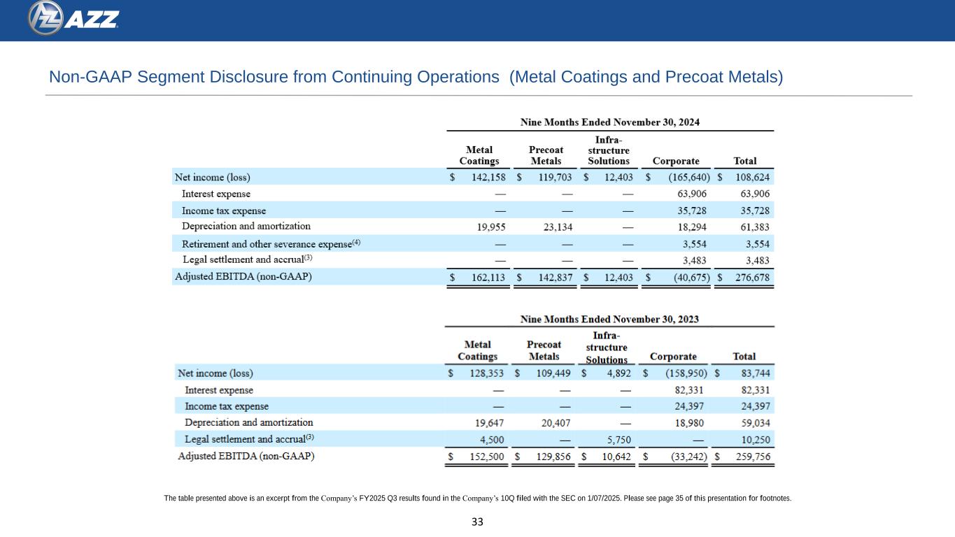 Non-GAAP Segment Disclosure from Continuing Operations (Metal Coatings and Precoat Metals) 32 The tables presented above are an excerpt from the Company’s FY2025 Q3 results found in the Company’s 10Q filed with the SEC on 1/07/2025. Please see page 35 of this presentation for footnotes.