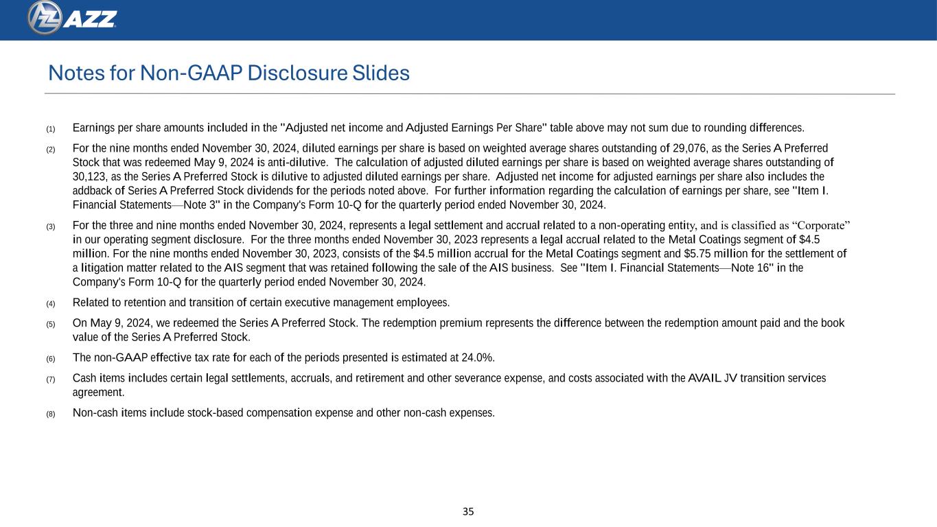 Notes for Non-GAAP Disclosure Slides (1) Earnings per share amounts included in the "Adjusted net income and Adjusted Earnings Per Share" table above may not sum due to rounding differences. (2) For the nine months ended November 30, 2024, diluted earnings per share is based on weighted average shares outstanding of 29,076, as the Series A Preferred Stock that was redeemed May 9, 2024 is anti-dilutive. The calculation of adjusted diluted earnings per share is based on weighted average shares outstanding of 30,123, as the Series A Preferred Stock is dilutive to adjusted diluted earnings per share. Adjusted net income for adjusted earnings per share also includes the addback of Series A Preferred Stock dividends for the periods noted above. For further information regarding the calculation of earnings per share, see "Item I. Financial Statements—Note 3" in the Company's Form 10-Q for the quarterly period ended November 30, 2024. (3) For the three and nine months ended November 30, 2024, represents a legal settlement and accrual related to a non-operating entity, and is classified as “Corporate” in our operating segment disclosure. For the three months ended November 30, 2023 represents a legal accrual related to the Metal Coatings segment of $4.5 million. For the nine months ended November 30, 2023, consists of the $4.5 million accrual for the Metal Coatings segment and $5.75 million for the settlement of a litigation matter related to the AIS segment that was retained following the sale of the AIS business. See "Item I. Financial Statements—Note 16" in the Company's Form 10-Q for the quarterly period ended November 30, 2024. (4) Related to retention and transition of certain executive management employees. (5) On May 9, 2024, we redeemed the Series A Preferred Stock. The redemption premium represents the difference between the redemption amount paid and the book value of the Series A Preferred Stock. (6) The non-GAAP effective tax rate for each of the periods presented is estimated at 24.0%. (7) Cash items includes certain legal settlements, accruals, and retirement and other severance expense, and costs associated with the AVAIL JV transition services agreement. (8) Non-cash items include stock-based compensation expense and other non-cash expenses. 35