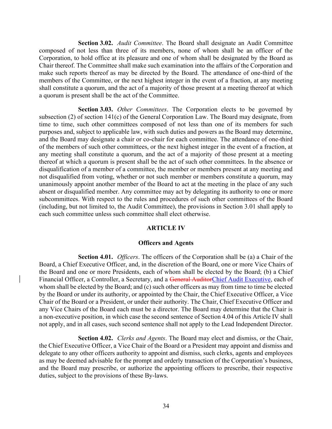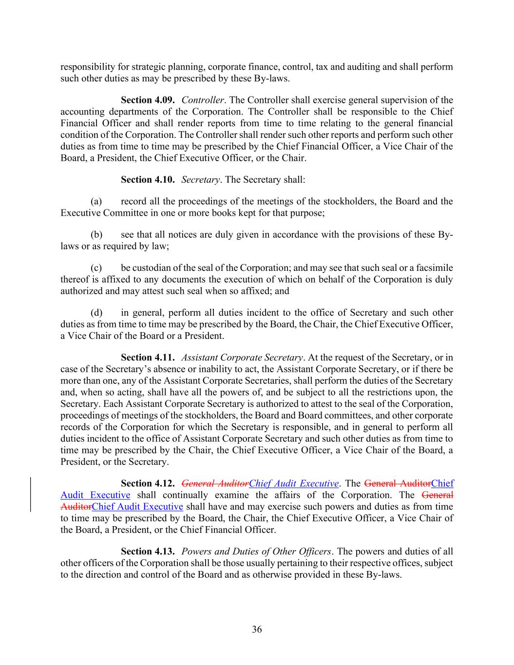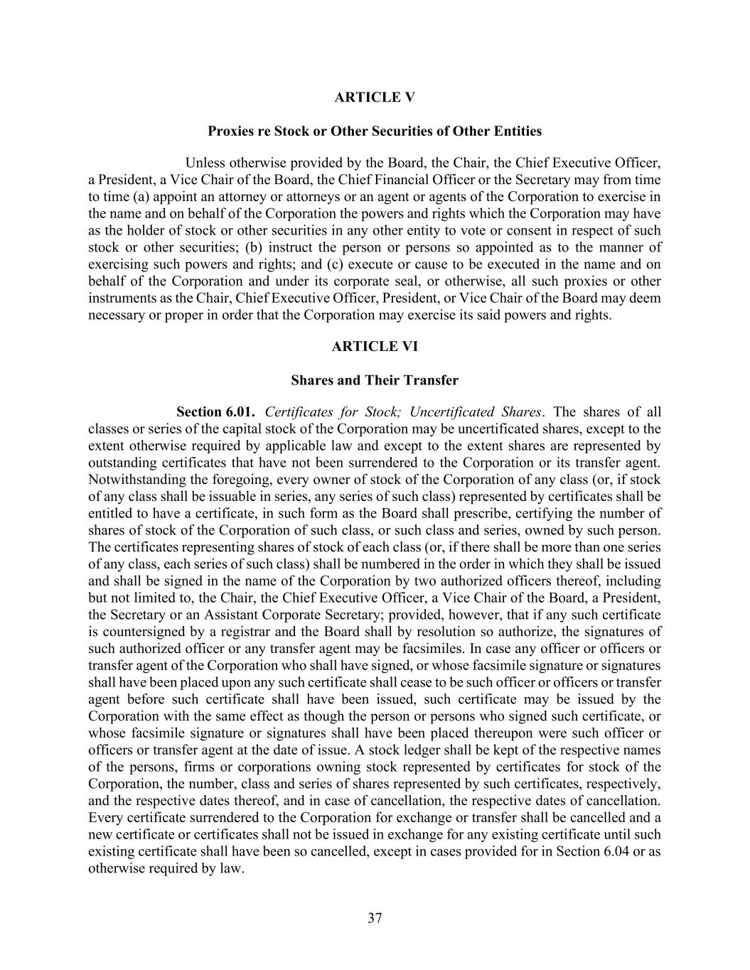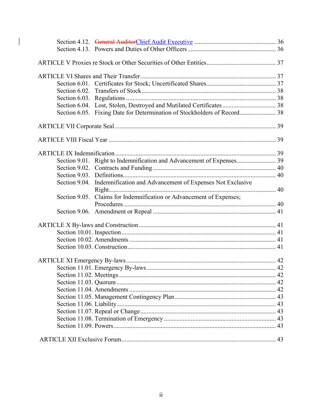 ii Section 4.12. General AuditorChief Audit Executive .................................................... 36 Section 4.13. Powers and Duties of Other Officers ........................................................ 36 ARTICLE V Proxies re Stock or Other Securities of Other Entities ............................................ 37 ARTICLE VI Shares and Their Transfer ...................................................................................... 37 Section 6.01. Certificates for Stock; Uncertificated Shares ............................................ 37 Section 6.02. Transfers of Stock ..................................................................................... 38 Section 6.03. Regulations ............................................................................................... 38 Section 6.04. Lost, Stolen, Destroyed and Mutilated Certificates .................................. 38 Section 6.05. Fixing Date for Determination of Stockholders of Record ....................... 38 ARTICLE VII Corporate Seal ...................................................................................................... 39 ARTICLE VIII Fiscal Year .......................................................................................................... 39 ARTICLE IX Indemnification ...................................................................................................... 39 Section 9.01. Right to Indemnification and Advancement of Expenses......................... 39 Section 9.02. Contracts and Funding .............................................................................. 40 Section 9.03. Definitions................................................................................................. 40 Section 9.04. Indemnification and Advancement of Expenses Not Exclusive Right .......................................................................................................... 40 Section 9.05. Claims for Indemnification or Advancement of Expenses; Procedures ................................................................................................. 40 Section 9.06. Amendment or Repeal .............................................................................. 41 ARTICLE X By-laws and Construction ....................................................................................... 41 Section 10.01. Inspection .................................................................................................. 41 Section 10.02. Amendments ............................................................................................. 41 Section 10.03. Construction .............................................................................................. 41 ARTICLE XI Emergency By-laws ............................................................................................... 42 Section 11.01. Emergency By-laws .................................................................................. 42 Section 11.02. Meetings .................................................................................................... 42 Section 11.03. Quorum ..................................................................................................... 42 Section 11.04. Amendments ............................................................................................. 42 Section 11.05. Management Contingency Plan ................................................................ 43 Section 11.06. Liability ..................................................................................................... 43 Section 11.07. Repeal or Change ...................................................................................... 43 Section 11.08. Termination of Emergency ....................................................................... 43 Section 11.09. Powers ....................................................................................................... 43 ARTICLE XII Exclusive Forum .................................................................................................. 43
