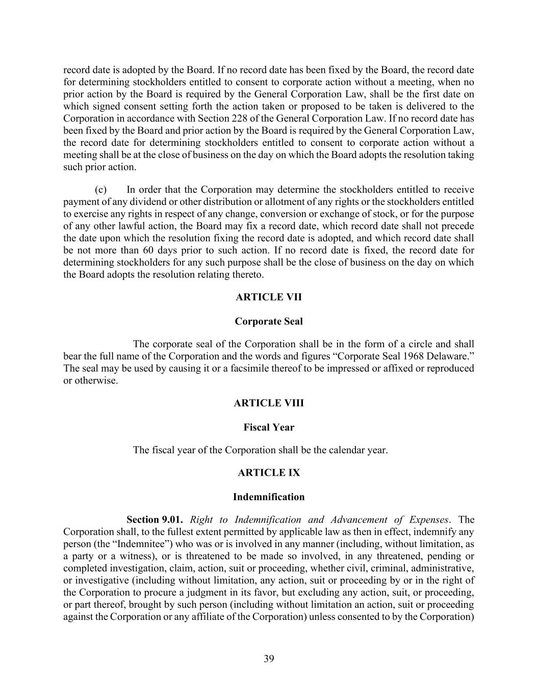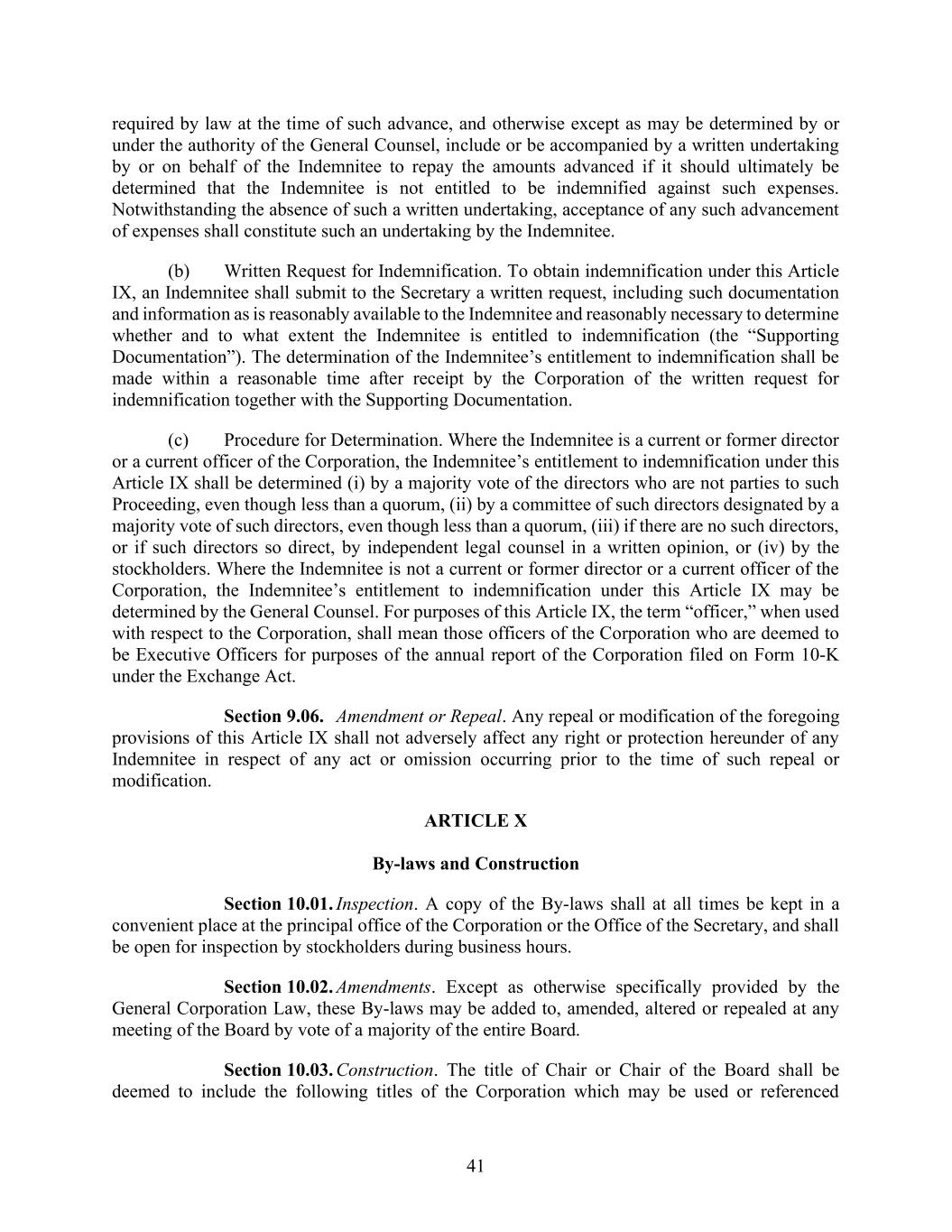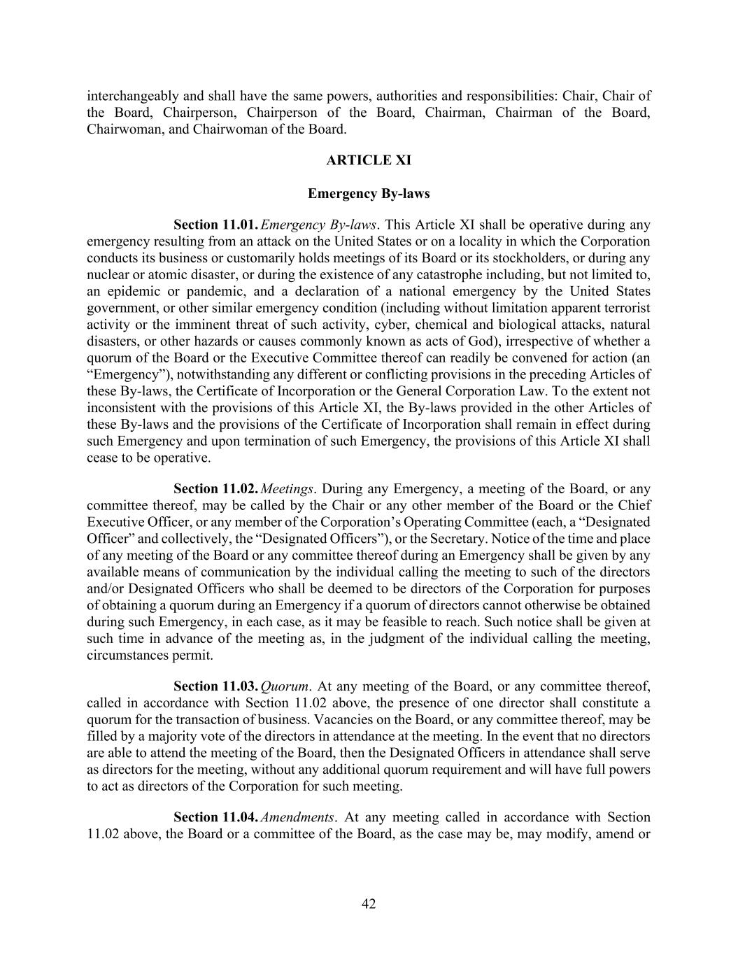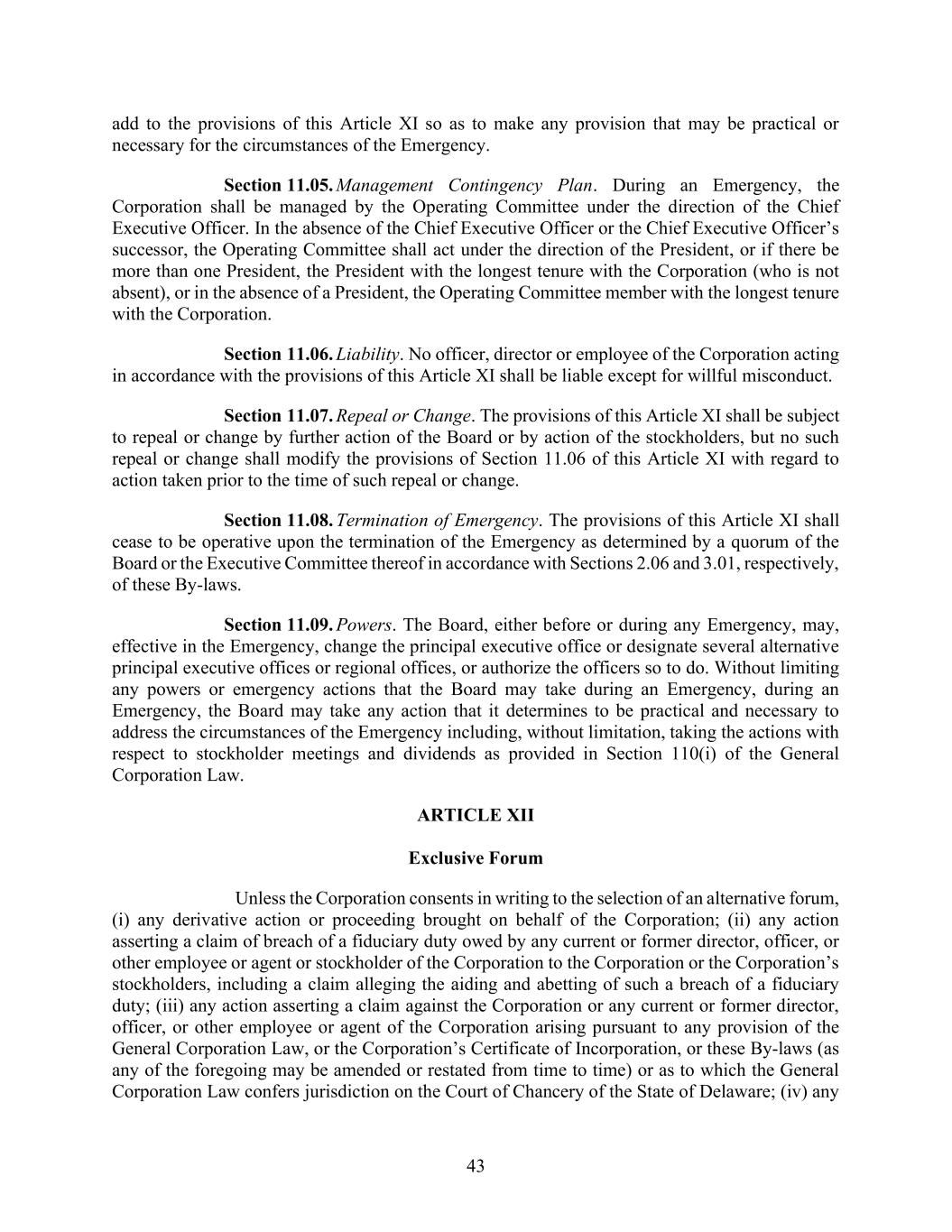 ii Section 4.12. General AuditorChief Audit Executive .................................................... 36 Section 4.13. Powers and Duties of Other Officers ........................................................ 36 ARTICLE V Proxies re Stock or Other Securities of Other Entities ............................................ 37 ARTICLE VI Shares and Their Transfer ...................................................................................... 37 Section 6.01. Certificates for Stock; Uncertificated Shares ............................................ 37 Section 6.02. Transfers of Stock ..................................................................................... 38 Section 6.03. Regulations ............................................................................................... 38 Section 6.04. Lost, Stolen, Destroyed and Mutilated Certificates .................................. 38 Section 6.05. Fixing Date for Determination of Stockholders of Record ....................... 38 ARTICLE VII Corporate Seal ...................................................................................................... 39 ARTICLE VIII Fiscal Year .......................................................................................................... 39 ARTICLE IX Indemnification ...................................................................................................... 39 Section 9.01. Right to Indemnification and Advancement of Expenses......................... 39 Section 9.02. Contracts and Funding .............................................................................. 40 Section 9.03. Definitions................................................................................................. 40 Section 9.04. Indemnification and Advancement of Expenses Not Exclusive Right .......................................................................................................... 40 Section 9.05. Claims for Indemnification or Advancement of Expenses; Procedures ................................................................................................. 40 Section 9.06. Amendment or Repeal .............................................................................. 41 ARTICLE X By-laws and Construction ....................................................................................... 41 Section 10.01. Inspection .................................................................................................. 41 Section 10.02. Amendments ............................................................................................. 41 Section 10.03. Construction .............................................................................................. 41 ARTICLE XI Emergency By-laws ............................................................................................... 42 Section 11.01. Emergency By-laws .................................................................................. 42 Section 11.02. Meetings .................................................................................................... 42 Section 11.03. Quorum ..................................................................................................... 42 Section 11.04. Amendments ............................................................................................. 42 Section 11.05. Management Contingency Plan ................................................................ 43 Section 11.06. Liability ..................................................................................................... 43 Section 11.07. Repeal or Change ...................................................................................... 43 Section 11.08. Termination of Emergency ....................................................................... 43 Section 11.09. Powers ....................................................................................................... 43 ARTICLE XII Exclusive Forum .................................................................................................. 43