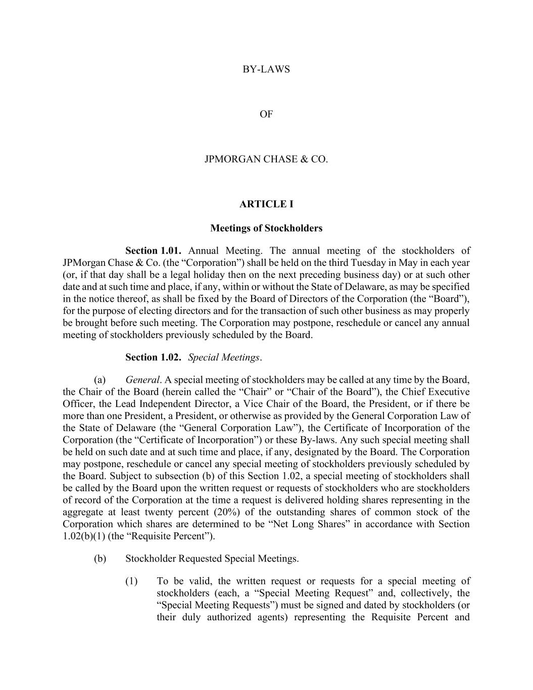BY-LAWS OF JPMORGAN CHASE & CO. ARTICLE I Meetings of Stockholders Section 1.01. Annual Meeting. The annual meeting of the stockholders of JPMorgan Chase & Co. (the “Corporation”) shall be held on the third Tuesday in May in each year (or, if that day shall be a legal holiday then on the next preceding business day) or at such other date and at such time and place, if any, within or without the State of Delaware, as may be specified in the notice thereof, as shall be fixed by the Board of Directors of the Corporation (the “Board”), for the purpose of electing directors and for the transaction of such other business as may properly be brought before such meeting. The Corporation may postpone, reschedule or cancel any annual meeting of stockholders previously scheduled by the Board. Section 1.02. Special Meetings. (a) General. A special meeting of stockholders may be called at any time by the Board, the Chair of the Board (herein called the “Chair” or “Chair of the Board”), the Chief Executive Officer, the Lead Independent Director, a Vice Chair of the Board, the President, or if there be more than one President, a President, or otherwise as provided by the General Corporation Law of the State of Delaware (the “General Corporation Law”), the Certificate of Incorporation of the Corporation (the “Certificate of Incorporation”) or these By-laws. Any such special meeting shall be held on such date and at such time and place, if any, designated by the Board. The Corporation may postpone, reschedule or cancel any special meeting of stockholders previously scheduled by the Board. Subject to subsection (b) of this Section 1.02, a special meeting of stockholders shall be called by the Board upon the written request or requests of stockholders who are stockholders of record of the Corporation at the time a request is delivered holding shares representing in the aggregate at least twenty percent (20%) of the outstanding shares of common stock of the Corporation which shares are determined to be “Net Long Shares” in accordance with Section 1.02(b)(1) (the “Requisite Percent”). (b) Stockholder Requested Special Meetings. (1) To be valid, the written request or requests for a special meeting of stockholders (each, a “Special Meeting Request” and, collectively, the “Special Meeting Requests”) must be signed and dated by stockholders (or their duly authorized agents) representing the Requisite Percent and