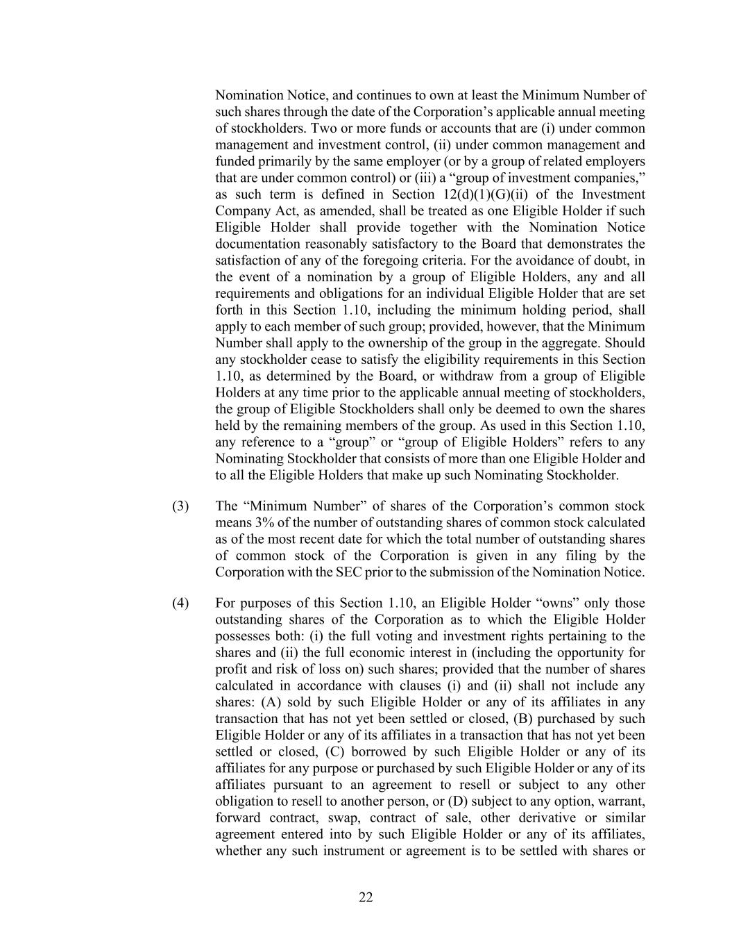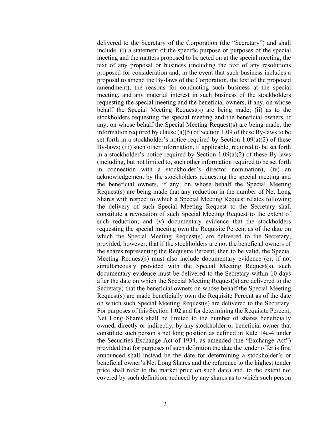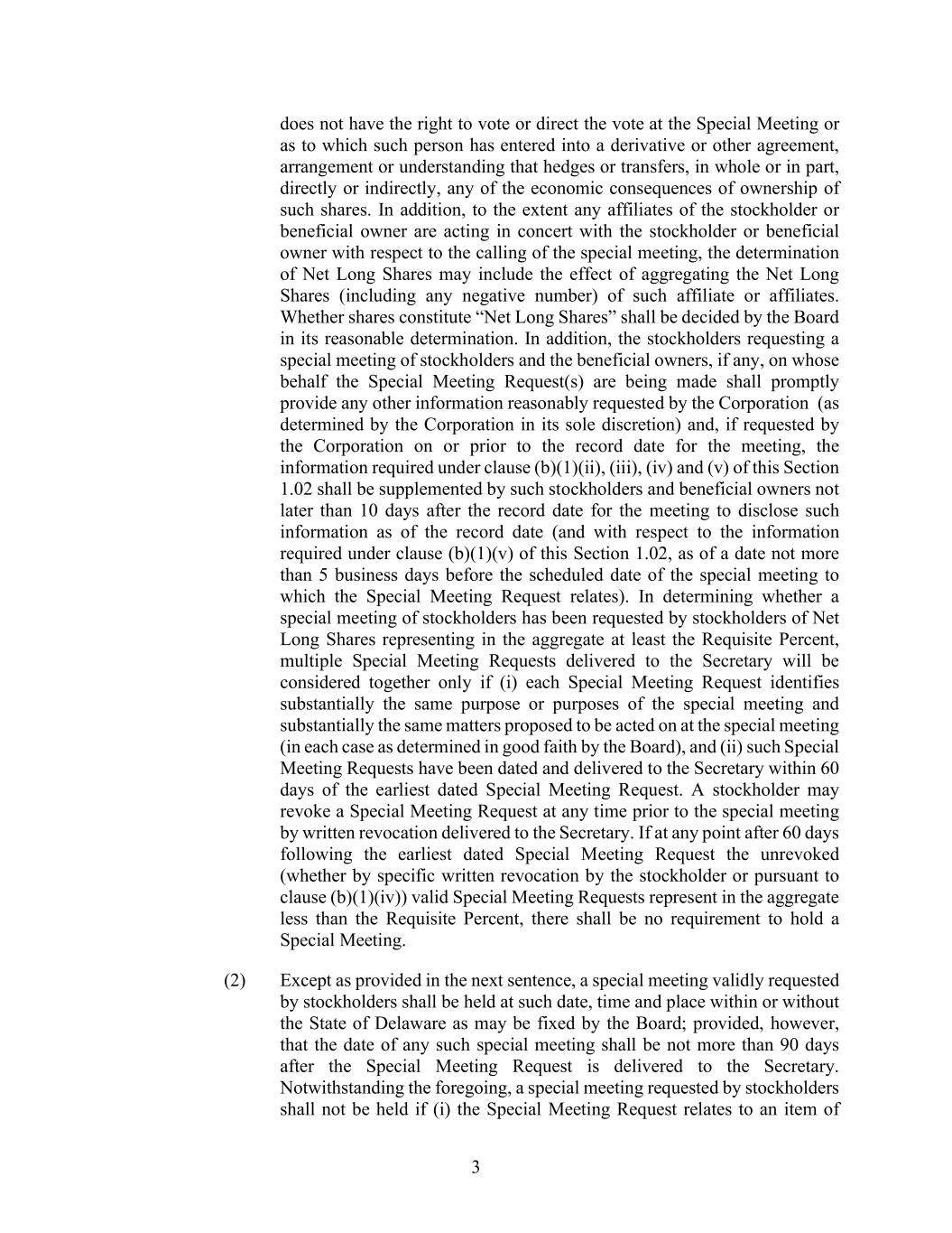 3 does not have the right to vote or direct the vote at the Special Meeting or as to which such person has entered into a derivative or other agreement, arrangement or understanding that hedges or transfers, in whole or in part, directly or indirectly, any of the economic consequences of ownership of such shares. In addition, to the extent any affiliates of the stockholder or beneficial owner are acting in concert with the stockholder or beneficial owner with respect to the calling of the special meeting, the determination of Net Long Shares may include the effect of aggregating the Net Long Shares (including any negative number) of such affiliate or affiliates. Whether shares constitute “Net Long Shares” shall be decided by the Board in its reasonable determination. In addition, the stockholders requesting a special meeting of stockholders and the beneficial owners, if any, on whose behalf the Special Meeting Request(s) are being made shall promptly provide any other information reasonably requested by the Corporation (as determined by the Corporation in its sole discretion) and, if requested by the Corporation on or prior to the record date for the meeting, the information required under clause (b)(1)(ii), (iii), (iv) and (v) of this Section 1.02 shall be supplemented by such stockholders and beneficial owners not later than 10 days after the record date for the meeting to disclose such information as of the record date (and with respect to the information required under clause (b)(1)(v) of this Section 1.02, as of a date not more than 5 business days before the scheduled date of the special meeting to which the Special Meeting Request relates). In determining whether a special meeting of stockholders has been requested by stockholders of Net Long Shares representing in the aggregate at least the Requisite Percent, multiple Special Meeting Requests delivered to the Secretary will be considered together only if (i) each Special Meeting Request identifies substantially the same purpose or purposes of the special meeting and substantially the same matters proposed to be acted on at the special meeting (in each case as determined in good faith by the Board), and (ii) such Special Meeting Requests have been dated and delivered to the Secretary within 60 days of the earliest dated Special Meeting Request. A stockholder may revoke a Special Meeting Request at any time prior to the special meeting by written revocation delivered to the Secretary. If at any point after 60 days following the earliest dated Special Meeting Request the unrevoked (whether by specific written revocation by the stockholder or pursuant to clause (b)(1)(iv)) valid Special Meeting Requests represent in the aggregate less than the Requisite Percent, there shall be no requirement to hold a Special Meeting. (2) Except as provided in the next sentence, a special meeting validly requested by stockholders shall be held at such date, time and place within or without the State of Delaware as may be fixed by the Board; provided, however, that the date of any such special meeting shall be not more than 90 days after the Special Meeting Request is delivered to the Secretary. Notwithstanding the foregoing, a special meeting requested by stockholders shall not be held if (i) the Special Meeting Request relates to an item of