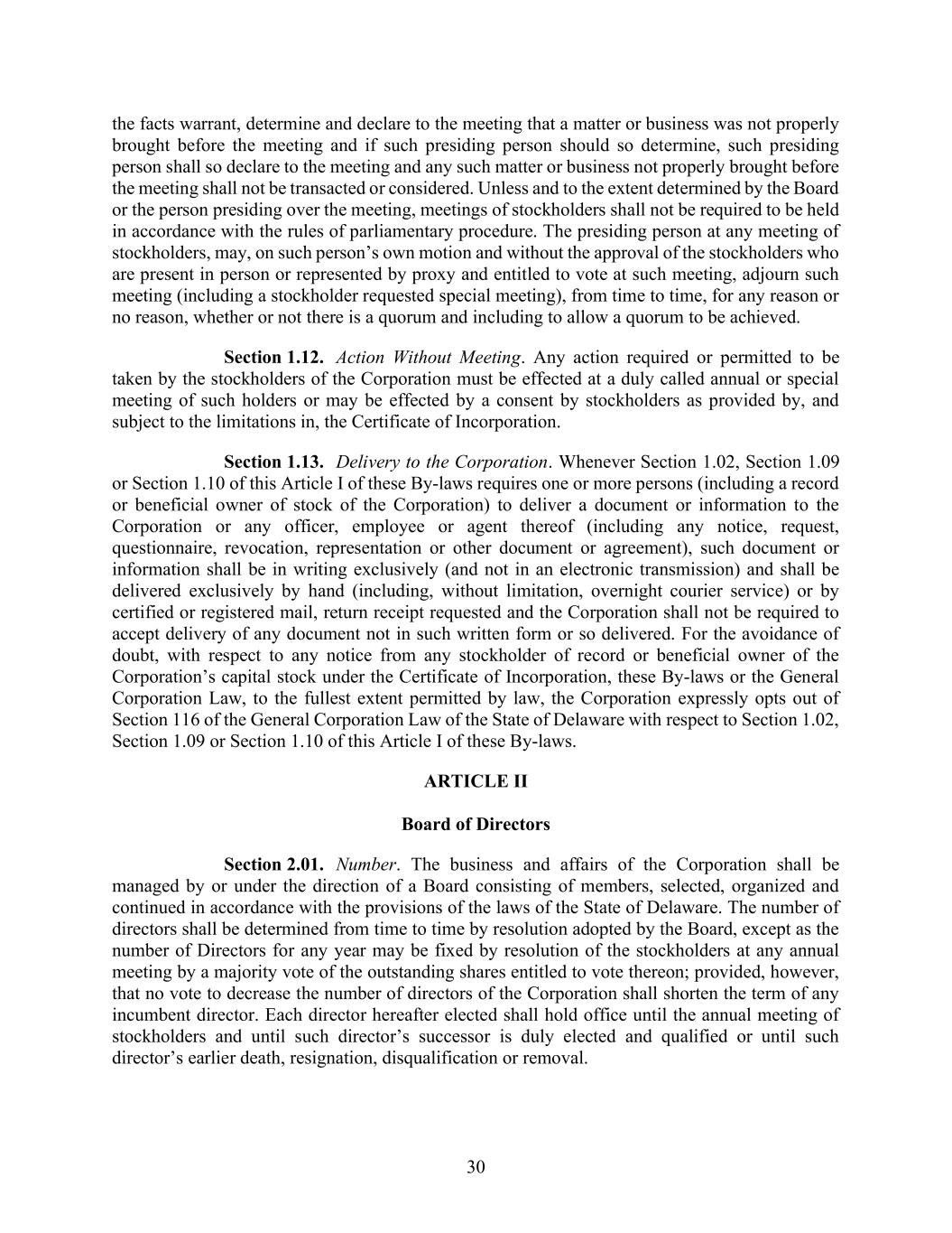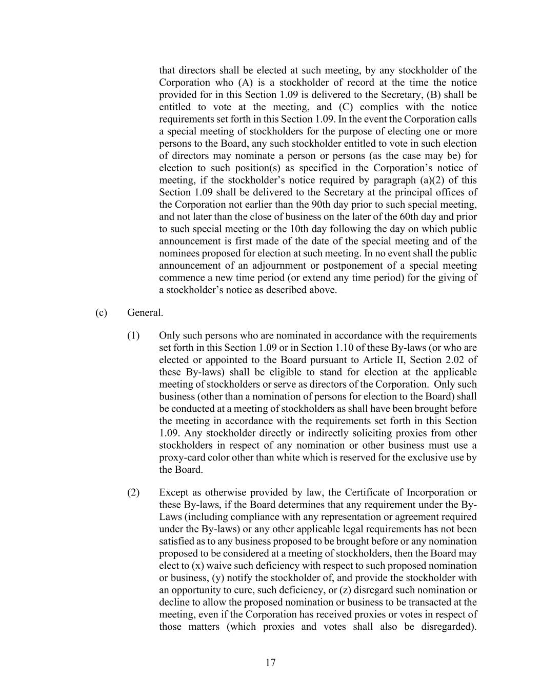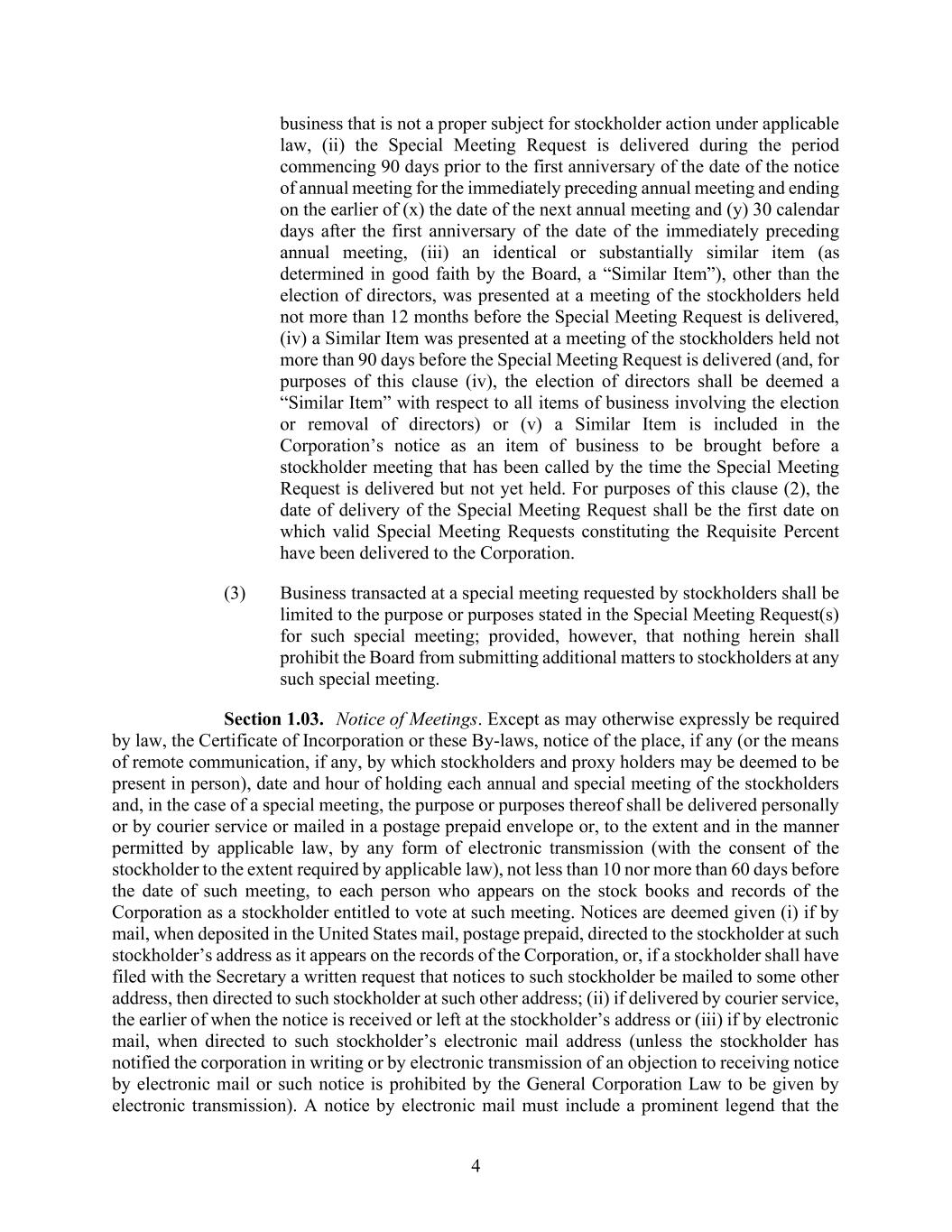 4 business that is not a proper subject for stockholder action under applicable law, (ii) the Special Meeting Request is delivered during the period commencing 90 days prior to the first anniversary of the date of the notice of annual meeting for the immediately preceding annual meeting and ending on the earlier of (x) the date of the next annual meeting and (y) 30 calendar days after the first anniversary of the date of the immediately preceding annual meeting, (iii) an identical or substantially similar item (as determined in good faith by the Board, a “Similar Item”), other than the election of directors, was presented at a meeting of the stockholders held not more than 12 months before the Special Meeting Request is delivered, (iv) a Similar Item was presented at a meeting of the stockholders held not more than 90 days before the Special Meeting Request is delivered (and, for purposes of this clause (iv), the election of directors shall be deemed a “Similar Item” with respect to all items of business involving the election or removal of directors) or (v) a Similar Item is included in the Corporation’s notice as an item of business to be brought before a stockholder meeting that has been called by the time the Special Meeting Request is delivered but not yet held. For purposes of this clause (2), the date of delivery of the Special Meeting Request shall be the first date on which valid Special Meeting Requests constituting the Requisite Percent have been delivered to the Corporation. (3) Business transacted at a special meeting requested by stockholders shall be limited to the purpose or purposes stated in the Special Meeting Request(s) for such special meeting; provided, however, that nothing herein shall prohibit the Board from submitting additional matters to stockholders at any such special meeting. Section 1.03. Notice of Meetings. Except as may otherwise expressly be required by law, the Certificate of Incorporation or these By-laws, notice of the place, if any (or the means of remote communication, if any, by which stockholders and proxy holders may be deemed to be present in person), date and hour of holding each annual and special meeting of the stockholders and, in the case of a special meeting, the purpose or purposes thereof shall be delivered personally or by courier service or mailed in a postage prepaid envelope or, to the extent and in the manner permitted by applicable law, by any form of electronic transmission (with the consent of the stockholder to the extent required by applicable law), not less than 10 nor more than 60 days before the date of such meeting, to each person who appears on the stock books and records of the Corporation as a stockholder entitled to vote at such meeting. Notices are deemed given (i) if by mail, when deposited in the United States mail, postage prepaid, directed to the stockholder at such stockholder’s address as it appears on the records of the Corporation, or, if a stockholder shall have filed with the Secretary a written request that notices to such stockholder be mailed to some other address, then directed to such stockholder at such other address; (ii) if delivered by courier service, the earlier of when the notice is received or left at the stockholder’s address or (iii) if by electronic mail, when directed to such stockholder’s electronic mail address (unless the stockholder has notified the corporation in writing or by electronic transmission of an objection to receiving notice by electronic mail or such notice is prohibited by the General Corporation Law to be given by electronic transmission). A notice by electronic mail must include a prominent legend that the