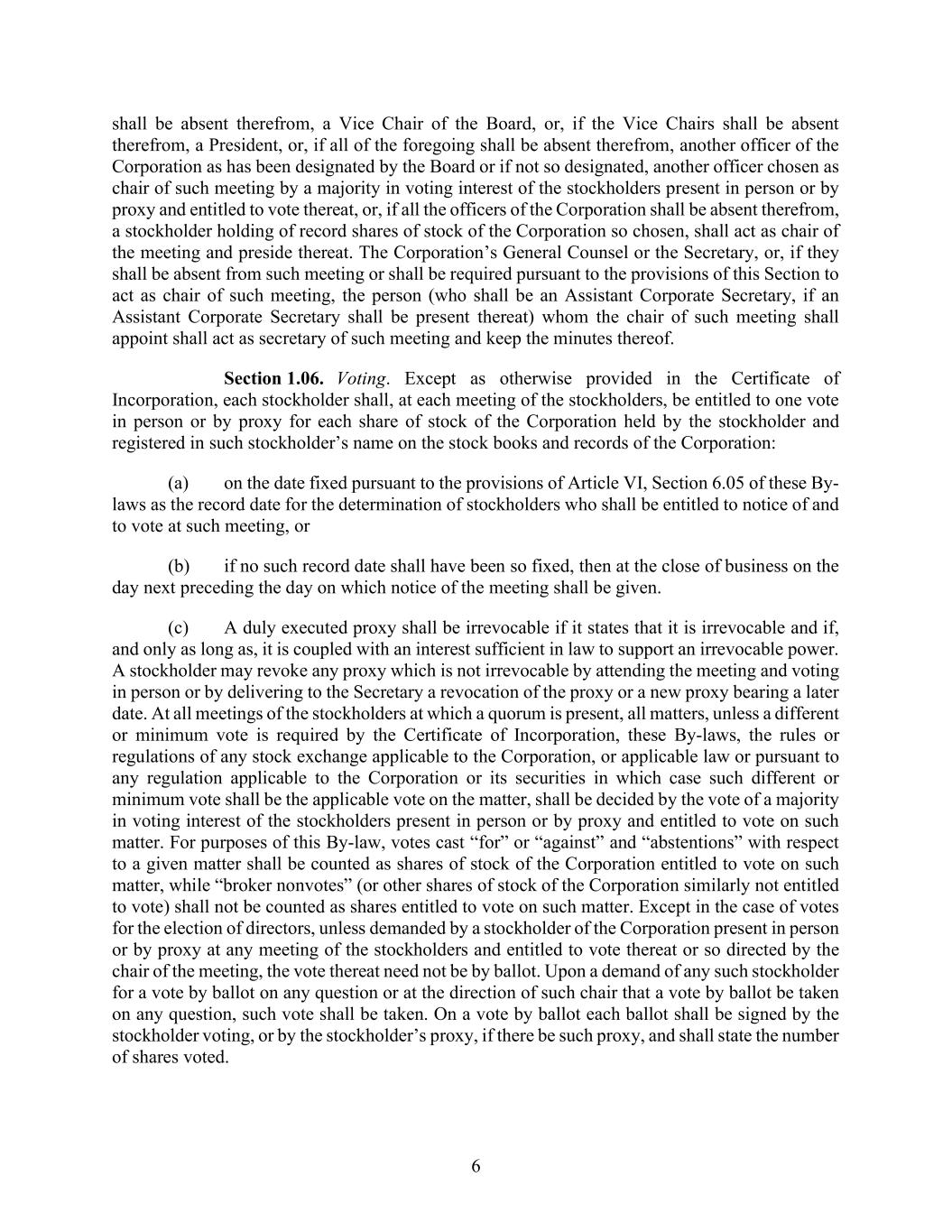 6 shall be absent therefrom, a Vice Chair of the Board, or, if the Vice Chairs shall be absent therefrom, a President, or, if all of the foregoing shall be absent therefrom, another officer of the Corporation as has been designated by the Board or if not so designated, another officer chosen as chair of such meeting by a majority in voting interest of the stockholders present in person or by proxy and entitled to vote thereat, or, if all the officers of the Corporation shall be absent therefrom, a stockholder holding of record shares of stock of the Corporation so chosen, shall act as chair of the meeting and preside thereat. The Corporation’s General Counsel or the Secretary, or, if they shall be absent from such meeting or shall be required pursuant to the provisions of this Section to act as chair of such meeting, the person (who shall be an Assistant Corporate Secretary, if an Assistant Corporate Secretary shall be present thereat) whom the chair of such meeting shall appoint shall act as secretary of such meeting and keep the minutes thereof. Section 1.06. Voting. Except as otherwise provided in the Certificate of Incorporation, each stockholder shall, at each meeting of the stockholders, be entitled to one vote in person or by proxy for each share of stock of the Corporation held by the stockholder and registered in such stockholder’s name on the stock books and records of the Corporation: (a) on the date fixed pursuant to the provisions of Article VI, Section 6.05 of these By- laws as the record date for the determination of stockholders who shall be entitled to notice of and to vote at such meeting, or (b) if no such record date shall have been so fixed, then at the close of business on the day next preceding the day on which notice of the meeting shall be given. (c) A duly executed proxy shall be irrevocable if it states that it is irrevocable and if, and only as long as, it is coupled with an interest sufficient in law to support an irrevocable power. A stockholder may revoke any proxy which is not irrevocable by attending the meeting and voting in person or by delivering to the Secretary a revocation of the proxy or a new proxy bearing a later date. At all meetings of the stockholders at which a quorum is present, all matters, unless a different or minimum vote is required by the Certificate of Incorporation, these By-laws, the rules or regulations of any stock exchange applicable to the Corporation, or applicable law or pursuant to any regulation applicable to the Corporation or its securities in which case such different or minimum vote shall be the applicable vote on the matter, shall be decided by the vote of a majority in voting interest of the stockholders present in person or by proxy and entitled to vote on such matter. For purposes of this By-law, votes cast “for” or “against” and “abstentions” with respect to a given matter shall be counted as shares of stock of the Corporation entitled to vote on such matter, while “broker nonvotes” (or other shares of stock of the Corporation similarly not entitled to vote) shall not be counted as shares entitled to vote on such matter. Except in the case of votes for the election of directors, unless demanded by a stockholder of the Corporation present in person or by proxy at any meeting of the stockholders and entitled to vote thereat or so directed by the chair of the meeting, the vote thereat need not be by ballot. Upon a demand of any such stockholder for a vote by ballot on any question or at the direction of such chair that a vote by ballot be taken on any question, such vote shall be taken. On a vote by ballot each ballot shall be signed by the stockholder voting, or by the stockholder’s proxy, if there be such proxy, and shall state the number of shares voted.