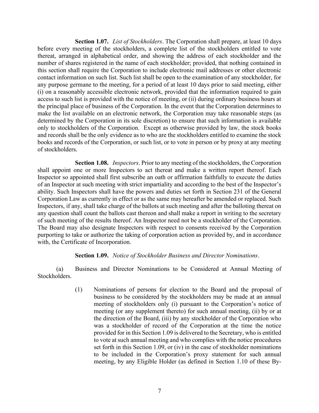 7 Section 1.07. List of Stockholders. The Corporation shall prepare, at least 10 days before every meeting of the stockholders, a complete list of the stockholders entitled to vote thereat, arranged in alphabetical order, and showing the address of each stockholder and the number of shares registered in the name of each stockholder; provided, that nothing contained in this section shall require the Corporation to include electronic mail addresses or other electronic contact information on such list. Such list shall be open to the examination of any stockholder, for any purpose germane to the meeting, for a period of at least 10 days prior to said meeting, either (i) on a reasonably accessible electronic network, provided that the information required to gain access to such list is provided with the notice of meeting, or (ii) during ordinary business hours at the principal place of business of the Corporation. In the event that the Corporation determines to make the list available on an electronic network, the Corporation may take reasonable steps (as determined by the Corporation in its sole discretion) to ensure that such information is available only to stockholders of the Corporation. Except as otherwise provided by law, the stock books and records shall be the only evidence as to who are the stockholders entitled to examine the stock books and records of the Corporation, or such list, or to vote in person or by proxy at any meeting of stockholders. Section 1.08. Inspectors. Prior to any meeting of the stockholders, the Corporation shall appoint one or more Inspectors to act thereat and make a written report thereof. Each Inspector so appointed shall first subscribe an oath or affirmation faithfully to execute the duties of an Inspector at such meeting with strict impartiality and according to the best of the Inspector’s ability. Such Inspectors shall have the powers and duties set forth in Section 231 of the General Corporation Law as currently in effect or as the same may hereafter be amended or replaced. Such Inspectors, if any, shall take charge of the ballots at such meeting and after the balloting thereat on any question shall count the ballots cast thereon and shall make a report in writing to the secretary of such meeting of the results thereof. An Inspector need not be a stockholder of the Corporation. The Board may also designate Inspectors with respect to consents received by the Corporation purporting to take or authorize the taking of corporation action as provided by, and in accordance with, the Certificate of Incorporation. Section 1.09. Notice of Stockholder Business and Director Nominations. (a) Business and Director Nominations to be Considered at Annual Meeting of Stockholders. (1) Nominations of persons for election to the Board and the proposal of business to be considered by the stockholders may be made at an annual meeting of stockholders only (i) pursuant to the Corporation’s notice of meeting (or any supplement thereto) for such annual meeting, (ii) by or at the direction of the Board, (iii) by any stockholder of the Corporation who was a stockholder of record of the Corporation at the time the notice provided for in this Section 1.09 is delivered to the Secretary, who is entitled to vote at such annual meeting and who complies with the notice procedures set forth in this Section 1.09, or (iv) in the case of stockholder nominations to be included in the Corporation’s proxy statement for such annual meeting, by any Eligible Holder (as defined in Section 1.10 of these By-
