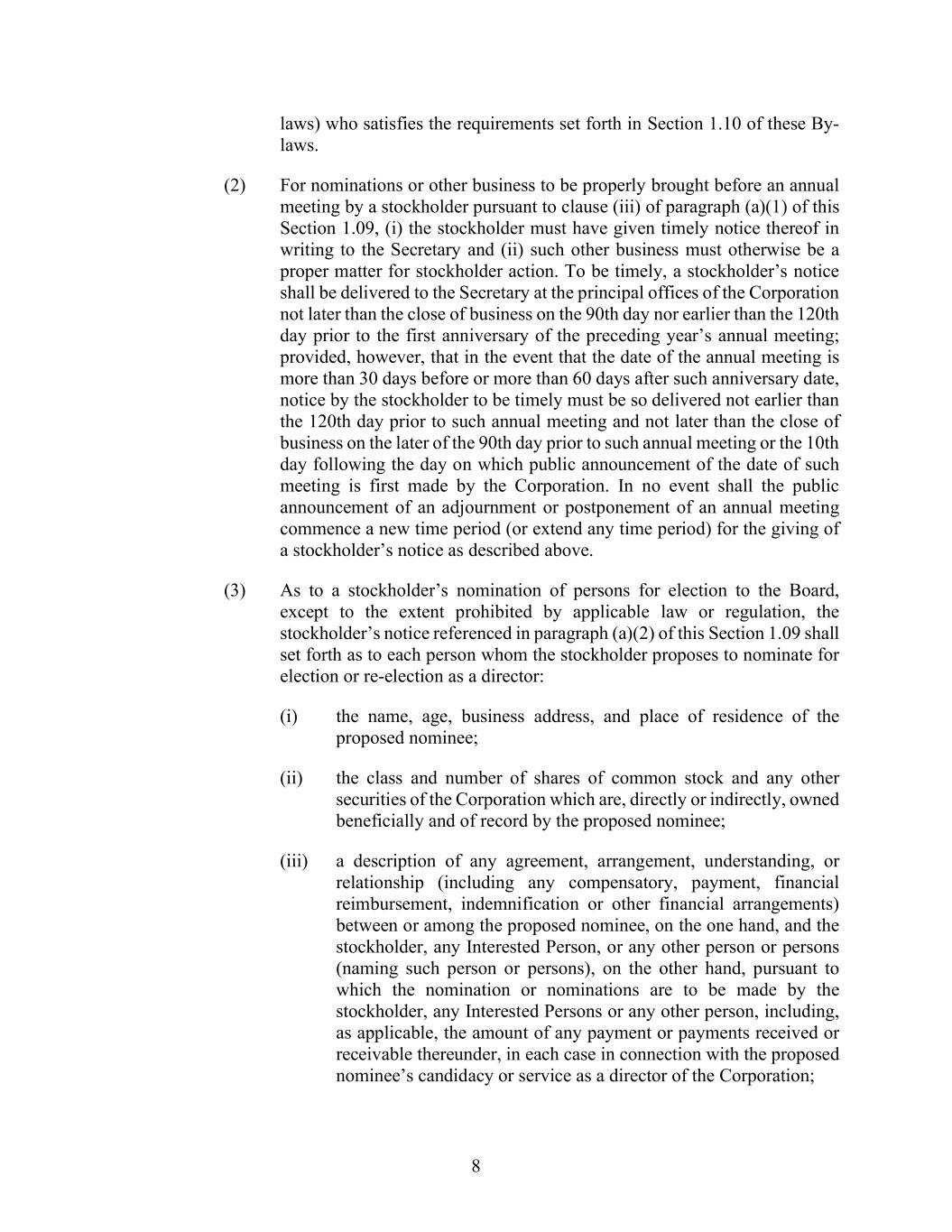 8 laws) who satisfies the requirements set forth in Section 1.10 of these By- laws. (2) For nominations or other business to be properly brought before an annual meeting by a stockholder pursuant to clause (iii) of paragraph (a)(1) of this Section 1.09, (i) the stockholder must have given timely notice thereof in writing to the Secretary and (ii) such other business must otherwise be a proper matter for stockholder action. To be timely, a stockholder’s notice shall be delivered to the Secretary at the principal offices of the Corporation not later than the close of business on the 90th day nor earlier than the 120th day prior to the first anniversary of the preceding year’s annual meeting; provided, however, that in the event that the date of the annual meeting is more than 30 days before or more than 60 days after such anniversary date, notice by the stockholder to be timely must be so delivered not earlier than the 120th day prior to such annual meeting and not later than the close of business on the later of the 90th day prior to such annual meeting or the 10th day following the day on which public announcement of the date of such meeting is first made by the Corporation. In no event shall the public announcement of an adjournment or postponement of an annual meeting commence a new time period (or extend any time period) for the giving of a stockholder’s notice as described above. (3) As to a stockholder’s nomination of persons for election to the Board, except to the extent prohibited by applicable law or regulation, the stockholder’s notice referenced in paragraph (a)(2) of this Section 1.09 shall set forth as to each person whom the stockholder proposes to nominate for election or re-election as a director: (i) the name, age, business address, and place of residence of the proposed nominee; (ii) the class and number of shares of common stock and any other securities of the Corporation which are, directly or indirectly, owned beneficially and of record by the proposed nominee; (iii) a description of any agreement, arrangement, understanding, or relationship (including any compensatory, payment, financial reimbursement, indemnification or other financial arrangements) between or among the proposed nominee, on the one hand, and the stockholder, any Interested Person, or any other person or persons (naming such person or persons), on the other hand, pursuant to which the nomination or nominations are to be made by the stockholder, any Interested Persons or any other person, including, as applicable, the amount of any payment or payments received or receivable thereunder, in each case in connection with the proposed nominee’s candidacy or service as a director of the Corporation;