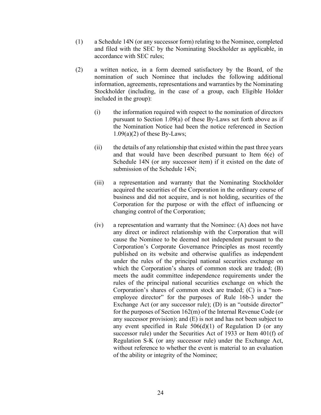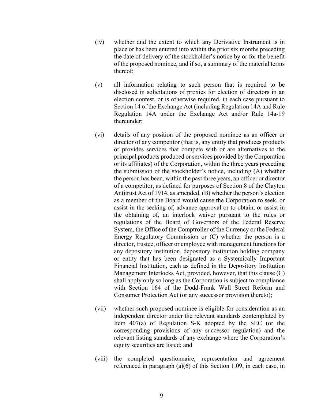9 (iv) whether and the extent to which any Derivative Instrument is in place or has been entered into within the prior six months preceding the date of delivery of the stockholder’s notice by or for the benefit of the proposed nominee, and if so, a summary of the material terms thereof; (v) all information relating to such person that is required to be disclosed in solicitations of proxies for election of directors in an election contest, or is otherwise required, in each case pursuant to Section 14 of the Exchange Act (including Regulation 14A and Rule Regulation 14A under the Exchange Act and/or Rule 14a-19 thereunder; (vi) details of any position of the proposed nominee as an officer or director of any competitor (that is, any entity that produces products or provides services that compete with or are alternatives to the principal products produced or services provided by the Corporation or its affiliates) of the Corporation, within the three years preceding the submission of the stockholder’s notice, including (A) whether the person has been, within the past three years, an officer or director of a competitor, as defined for purposes of Section 8 of the Clayton Antitrust Act of 1914, as amended, (B) whether the person’s election as a member of the Board would cause the Corporation to seek, or assist in the seeking of, advance approval or to obtain, or assist in the obtaining of, an interlock waiver pursuant to the rules or regulations of the Board of Governors of the Federal Reserve System, the Office of the Comptroller of the Currency or the Federal Energy Regulatory Commission or (C) whether the person is a director, trustee, officer or employee with management functions for any depository institution, depository institution holding company or entity that has been designated as a Systemically Important Financial Institution, each as defined in the Depository Institution Management Interlocks Act, provided, however, that this clause (C) shall apply only so long as the Corporation is subject to compliance with Section 164 of the Dodd-Frank Wall Street Reform and Consumer Protection Act (or any successor provision thereto); (vii) whether such proposed nominee is eligible for consideration as an independent director under the relevant standards contemplated by Item 407(a) of Regulation S-K adopted by the SEC (or the corresponding provisions of any successor regulation) and the relevant listing standards of any exchange where the Corporation’s equity securities are listed; and (viii) the completed questionnaire, representation and agreement referenced in paragraph (a)(6) of this Section 1.09, in each case, in