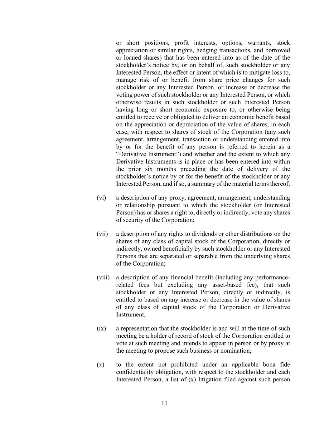11 or short positions, profit interests, options, warrants, stock appreciation or similar rights, hedging transactions, and borrowed or loaned shares) that has been entered into as of the date of the stockholder’s notice by, or on behalf of, such stockholder or any Interested Person, the effect or intent of which is to mitigate loss to, manage risk of or benefit from share price changes for such stockholder or any Interested Person, or increase or decrease the voting power of such stockholder or any Interested Person, or which otherwise results in such stockholder or such Interested Person having long or short economic exposure to, or otherwise being entitled to receive or obligated to deliver an economic benefit based on the appreciation or depreciation of the value of shares, in each case, with respect to shares of stock of the Corporation (any such agreement, arrangement, transaction or understanding entered into by or for the benefit of any person is referred to herein as a “Derivative Instrument”) and whether and the extent to which any Derivative Instruments is in place or has been entered into within the prior six months preceding the date of delivery of the stockholder’s notice by or for the benefit of the stockholder or any Interested Person, and if so, a summary of the material terms thereof; (vi) a description of any proxy, agreement, arrangement, understanding or relationship pursuant to which the stockholder (or Interested Person) has or shares a right to, directly or indirectly, vote any shares of security of the Corporation; (vii) a description of any rights to dividends or other distributions on the shares of any class of capital stock of the Corporation, directly or indirectly, owned beneficially by such stockholder or any Interested Persons that are separated or separable from the underlying shares of the Corporation; (viii) a description of any financial benefit (including any performance- related fees but excluding any asset-based fee), that such stockholder or any Interested Person, directly or indirectly, is entitled to based on any increase or decrease in the value of shares of any class of capital stock of the Corporation or Derivative Instrument; (ix) a representation that the stockholder is and will at the time of such meeting be a holder of record of stock of the Corporation entitled to vote at such meeting and intends to appear in person or by proxy at the meeting to propose such business or nomination; (x) to the extent not prohibited under an applicable bona fide confidentiality obligation, with respect to the stockholder and each Interested Person, a list of (x) litigation filed against such person