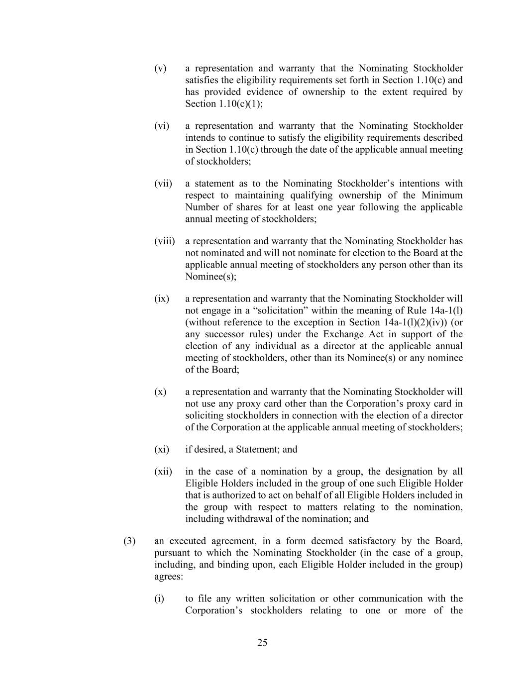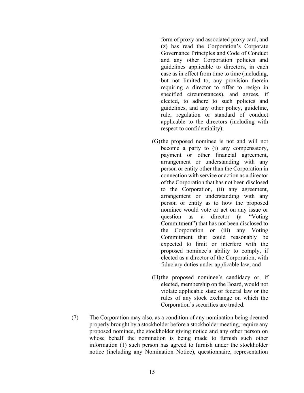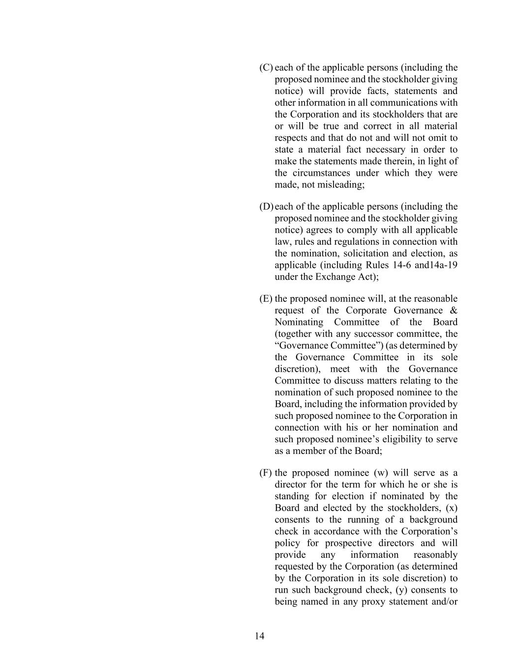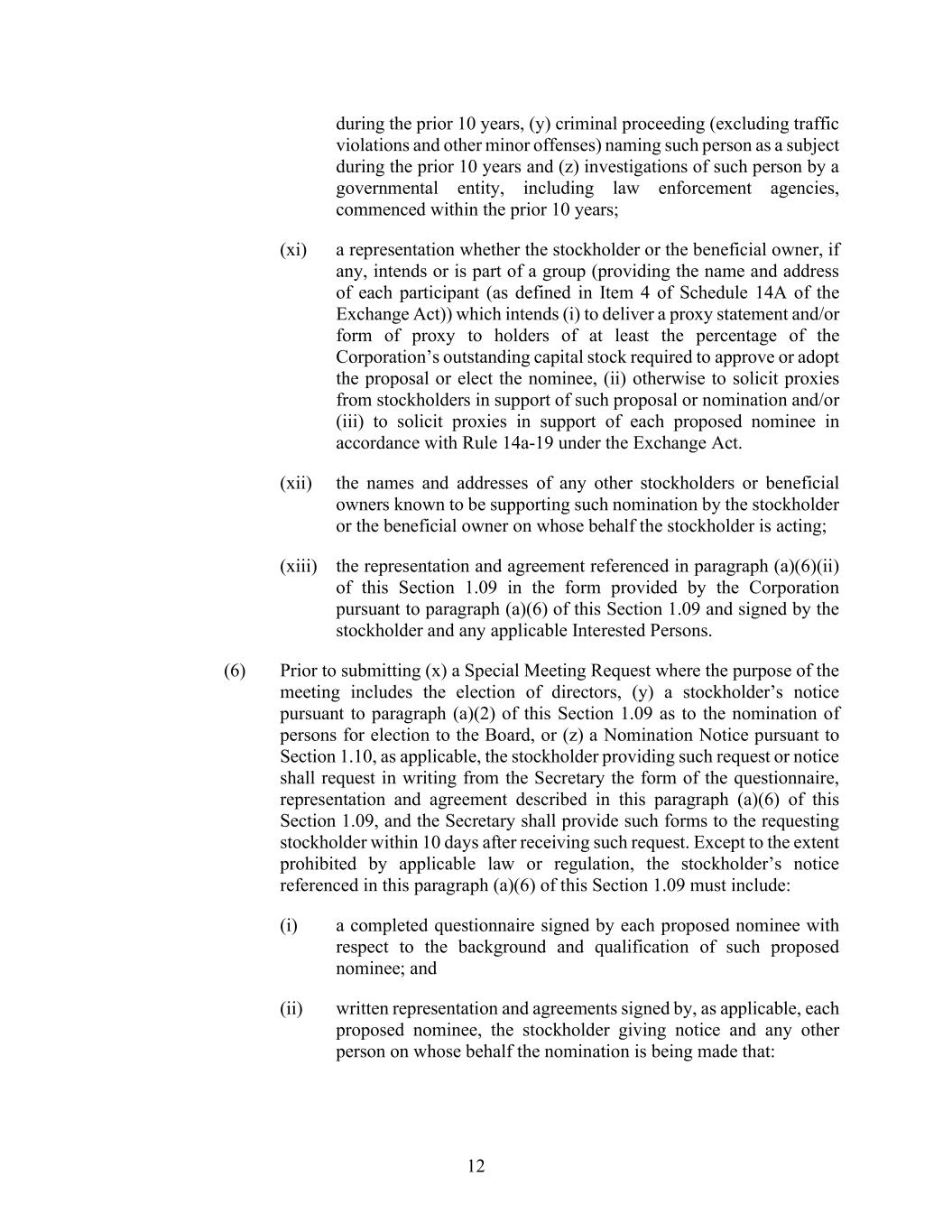12 during the prior 10 years, (y) criminal proceeding (excluding traffic violations and other minor offenses) naming such person as a subject during the prior 10 years and (z) investigations of such person by a governmental entity, including law enforcement agencies, commenced within the prior 10 years; (xi) a representation whether the stockholder or the beneficial owner, if any, intends or is part of a group (providing the name and address of each participant (as defined in Item 4 of Schedule 14A of the Exchange Act)) which intends (i) to deliver a proxy statement and/or form of proxy to holders of at least the percentage of the Corporation’s outstanding capital stock required to approve or adopt the proposal or elect the nominee, (ii) otherwise to solicit proxies from stockholders in support of such proposal or nomination and/or (iii) to solicit proxies in support of each proposed nominee in accordance with Rule 14a-19 under the Exchange Act. (xii) the names and addresses of any other stockholders or beneficial owners known to be supporting such nomination by the stockholder or the beneficial owner on whose behalf the stockholder is acting; (xiii) the representation and agreement referenced in paragraph (a)(6)(ii) of this Section 1.09 in the form provided by the Corporation pursuant to paragraph (a)(6) of this Section 1.09 and signed by the stockholder and any applicable Interested Persons. (6) Prior to submitting (x) a Special Meeting Request where the purpose of the meeting includes the election of directors, (y) a stockholder’s notice pursuant to paragraph (a)(2) of this Section 1.09 as to the nomination of persons for election to the Board, or (z) a Nomination Notice pursuant to Section 1.10, as applicable, the stockholder providing such request or notice shall request in writing from the Secretary the form of the questionnaire, representation and agreement described in this paragraph (a)(6) of this Section 1.09, and the Secretary shall provide such forms to the requesting stockholder within 10 days after receiving such request. Except to the extent prohibited by applicable law or regulation, the stockholder’s notice referenced in this paragraph (a)(6) of this Section 1.09 must include: (i) a completed questionnaire signed by each proposed nominee with respect to the background and qualification of such proposed nominee; and (ii) written representation and agreements signed by, as applicable, each proposed nominee, the stockholder giving notice and any other person on whose behalf the nomination is being made that: