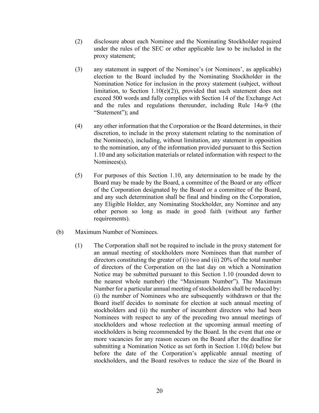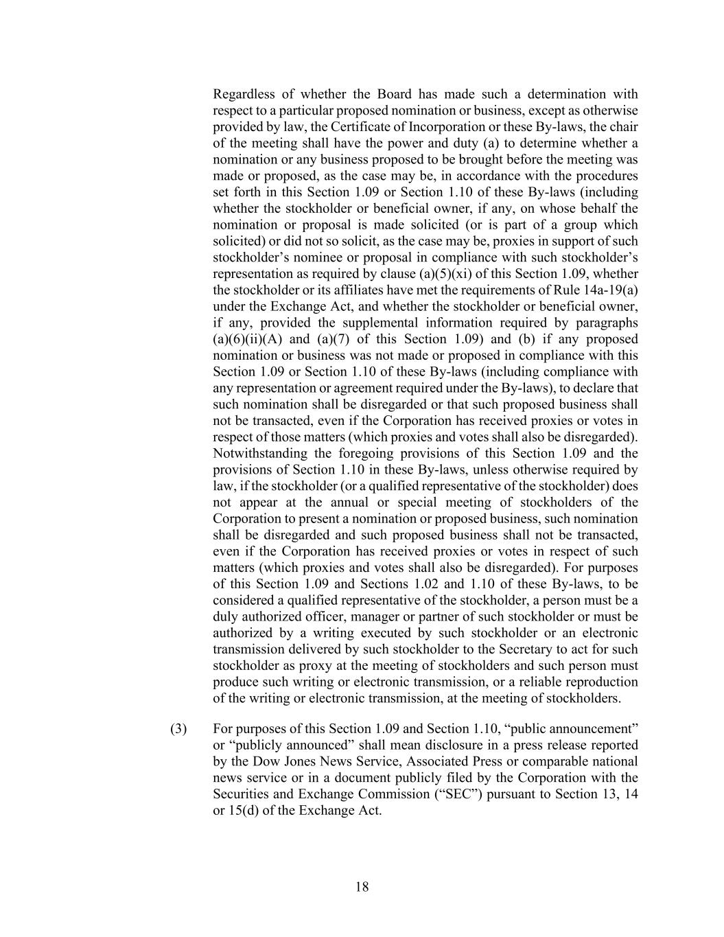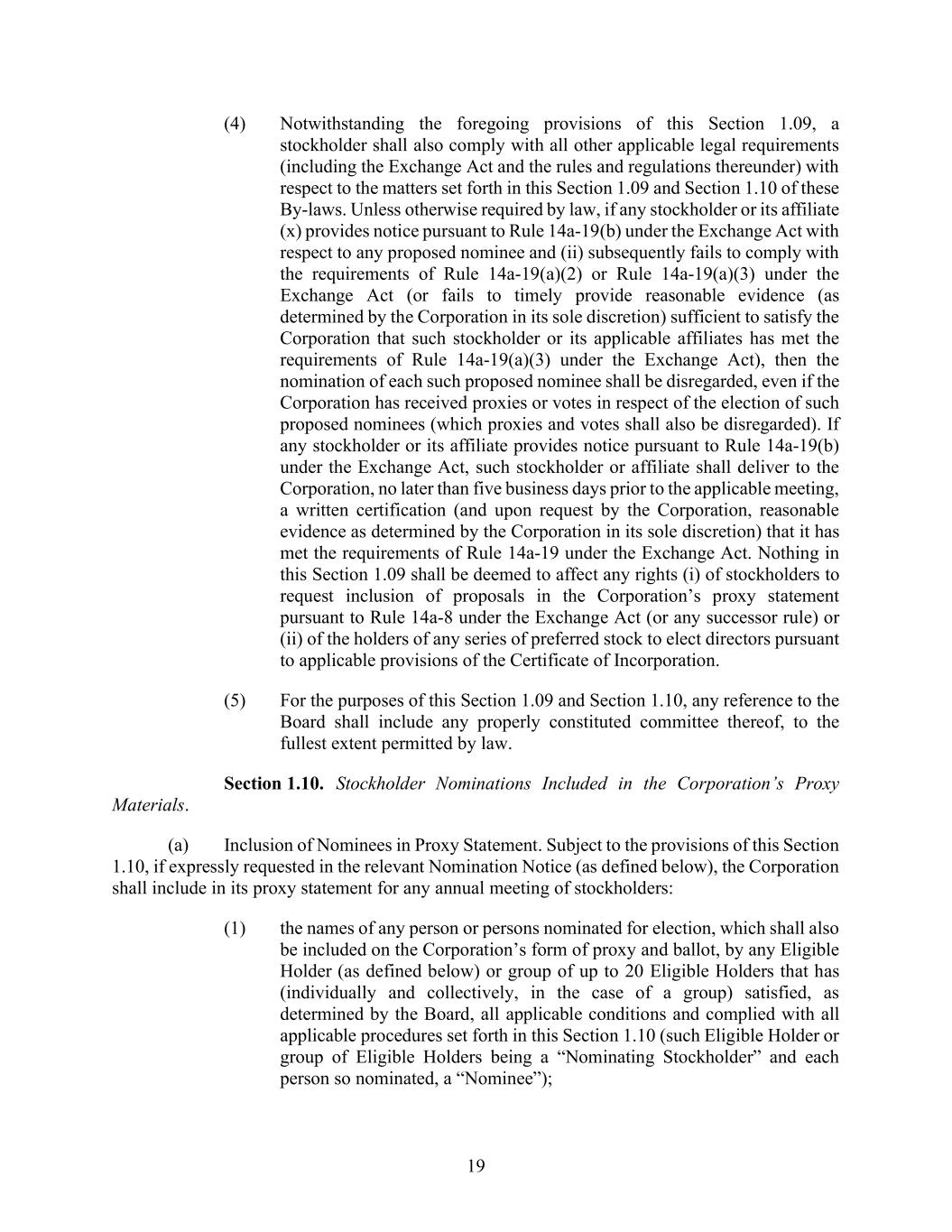 12 during the prior 10 years, (y) criminal proceeding (excluding traffic violations and other minor offenses) naming such person as a subject during the prior 10 years and (z) investigations of such person by a governmental entity, including law enforcement agencies, commenced within the prior 10 years; (xi) a representation whether the stockholder or the beneficial owner, if any, intends or is part of a group (providing the name and address of each participant (as defined in Item 4 of Schedule 14A of the Exchange Act)) which intends (i) to deliver a proxy statement and/or form of proxy to holders of at least the percentage of the Corporation’s outstanding capital stock required to approve or adopt the proposal or elect the nominee, (ii) otherwise to solicit proxies from stockholders in support of such proposal or nomination and/or (iii) to solicit proxies in support of each proposed nominee in accordance with Rule 14a-19 under the Exchange Act. (xii) the names and addresses of any other stockholders or beneficial owners known to be supporting such nomination by the stockholder or the beneficial owner on whose behalf the stockholder is acting; (xiii) the representation and agreement referenced in paragraph (a)(6)(ii) of this Section 1.09 in the form provided by the Corporation pursuant to paragraph (a)(6) of this Section 1.09 and signed by the stockholder and any applicable Interested Persons. (6) Prior to submitting (x) a Special Meeting Request where the purpose of the meeting includes the election of directors, (y) a stockholder’s notice pursuant to paragraph (a)(2) of this Section 1.09 as to the nomination of persons for election to the Board, or (z) a Nomination Notice pursuant to Section 1.10, as applicable, the stockholder providing such request or notice shall request in writing from the Secretary the form of the questionnaire, representation and agreement described in this paragraph (a)(6) of this Section 1.09, and the Secretary shall provide such forms to the requesting stockholder within 10 days after receiving such request. Except to the extent prohibited by applicable law or regulation, the stockholder’s notice referenced in this paragraph (a)(6) of this Section 1.09 must include: (i) a completed questionnaire signed by each proposed nominee with respect to the background and qualification of such proposed nominee; and (ii) written representation and agreements signed by, as applicable, each proposed nominee, the stockholder giving notice and any other person on whose behalf the nomination is being made that: