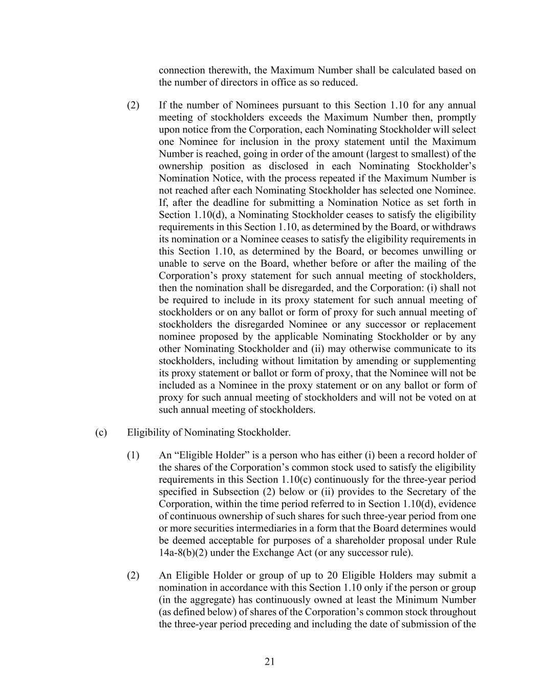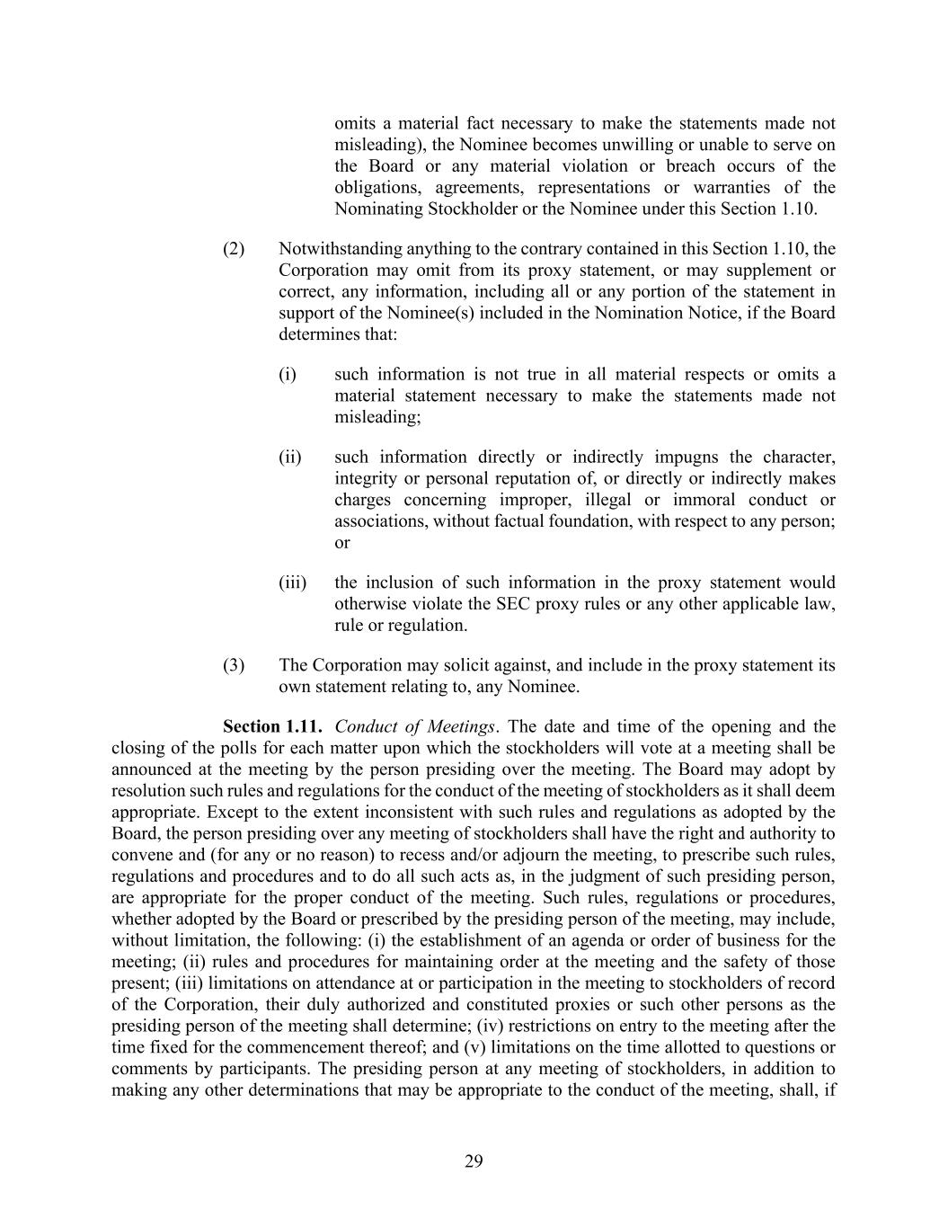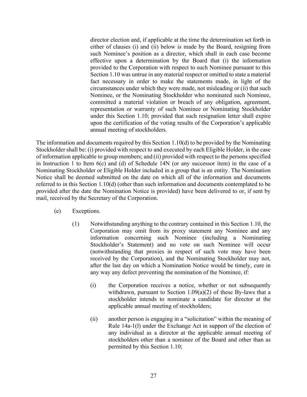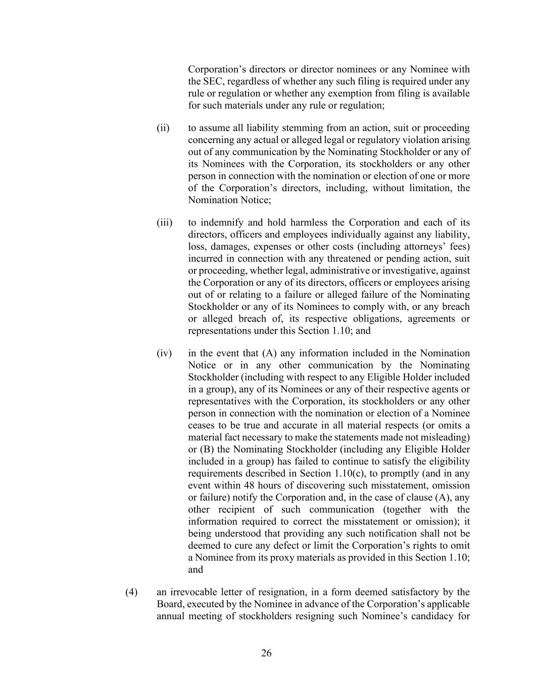 12 during the prior 10 years, (y) criminal proceeding (excluding traffic violations and other minor offenses) naming such person as a subject during the prior 10 years and (z) investigations of such person by a governmental entity, including law enforcement agencies, commenced within the prior 10 years; (xi) a representation whether the stockholder or the beneficial owner, if any, intends or is part of a group (providing the name and address of each participant (as defined in Item 4 of Schedule 14A of the Exchange Act)) which intends (i) to deliver a proxy statement and/or form of proxy to holders of at least the percentage of the Corporation’s outstanding capital stock required to approve or adopt the proposal or elect the nominee, (ii) otherwise to solicit proxies from stockholders in support of such proposal or nomination and/or (iii) to solicit proxies in support of each proposed nominee in accordance with Rule 14a-19 under the Exchange Act. (xii) the names and addresses of any other stockholders or beneficial owners known to be supporting such nomination by the stockholder or the beneficial owner on whose behalf the stockholder is acting; (xiii) the representation and agreement referenced in paragraph (a)(6)(ii) of this Section 1.09 in the form provided by the Corporation pursuant to paragraph (a)(6) of this Section 1.09 and signed by the stockholder and any applicable Interested Persons. (6) Prior to submitting (x) a Special Meeting Request where the purpose of the meeting includes the election of directors, (y) a stockholder’s notice pursuant to paragraph (a)(2) of this Section 1.09 as to the nomination of persons for election to the Board, or (z) a Nomination Notice pursuant to Section 1.10, as applicable, the stockholder providing such request or notice shall request in writing from the Secretary the form of the questionnaire, representation and agreement described in this paragraph (a)(6) of this Section 1.09, and the Secretary shall provide such forms to the requesting stockholder within 10 days after receiving such request. Except to the extent prohibited by applicable law or regulation, the stockholder’s notice referenced in this paragraph (a)(6) of this Section 1.09 must include: (i) a completed questionnaire signed by each proposed nominee with respect to the background and qualification of such proposed nominee; and (ii) written representation and agreements signed by, as applicable, each proposed nominee, the stockholder giving notice and any other person on whose behalf the nomination is being made that: