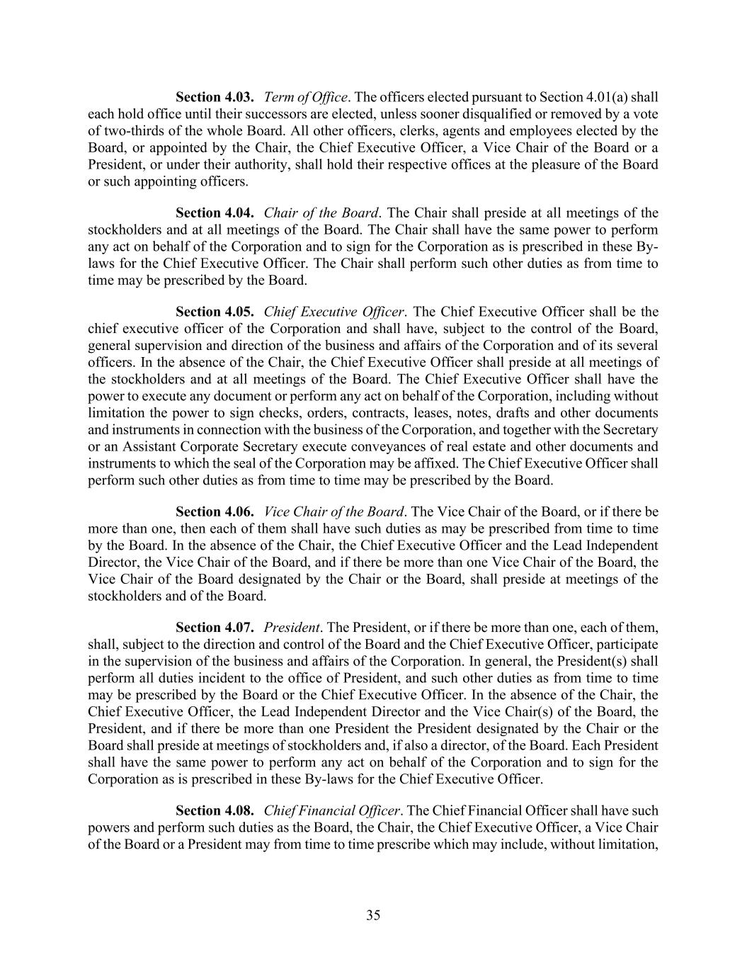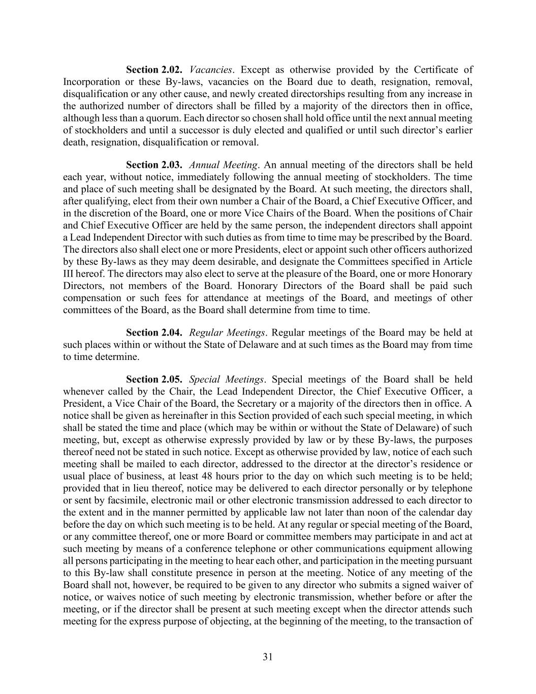 5 communication is an important notice regarding the Corporation. A notice by electronic mail will include any files attached thereto and any information hyperlinked to a website if such electronic mail includes the contact information of an officer or agent of the Corporation who is available to assist with accessing such files or information. Any notice to stockholders given by the Corporation under any provision of the General Corporation Law, the Certificate of Incorporation or these By-laws provided by means of electronic transmission (other than any such notice given by electronic mail) may only be given in a form consented to by such stockholder, and any such notice by such means of electronic transmission shall be deemed to be given as provided by the General Corporation Law. The terms “electronic mail,” “electronic mail address,” “electronic signature” and “electronic transmission” as used herein shall have the meanings ascribed thereto in the General Corporation Law. An affidavit of the mailing or other means of giving any notice of any stockholders’ meeting, executed by the Secretary, Assistant Corporate Secretary or any transfer agent of the Corporation giving the notice, shall be prima facie evidence of the giving of such notice or report. Notice shall be deemed to have been given to all stockholders of record who share an address if notice is given in accordance with the “householding” rules set forth in Rule 14a-3(e) under the Exchange Act and Section 233 of the General Corporation Law. Notice of any meeting of stockholders shall not be required to be given to any stockholder who shall attend such meeting in person or by proxy and shall not, at the beginning of such meeting, object to the transaction of any business because the meeting has not been lawfully called or convened, or who shall, either before or after the meeting, submit a signed waiver of notice or waive notice by electronic transmission, in person or by proxy. To the fullest extent provided by law, the Board may postpone, reschedule or cancel any previously scheduled meeting of stockholders, annual or special. Unless the Board shall fix a new record date for an adjourned meeting, notice of such adjourned meeting need not be given if the time and place, if any (and the means of remote communication, if any, by which stockholders and proxy holders may be deemed to be present in person at such adjourned meeting), to which the meeting shall be adjourned were announced at the meeting at which the adjournment was taken or are provided in any other manner permitted by the General Corporation Law, provided that the adjournment is not for more than 30 days. Section 1.04. Quorum; Adjournment. At each meeting of the stockholders, stockholders holding of record shares constituting a majority of the voting power of stock of the Corporation having voting power (shares having such voting power being hereinafter sometimes referred to as a “voting interest of the stockholders”) entitled to vote at the meeting shall be present in person or by proxy to constitute a quorum for the transaction of business. The presiding person at any meeting of stockholders may adjourn such meeting in accordance with Section 1.11. At any such adjourned meeting at which a quorum may be present, any business may be transacted which might have been transacted at the meeting as originally called. The absence from any meeting of stockholders holding the number of shares of stock of the Corporation required by the General Corporation Law, the Certificate of Incorporation or these By-laws for action upon any given matter shall not prevent action at such meeting upon any other matter or matters which may properly come before the meeting, if there shall be present thereat in person or by proxy stockholders holding the number of shares of stock of the Corporation required in respect of such other matter or matters. Section 1.05. Organization. At each meeting of the stockholders, the Chair, or, if the Chair shall be absent therefrom, the Chief Executive Officer, or if the Chief Executive Officer shall be absent therefrom, the Lead Independent Director, or, if the Lead Independent Director