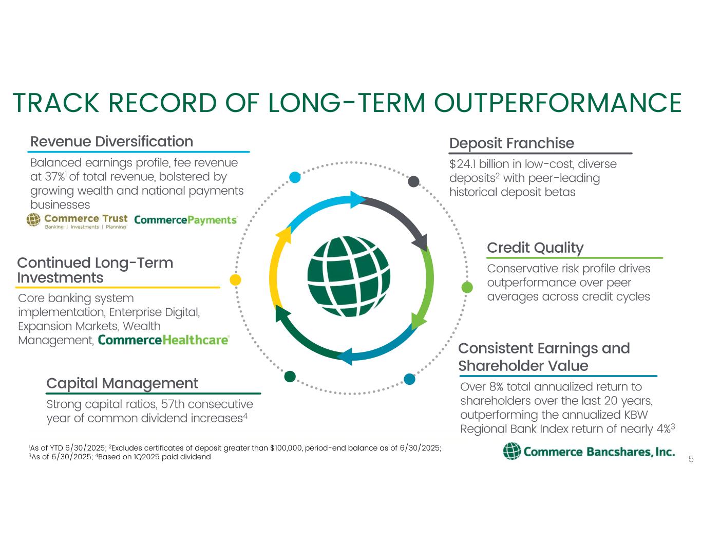 は地方銀行の持株会社で、子会社を通じて決済ソリュ ーション、投資管理、証券仲介など銀行業務全般を提供している。子会社のひとつであるコマース銀行は、160年にわたる実績と強みを活かし、個人や企業の財務上の課題解決を支援している。米国全土で決済ソリューションを提供するほか、コマース銀行は現在、セントルイス、カンザスシティ大都市圏、スプリングフィールド、ミズーリ州中部、イリノイ州中部、ウィチタ、タルサ、オクラホマシティ、デンバーなど中西部全域でフルサービスの銀行施設を運営している。中西部以外では、ダラス、ヒューストン、シンシナティ、ナッシュビル、デモイン、インディアナポリス、グランドラピッズにコマーシャル・オフィス、ダラス、ヒューストン、ネープルにウェルス・オフィスを展開している。コマースは地域の支店、コマーシャル・オフィス、ウェルス・オフィス、ATM、オンライン、モバイル、24時間年中無休のカスタマーサービス・ラインを通じて、ハイタッチ・サービスと洗練された金融ソリューションを提供している。