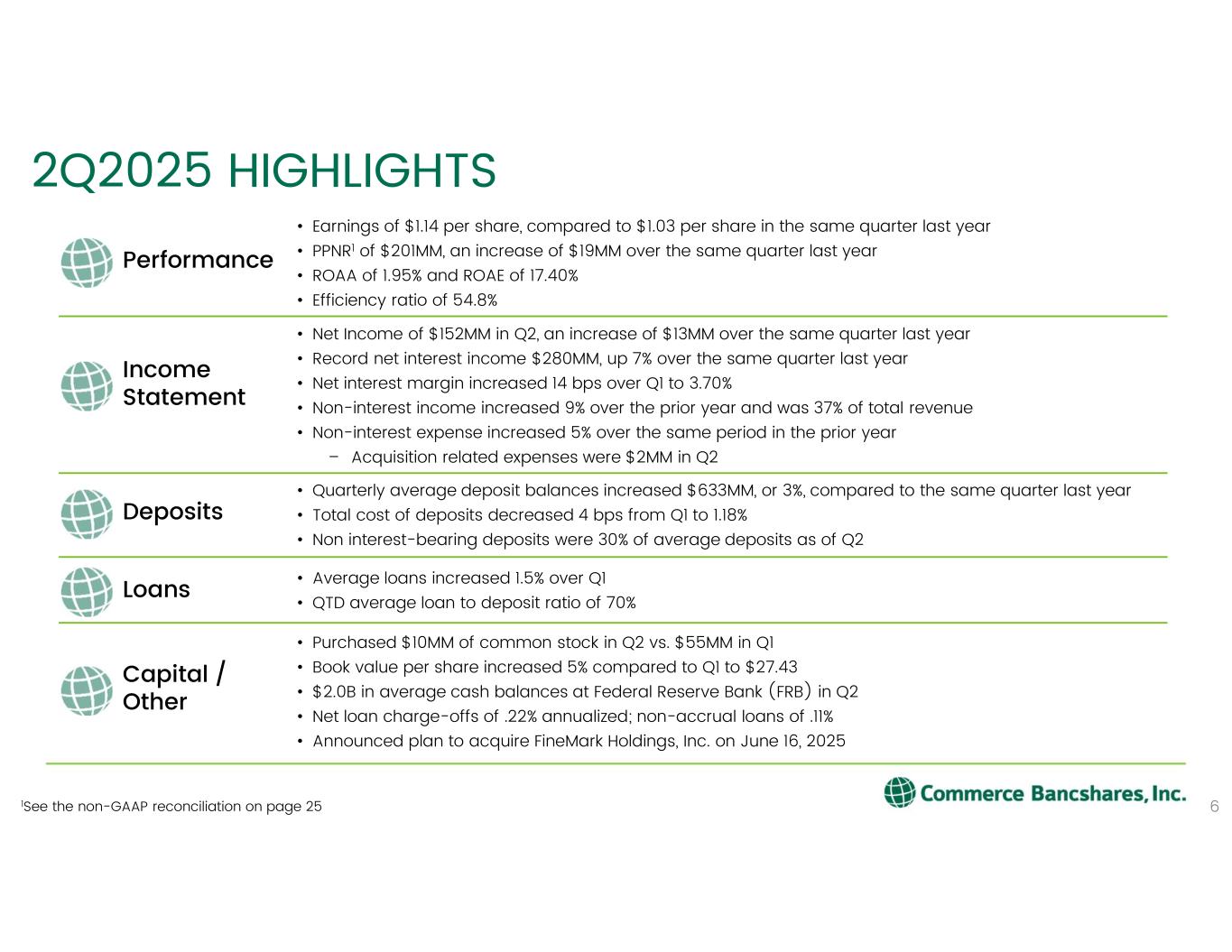 2025年6月30日に終了した6ヶ月間の1株当たり利益は2.12ドル(2024年上半期は1.85ドル)となった。2025年6月30日に終了した6ヶ月間の純利益は2億8,410万ドル(前年同期は2億5,220万ドル)であった。年初来の平均総資産利益率は1.82%、平均株主資本利益率は16.63%であった。