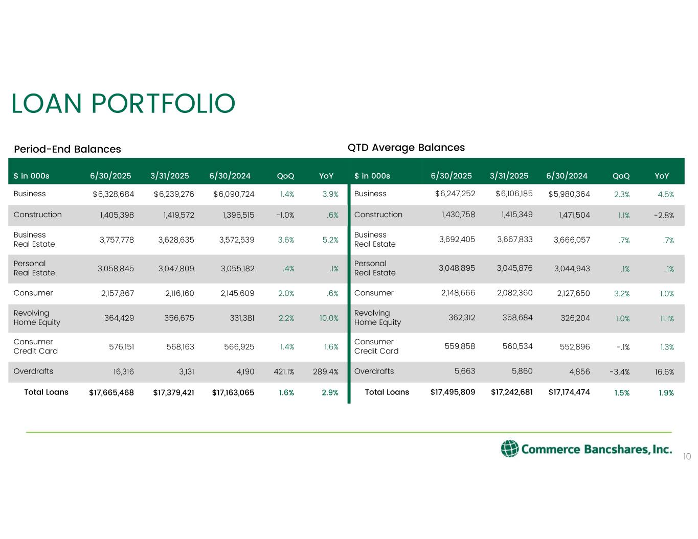 -平均貸出残高は175億ドルと、前期から2億5,310万ドル(1.5%)増加した。