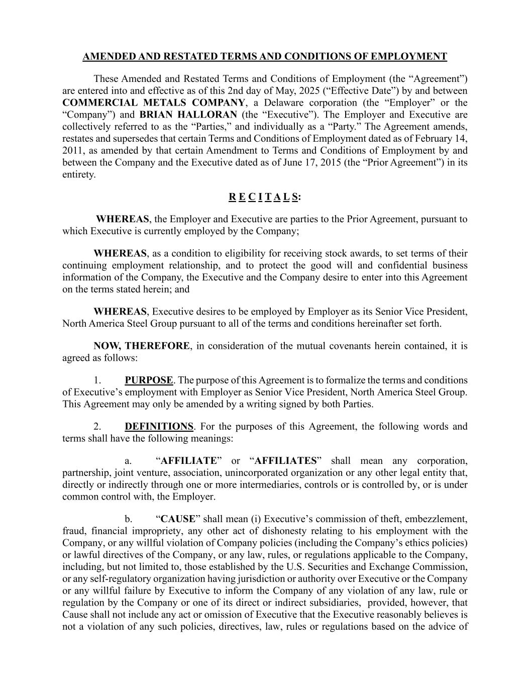 AMENDED AND RESTATED TERMS AND CONDITIONS OF EMPLOYMENT These Amended and Restated Terms and Conditions of Employment (the “Agreement”) are entered into and effective as of this 2nd day of May, 2025 (“Effective Date”) by and between COMMERCIAL METALS COMPANY, a Delaware corporation (the “Employer” or the “Company”) and BRIAN HALLORAN (the “Executive”). The Employer and Executive are collectively referred to as the “Parties,” and individually as a “Party.” The Agreement amends, restates and supersedes that certain Terms and Conditions of Employment dated as of February 14, 2011, as amended by that certain Amendment to Terms and Conditions of Employment by and between the Company and the Executive dated as of June 17, 2015 (the “Prior Agreement”) in its entirety. R E C I T A L S: WHEREAS, the Employer and Executive are parties to the Prior Agreement, pursuant to which Executive is currently employed by the Company; WHEREAS, as a condition to eligibility for receiving stock awards, to set terms of their continuing employment relationship, and to protect the good will and confidential business information of the Company, the Executive and the Company desire to enter into this Agreement on the terms stated herein; and WHEREAS, Executive desires to be employed by Employer as its Senior Vice President, North America Steel Group pursuant to all of the terms and conditions hereinafter set forth. NOW, THEREFORE, in consideration of the mutual covenants herein contained, it is agreed as follows: 1. PURPOSE. The purpose of this Agreement is to formalize the terms and conditions of Executive’s employment with Employer as Senior Vice President, North America Steel Group. This Agreement may only be amended by a writing signed by both Parties. 2. DEFINITIONS. For the purposes of this Agreement, the following words and terms shall have the following meanings: a. “AFFILIATE” or “AFFILIATES” shall mean any corporation, partnership, joint venture, association, unincorporated organization or any other legal entity that, directly or indirectly through one or more intermediaries, controls or is controlled by, or is under common control with, the Employer. b. “CAUSE” shall mean (i) Executive’s commission of theft, embezzlement, fraud, financial impropriety, any other act of dishonesty relating to his employment with the Company, or any willful violation of Company policies (including the Company’s ethics policies) or lawful directives of the Company, or any law, rules, or regulations applicable to the Company, including, but not limited to, those established by the U.S. Securities and Exchange Commission, or any self-regulatory organization having jurisdiction or authority over Executive or the Company or any willful failure by Executive to inform the Company of any violation of any law, rule or regulation by the Company or one of its direct or indirect subsidiaries, provided, however, that Cause shall not include any act or omission of Executive that the Executive reasonably believes is not a violation of any such policies, directives, law, rules or regulations based on the advice of