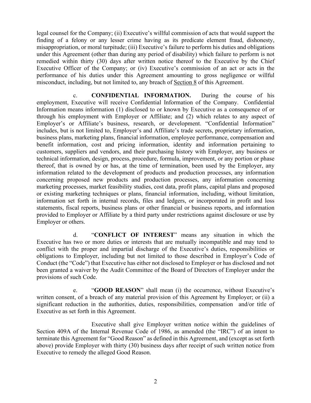 2 legal counsel for the Company; (ii) Executive’s willful commission of acts that would support the finding of a felony or any lesser crime having as its predicate element fraud, dishonesty, misappropriation, or moral turpitude; (iii) Executive’s failure to perform his duties and obligations under this Agreement (other than during any period of disability) which failure to perform is not remedied within thirty (30) days after written notice thereof to the Executive by the Chief Executive Officer of the Company; or (iv) Executive’s commission of an act or acts in the performance of his duties under this Agreement amounting to gross negligence or willful misconduct, including, but not limited to, any breach of Section 8 of this Agreement. c. CONFIDENTIAL INFORMATION. During the course of his employment, Executive will receive Confidential Information of the Company. Confidential Information means information (1) disclosed to or known by Executive as a consequence of or through his employment with Employer or Affiliate; and (2) which relates to any aspect of Employer’s or Affiliate’s business, research, or development. “Confidential Information” includes, but is not limited to, Employer’s and Affiliate’s trade secrets, proprietary information, business plans, marketing plans, financial information, employee performance, compensation and benefit information, cost and pricing information, identity and information pertaining to customers, suppliers and vendors, and their purchasing history with Employer, any business or technical information, design, process, procedure, formula, improvement, or any portion or phase thereof, that is owned by or has, at the time of termination, been used by the Employer, any information related to the development of products and production processes, any information concerning proposed new products and production processes, any information concerning marketing processes, market feasibility studies, cost data, profit plans, capital plans and proposed or existing marketing techniques or plans, financial information, including, without limitation, information set forth in internal records, files and ledgers, or incorporated in profit and loss statements, fiscal reports, business plans or other financial or business reports, and information provided to Employer or Affiliate by a third party under restrictions against disclosure or use by Employer or others. d. “CONFLICT OF INTEREST” means any situation in which the Executive has two or more duties or interests that are mutually incompatible and may tend to conflict with the proper and impartial discharge of the Executive’s duties, responsibilities or obligations to Employer, including but not limited to those described in Employer’s Code of Conduct (the “Code”) that Executive has either not disclosed to Employer or has disclosed and not been granted a waiver by the Audit Committee of the Board of Directors of Employer under the provisions of such Code. e. “GOOD REASON” shall mean (i) the occurrence, without Executive’s written consent, of a breach of any material provision of this Agreement by Employer; or (ii) a significant reduction in the authorities, duties, responsibilities, compensation and/or title of Executive as set forth in this Agreement. Executive shall give Employer written notice within the guidelines of Section 409A of the Internal Revenue Code of 1986, as amended (the “IRC”) of an intent to terminate this Agreement for “Good Reason” as defined in this Agreement, and (except as set forth above) provide Employer with thirty (30) business days after receipt of such written notice from Executive to remedy the alleged Good Reason.