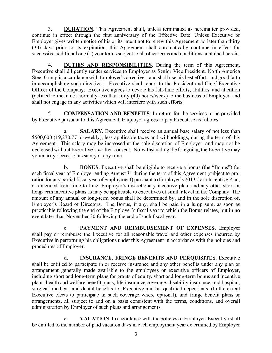 3 3. DURATION. This Agreement shall, unless terminated as hereinafter provided, continue in effect through the first anniversary of the Effective Date. Unless Executive or Employer gives written notice of his or its intent not to renew this Agreement no later than thirty (30) days prior to its expiration, this Agreement shall automatically continue in effect for successive additional one (1) year terms subject to all other terms and conditions contained herein. 4. DUTIES AND RESPONSIBILITIES. During the term of this Agreement, Executive shall diligently render services to Employer as Senior Vice President, North America Steel Group in accordance with Employer’s directives, and shall use his best efforts and good faith in accomplishing such directives. Executive shall report to the President and Chief Executive Officer of the Company. Executive agrees to devote his full-time efforts, abilities, and attention (defined to mean not normally less than forty (40) hours/week) to the business of Employer, and shall not engage in any activities which will interfere with such efforts. 5. COMPENSATION AND BENEFITS. In return for the services to be provided by Executive pursuant to this Agreement, Employer agrees to pay Executive as follows: a. SALARY. Executive shall receive an annual base salary of not less than $500,000 (19,230.77 bi-weekly), less applicable taxes and withholdings, during the term of this Agreement. This salary may be increased at the sole discretion of Employer, and may not be decreased without Executive’s written consent. Notwithstanding the foregoing, the Executive may voluntarily decrease his salary at any time. b. BONUS. Executive shall be eligible to receive a bonus (the “Bonus”) for each fiscal year of Employer ending August 31 during the term of this Agreement (subject to pro- ration for any partial fiscal year of employment) pursuant to Employer’s 2013 Cash Incentive Plan, as amended from time to time, Employer’s discretionary incentive plan, and any other short or long-term incentive plans as may be applicable to executives of similar level in the Company. The amount of any annual or long-term bonus shall be determined by, and in the sole discretion of, Employer’s Board of Directors. The Bonus, if any, shall be paid in a lump sum, as soon as practicable following the end of the Employer’s fiscal year to which the Bonus relates, but in no event later than November 30 following the end of such fiscal year. c. PAYMENT AND REIMBURSEMENT OF EXPENSES. Employer shall pay or reimburse the Executive for all reasonable travel and other expenses incurred by Executive in performing his obligations under this Agreement in accordance with the policies and procedures of Employer. d. INSURANCE, FRINGE BENEFITS AND PERQUISITES. Executive shall be entitled to participate in or receive insurance and any other benefits under any plan or arrangement generally made available to the employees or executive officers of Employer, including short and long-term plans for grants of equity, short and long-term bonus and incentive plans, health and welfare benefit plans, life insurance coverage, disability insurance, and hospital, surgical, medical, and dental benefits for Executive and his qualified dependents, (to the extent Executive elects to participate in such coverage where optional), and fringe benefit plans or arrangements, all subject to and on a basis consistent with the terms, conditions, and overall administration by Employer of such plans and arrangements. e. VACATION. In accordance with the policies of Employer, Executive shall be entitled to the number of paid vacation days in each employment year determined by Employer