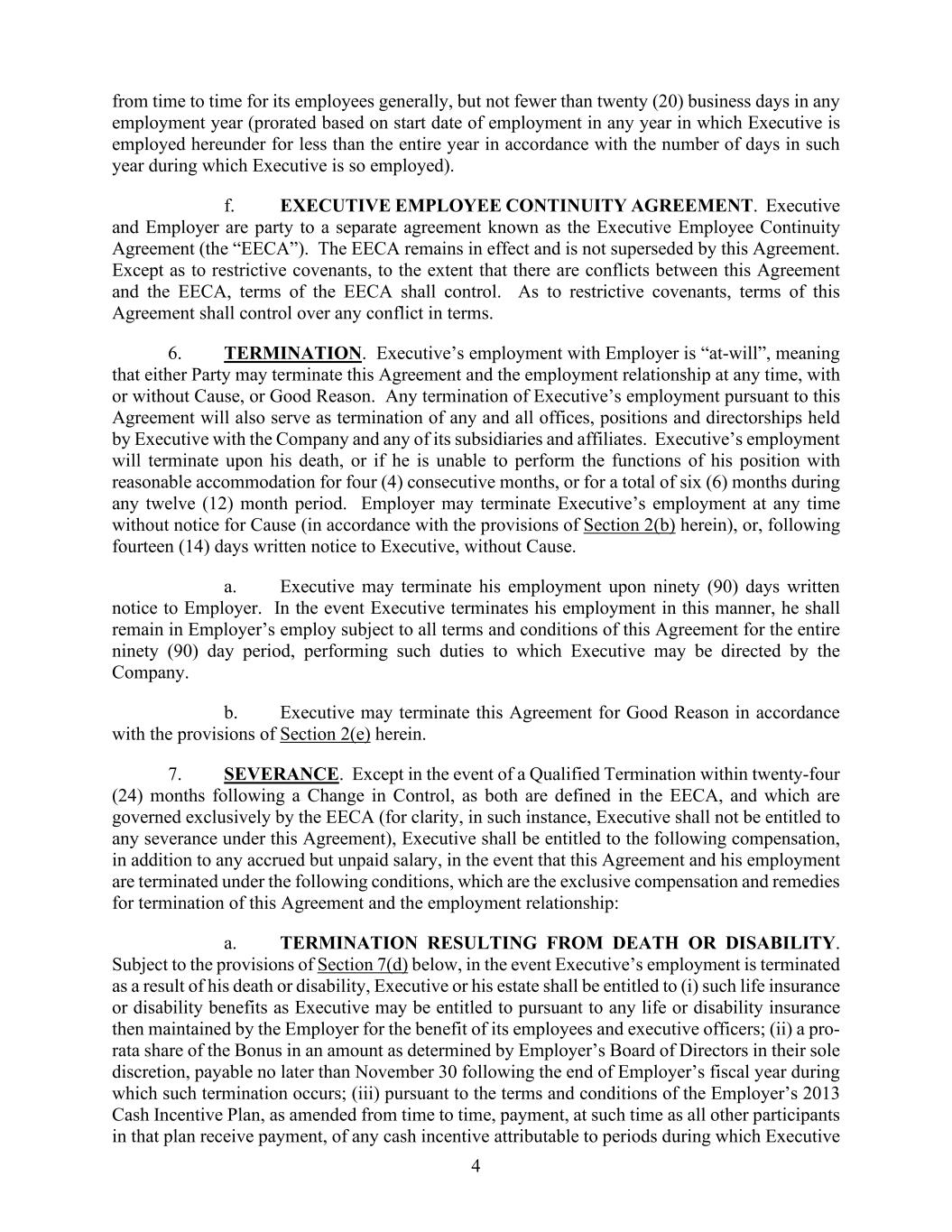 4 from time to time for its employees generally, but not fewer than twenty (20) business days in any employment year (prorated based on start date of employment in any year in which Executive is employed hereunder for less than the entire year in accordance with the number of days in such year during which Executive is so employed). f. EXECUTIVE EMPLOYEE CONTINUITY AGREEMENT. Executive and Employer are party to a separate agreement known as the Executive Employee Continuity Agreement (the “EECA”). The EECA remains in effect and is not superseded by this Agreement. Except as to restrictive covenants, to the extent that there are conflicts between this Agreement and the EECA, terms of the EECA shall control. As to restrictive covenants, terms of this Agreement shall control over any conflict in terms. 6. TERMINATION. Executive’s employment with Employer is “at-will”, meaning that either Party may terminate this Agreement and the employment relationship at any time, with or without Cause, or Good Reason. Any termination of Executive’s employment pursuant to this Agreement will also serve as termination of any and all offices, positions and directorships held by Executive with the Company and any of its subsidiaries and affiliates. Executive’s employment will terminate upon his death, or if he is unable to perform the functions of his position with reasonable accommodation for four (4) consecutive months, or for a total of six (6) months during any twelve (12) month period. Employer may terminate Executive’s employment at any time without notice for Cause (in accordance with the provisions of Section 2(b) herein), or, following fourteen (14) days written notice to Executive, without Cause. a. Executive may terminate his employment upon ninety (90) days written notice to Employer. In the event Executive terminates his employment in this manner, he shall remain in Employer’s employ subject to all terms and conditions of this Agreement for the entire ninety (90) day period, performing such duties to which Executive may be directed by the Company. b. Executive may terminate this Agreement for Good Reason in accordance with the provisions of Section 2(e) herein. 7. SEVERANCE. Except in the event of a Qualified Termination within twenty-four (24) months following a Change in Control, as both are defined in the EECA, and which are governed exclusively by the EECA (for clarity, in such instance, Executive shall not be entitled to any severance under this Agreement), Executive shall be entitled to the following compensation, in addition to any accrued but unpaid salary, in the event that this Agreement and his employment are terminated under the following conditions, which are the exclusive compensation and remedies for termination of this Agreement and the employment relationship: a. TERMINATION RESULTING FROM DEATH OR DISABILITY. Subject to the provisions of Section 7(d) below, in the event Executive’s employment is terminated as a result of his death or disability, Executive or his estate shall be entitled to (i) such life insurance or disability benefits as Executive may be entitled to pursuant to any life or disability insurance then maintained by the Employer for the benefit of its employees and executive officers; (ii) a pro- rata share of the Bonus in an amount as determined by Employer’s Board of Directors in their sole discretion, payable no later than November 30 following the end of Employer’s fiscal year during which such termination occurs; (iii) pursuant to the terms and conditions of the Employer’s 2013 Cash Incentive Plan, as amended from time to time, payment, at such time as all other participants in that plan receive payment, of any cash incentive attributable to periods during which Executive