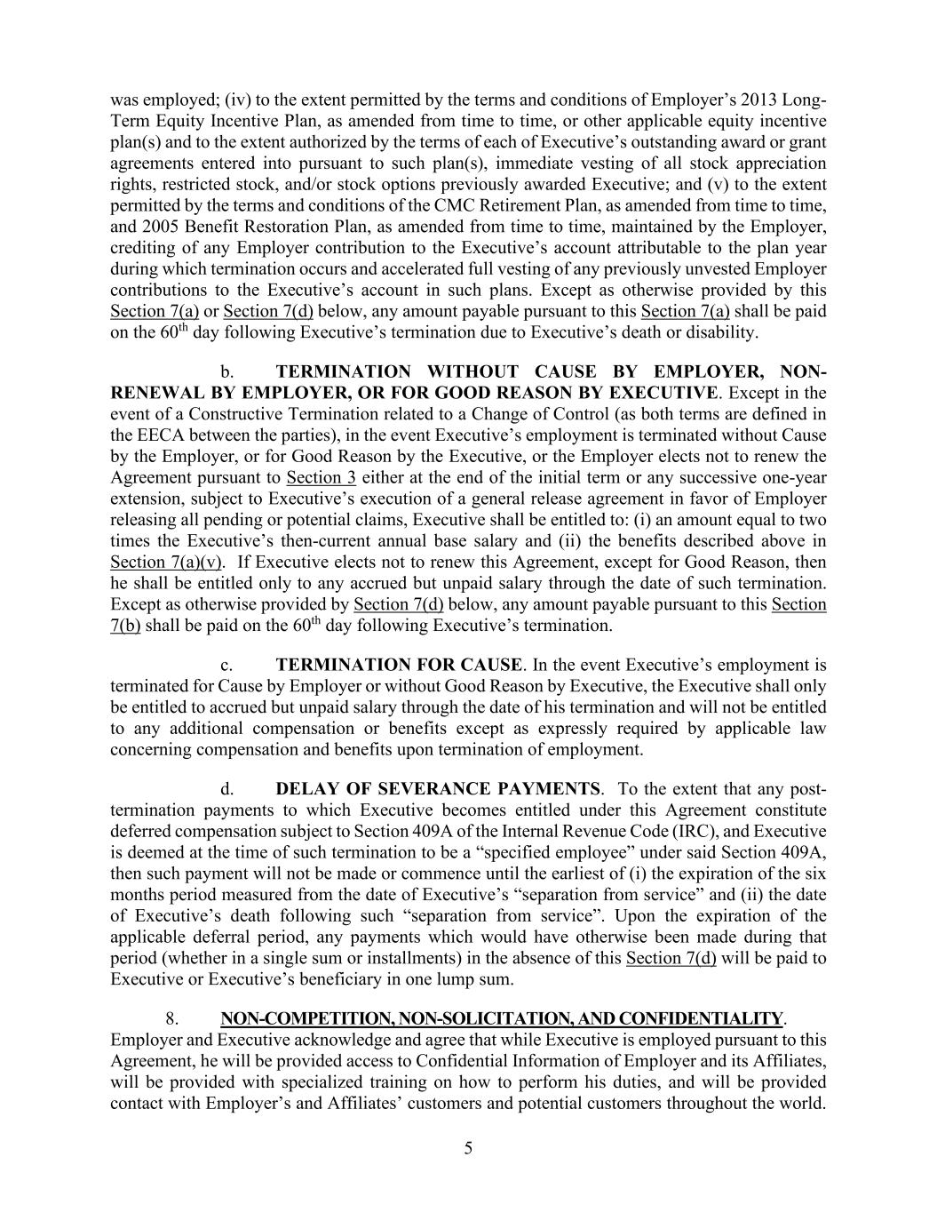 5 was employed; (iv) to the extent permitted by the terms and conditions of Employer’s 2013 Long- Term Equity Incentive Plan, as amended from time to time, or other applicable equity incentive plan(s) and to the extent authorized by the terms of each of Executive’s outstanding award or grant agreements entered into pursuant to such plan(s), immediate vesting of all stock appreciation rights, restricted stock, and/or stock options previously awarded Executive; and (v) to the extent permitted by the terms and conditions of the CMC Retirement Plan, as amended from time to time, and 2005 Benefit Restoration Plan, as amended from time to time, maintained by the Employer, crediting of any Employer contribution to the Executive’s account attributable to the plan year during which termination occurs and accelerated full vesting of any previously unvested Employer contributions to the Executive’s account in such plans. Except as otherwise provided by this Section 7(a) or Section 7(d) below, any amount payable pursuant to this Section 7(a) shall be paid on the 60th day following Executive’s termination due to Executive’s death or disability. b. TERMINATION WITHOUT CAUSE BY EMPLOYER, NON- RENEWAL BY EMPLOYER, OR FOR GOOD REASON BY EXECUTIVE. Except in the event of a Constructive Termination related to a Change of Control (as both terms are defined in the EECA between the parties), in the event Executive’s employment is terminated without Cause by the Employer, or for Good Reason by the Executive, or the Employer elects not to renew the Agreement pursuant to Section 3 either at the end of the initial term or any successive one-year extension, subject to Executive’s execution of a general release agreement in favor of Employer releasing all pending or potential claims, Executive shall be entitled to: (i) an amount equal to two times the Executive’s then-current annual base salary and (ii) the benefits described above in Section 7(a)(v). If Executive elects not to renew this Agreement, except for Good Reason, then he shall be entitled only to any accrued but unpaid salary through the date of such termination. Except as otherwise provided by Section 7(d) below, any amount payable pursuant to this Section 7(b) shall be paid on the 60th day following Executive’s termination. c. TERMINATION FOR CAUSE. In the event Executive’s employment is terminated for Cause by Employer or without Good Reason by Executive, the Executive shall only be entitled to accrued but unpaid salary through the date of his termination and will not be entitled to any additional compensation or benefits except as expressly required by applicable law concerning compensation and benefits upon termination of employment. d. DELAY OF SEVERANCE PAYMENTS. To the extent that any post- termination payments to which Executive becomes entitled under this Agreement constitute deferred compensation subject to Section 409A of the Internal Revenue Code (IRC), and Executive is deemed at the time of such termination to be a “specified employee” under said Section 409A, then such payment will not be made or commence until the earliest of (i) the expiration of the six months period measured from the date of Executive’s “separation from service” and (ii) the date of Executive’s death following such “separation from service”. Upon the expiration of the applicable deferral period, any payments which would have otherwise been made during that period (whether in a single sum or installments) in the absence of this Section 7(d) will be paid to Executive or Executive’s beneficiary in one lump sum. 8. NON-COMPETITION, NON-SOLICITATION, AND CONFIDENTIALITY. Employer and Executive acknowledge and agree that while Executive is employed pursuant to this Agreement, he will be provided access to Confidential Information of Employer and its Affiliates, will be provided with specialized training on how to perform his duties, and will be provided contact with Employer’s and Affiliates’ customers and potential customers throughout the world.