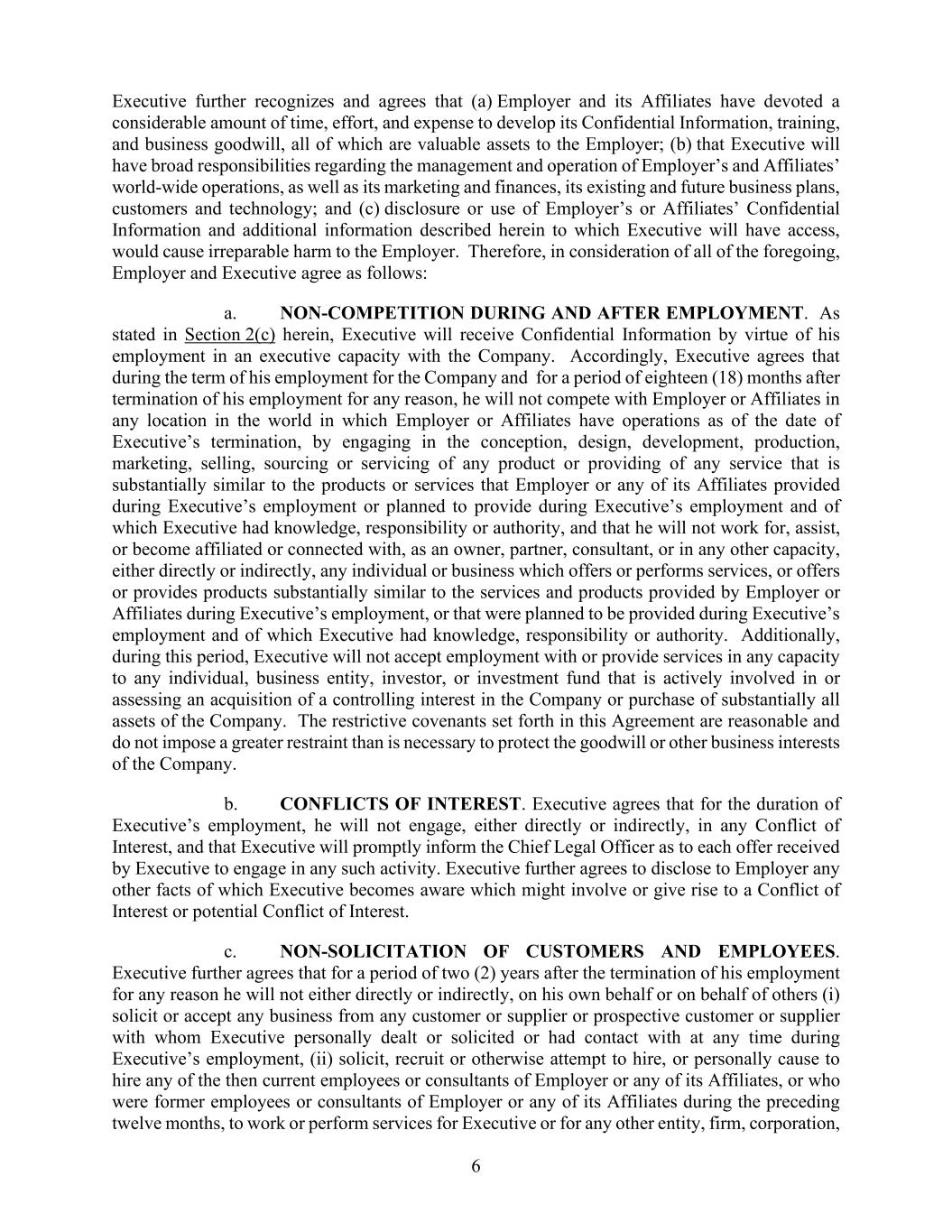 6 Executive further recognizes and agrees that (a) Employer and its Affiliates have devoted a considerable amount of time, effort, and expense to develop its Confidential Information, training, and business goodwill, all of which are valuable assets to the Employer; (b) that Executive will have broad responsibilities regarding the management and operation of Employer’s and Affiliates’ world-wide operations, as well as its marketing and finances, its existing and future business plans, customers and technology; and (c) disclosure or use of Employer’s or Affiliates’ Confidential Information and additional information described herein to which Executive will have access, would cause irreparable harm to the Employer. Therefore, in consideration of all of the foregoing, Employer and Executive agree as follows: a. NON-COMPETITION DURING AND AFTER EMPLOYMENT. As stated in Section 2(c) herein, Executive will receive Confidential Information by virtue of his employment in an executive capacity with the Company. Accordingly, Executive agrees that during the term of his employment for the Company and for a period of eighteen (18) months after termination of his employment for any reason, he will not compete with Employer or Affiliates in any location in the world in which Employer or Affiliates have operations as of the date of Executive’s termination, by engaging in the conception, design, development, production, marketing, selling, sourcing or servicing of any product or providing of any service that is substantially similar to the products or services that Employer or any of its Affiliates provided during Executive’s employment or planned to provide during Executive’s employment and of which Executive had knowledge, responsibility or authority, and that he will not work for, assist, or become affiliated or connected with, as an owner, partner, consultant, or in any other capacity, either directly or indirectly, any individual or business which offers or performs services, or offers or provides products substantially similar to the services and products provided by Employer or Affiliates during Executive’s employment, or that were planned to be provided during Executive’s employment and of which Executive had knowledge, responsibility or authority. Additionally, during this period, Executive will not accept employment with or provide services in any capacity to any individual, business entity, investor, or investment fund that is actively involved in or assessing an acquisition of a controlling interest in the Company or purchase of substantially all assets of the Company. The restrictive covenants set forth in this Agreement are reasonable and do not impose a greater restraint than is necessary to protect the goodwill or other business interests of the Company. b. CONFLICTS OF INTEREST. Executive agrees that for the duration of Executive’s employment, he will not engage, either directly or indirectly, in any Conflict of Interest, and that Executive will promptly inform the Chief Legal Officer as to each offer received by Executive to engage in any such activity. Executive further agrees to disclose to Employer any other facts of which Executive becomes aware which might involve or give rise to a Conflict of Interest or potential Conflict of Interest. c. NON-SOLICITATION OF CUSTOMERS AND EMPLOYEES. Executive further agrees that for a period of two (2) years after the termination of his employment for any reason he will not either directly or indirectly, on his own behalf or on behalf of others (i) solicit or accept any business from any customer or supplier or prospective customer or supplier with whom Executive personally dealt or solicited or had contact with at any time during Executive’s employment, (ii) solicit, recruit or otherwise attempt to hire, or personally cause to hire any of the then current employees or consultants of Employer or any of its Affiliates, or who were former employees or consultants of Employer or any of its Affiliates during the preceding twelve months, to work or perform services for Executive or for any other entity, firm, corporation,