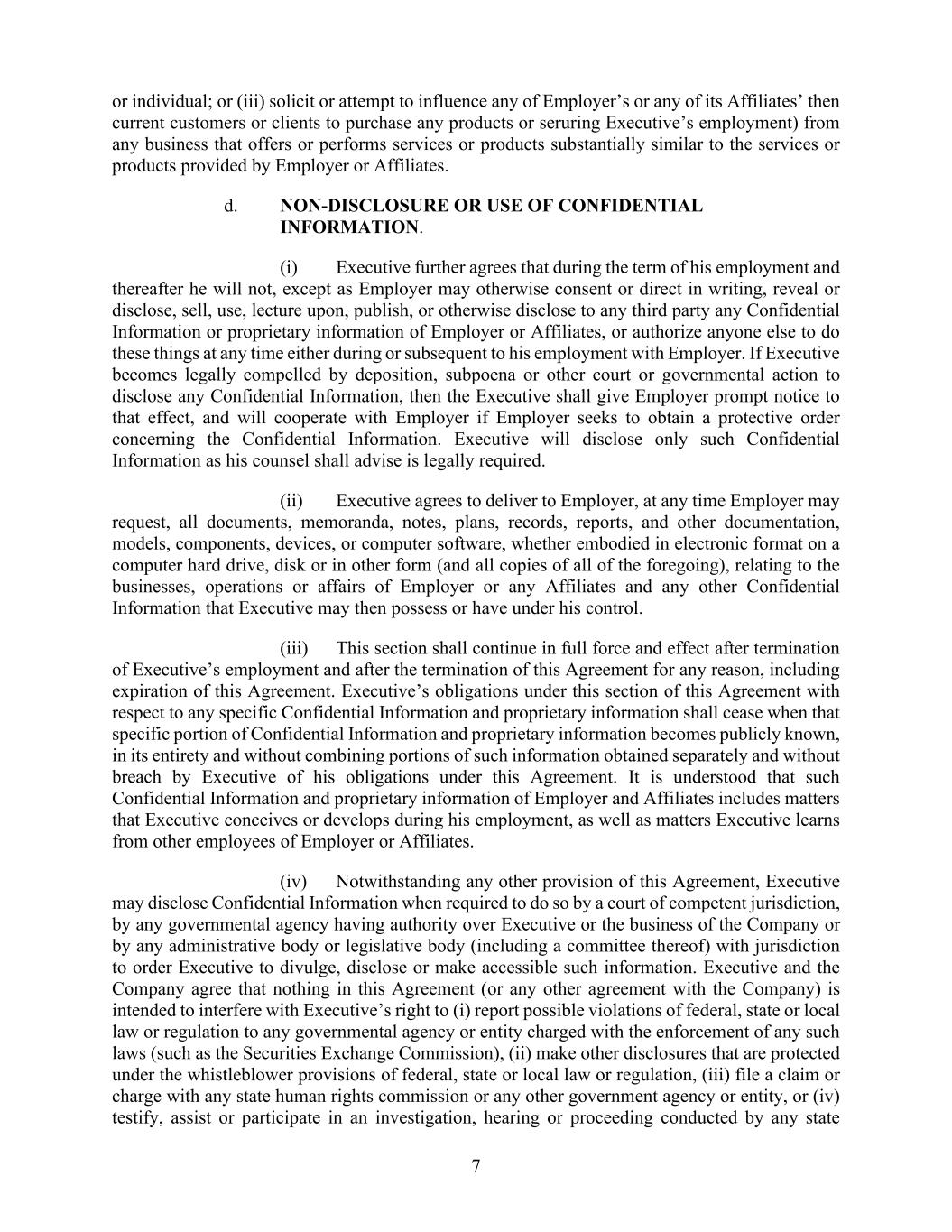 7 or individual; or (iii) solicit or attempt to influence any of Employer’s or any of its Affiliates’ then current customers or clients to purchase any products or seruring Executive’s employment) from any business that offers or performs services or products substantially similar to the services or products provided by Employer or Affiliates. d. NON-DISCLOSURE OR USE OF CONFIDENTIAL INFORMATION. (i) Executive further agrees that during the term of his employment and thereafter he will not, except as Employer may otherwise consent or direct in writing, reveal or disclose, sell, use, lecture upon, publish, or otherwise disclose to any third party any Confidential Information or proprietary information of Employer or Affiliates, or authorize anyone else to do these things at any time either during or subsequent to his employment with Employer. If Executive becomes legally compelled by deposition, subpoena or other court or governmental action to disclose any Confidential Information, then the Executive shall give Employer prompt notice to that effect, and will cooperate with Employer if Employer seeks to obtain a protective order concerning the Confidential Information. Executive will disclose only such Confidential Information as his counsel shall advise is legally required. (ii) Executive agrees to deliver to Employer, at any time Employer may request, all documents, memoranda, notes, plans, records, reports, and other documentation, models, components, devices, or computer software, whether embodied in electronic format on a computer hard drive, disk or in other form (and all copies of all of the foregoing), relating to the businesses, operations or affairs of Employer or any Affiliates and any other Confidential Information that Executive may then possess or have under his control. (iii) This section shall continue in full force and effect after termination of Executive’s employment and after the termination of this Agreement for any reason, including expiration of this Agreement. Executive’s obligations under this section of this Agreement with respect to any specific Confidential Information and proprietary information shall cease when that specific portion of Confidential Information and proprietary information becomes publicly known, in its entirety and without combining portions of such information obtained separately and without breach by Executive of his obligations under this Agreement. It is understood that such Confidential Information and proprietary information of Employer and Affiliates includes matters that Executive conceives or develops during his employment, as well as matters Executive learns from other employees of Employer or Affiliates. (iv) Notwithstanding any other provision of this Agreement, Executive may disclose Confidential Information when required to do so by a court of competent jurisdiction, by any governmental agency having authority over Executive or the business of the Company or by any administrative body or legislative body (including a committee thereof) with jurisdiction to order Executive to divulge, disclose or make accessible such information. Executive and the Company agree that nothing in this Agreement (or any other agreement with the Company) is intended to interfere with Executive’s right to (i) report possible violations of federal, state or local law or regulation to any governmental agency or entity charged with the enforcement of any such laws (such as the Securities Exchange Commission), (ii) make other disclosures that are protected under the whistleblower provisions of federal, state or local law or regulation, (iii) file a claim or charge with any state human rights commission or any other government agency or entity, or (iv) testify, assist or participate in an investigation, hearing or proceeding conducted by any state