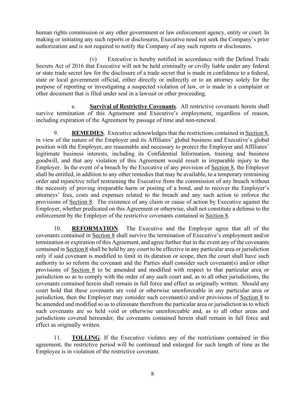 8 human rights commission or any other government or law enforcement agency, entity or court. In making or initiating any such reports or disclosures, Executive need not seek the Company’s prior authorization and is not required to notify the Company of any such reports or disclosures. (v) Executive is hereby notified in accordance with the Defend Trade Secrets Act of 2016 that Executive will not be held criminally or civilly liable under any federal or state trade secret law for the disclosure of a trade secret that is made in confidence to a federal, state or local government official, either directly or indirectly or to an attorney solely for the purpose of reporting or investigating a suspected violation of law, or is made in a complaint or other document that is filed under seal in a lawsuit or other proceeding. e. Survival of Restrictive Covenants. All restrictive covenants herein shall survive termination of this Agreement and Executive’s employment, regardless of reason, including expiration of the Agreement by passage of time and non-renewal. 9. REMEDIES. Executive acknowledges that the restrictions contained in Section 8, in view of the nature of the Employer and its Affiliates’ global business and Executive’s global position with the Employer, are reasonable and necessary to protect the Employer and Affiliates’ legitimate business interests, including its Confidential Information, training and business goodwill, and that any violation of this Agreement would result in irreparable injury to the Employer. In the event of a breach by the Executive of any provision of Section 8, the Employer shall be entitled, in addition to any other remedies that may be available, to a temporary restraining order and injunctive relief restraining the Executive from the commission of any breach without the necessity of proving irreparable harm or posting of a bond, and to recover the Employer’s attorneys’ fees, costs and expenses related to the breach and any such action to enforce the provisions of Section 8. The existence of any claim or cause of action by Executive against the Employer, whether predicated on this Agreement or otherwise, shall not constitute a defense to the enforcement by the Employer of the restrictive covenants contained in Section 8. 10. REFORMATION. The Executive and the Employer agree that all of the covenants contained in Section 8 shall survive the termination of Executive’s employment and/or termination or expiration of this Agreement, and agree further that in the event any of the covenants contained in Section 8 shall be held by any court to be effective in any particular area or jurisdiction only if said covenant is modified to limit in its duration or scope, then the court shall have such authority to so reform the covenant and the Parties shall consider such covenant(s) and/or other provisions of Section 8 to be amended and modified with respect to that particular area or jurisdiction so as to comply with the order of any such court and, as to all other jurisdictions, the covenants contained herein shall remain in full force and effect as originally written. Should any court hold that these covenants are void or otherwise unenforceable in any particular area or jurisdiction, then the Employer may consider such covenant(s) and/or provisions of Section 8 to be amended and modified so as to eliminate therefrom the particular area or jurisdiction as to which such covenants are so held void or otherwise unenforceable and, as to all other areas and jurisdictions covered hereunder, the covenants contained herein shall remain in full force and effect as originally written. 11. TOLLING. If the Executive violates any of the restrictions contained in this agreement, the restrictive period will be continued and enlarged for such length of time as the Employee is in violation of the restrictive covenant.