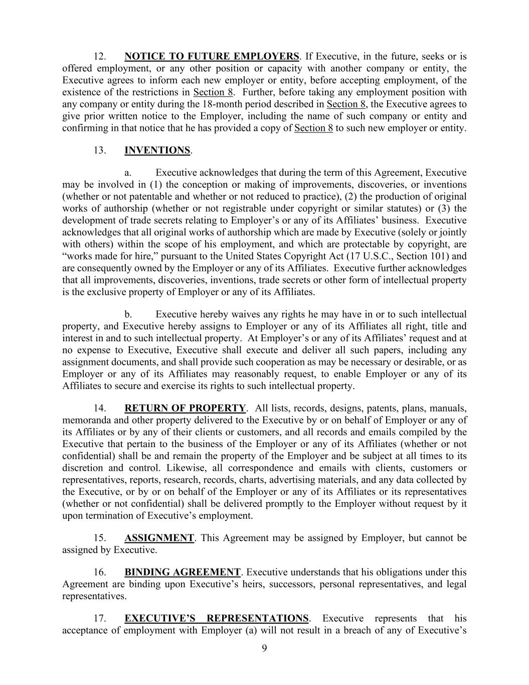 9 12. NOTICE TO FUTURE EMPLOYERS. If Executive, in the future, seeks or is offered employment, or any other position or capacity with another company or entity, the Executive agrees to inform each new employer or entity, before accepting employment, of the existence of the restrictions in Section 8. Further, before taking any employment position with any company or entity during the 18-month period described in Section 8, the Executive agrees to give prior written notice to the Employer, including the name of such company or entity and confirming in that notice that he has provided a copy of Section 8 to such new employer or entity. 13. INVENTIONS. a. Executive acknowledges that during the term of this Agreement, Executive may be involved in (1) the conception or making of improvements, discoveries, or inventions (whether or not patentable and whether or not reduced to practice), (2) the production of original works of authorship (whether or not registrable under copyright or similar statutes) or (3) the development of trade secrets relating to Employer’s or any of its Affiliates’ business. Executive acknowledges that all original works of authorship which are made by Executive (solely or jointly with others) within the scope of his employment, and which are protectable by copyright, are “works made for hire,” pursuant to the United States Copyright Act (17 U.S.C., Section 101) and are consequently owned by the Employer or any of its Affiliates. Executive further acknowledges that all improvements, discoveries, inventions, trade secrets or other form of intellectual property is the exclusive property of Employer or any of its Affiliates. b. Executive hereby waives any rights he may have in or to such intellectual property, and Executive hereby assigns to Employer or any of its Affiliates all right, title and interest in and to such intellectual property. At Employer’s or any of its Affiliates’ request and at no expense to Executive, Executive shall execute and deliver all such papers, including any assignment documents, and shall provide such cooperation as may be necessary or desirable, or as Employer or any of its Affiliates may reasonably request, to enable Employer or any of its Affiliates to secure and exercise its rights to such intellectual property. 14. RETURN OF PROPERTY. All lists, records, designs, patents, plans, manuals, memoranda and other property delivered to the Executive by or on behalf of Employer or any of its Affiliates or by any of their clients or customers, and all records and emails compiled by the Executive that pertain to the business of the Employer or any of its Affiliates (whether or not confidential) shall be and remain the property of the Employer and be subject at all times to its discretion and control. Likewise, all correspondence and emails with clients, customers or representatives, reports, research, records, charts, advertising materials, and any data collected by the Executive, or by or on behalf of the Employer or any of its Affiliates or its representatives (whether or not confidential) shall be delivered promptly to the Employer without request by it upon termination of Executive’s employment. 15. ASSIGNMENT. This Agreement may be assigned by Employer, but cannot be assigned by Executive. 16. BINDING AGREEMENT. Executive understands that his obligations under this Agreement are binding upon Executive’s heirs, successors, personal representatives, and legal representatives. 17. EXECUTIVE’S REPRESENTATIONS. Executive represents that his acceptance of employment with Employer (a) will not result in a breach of any of Executive’s