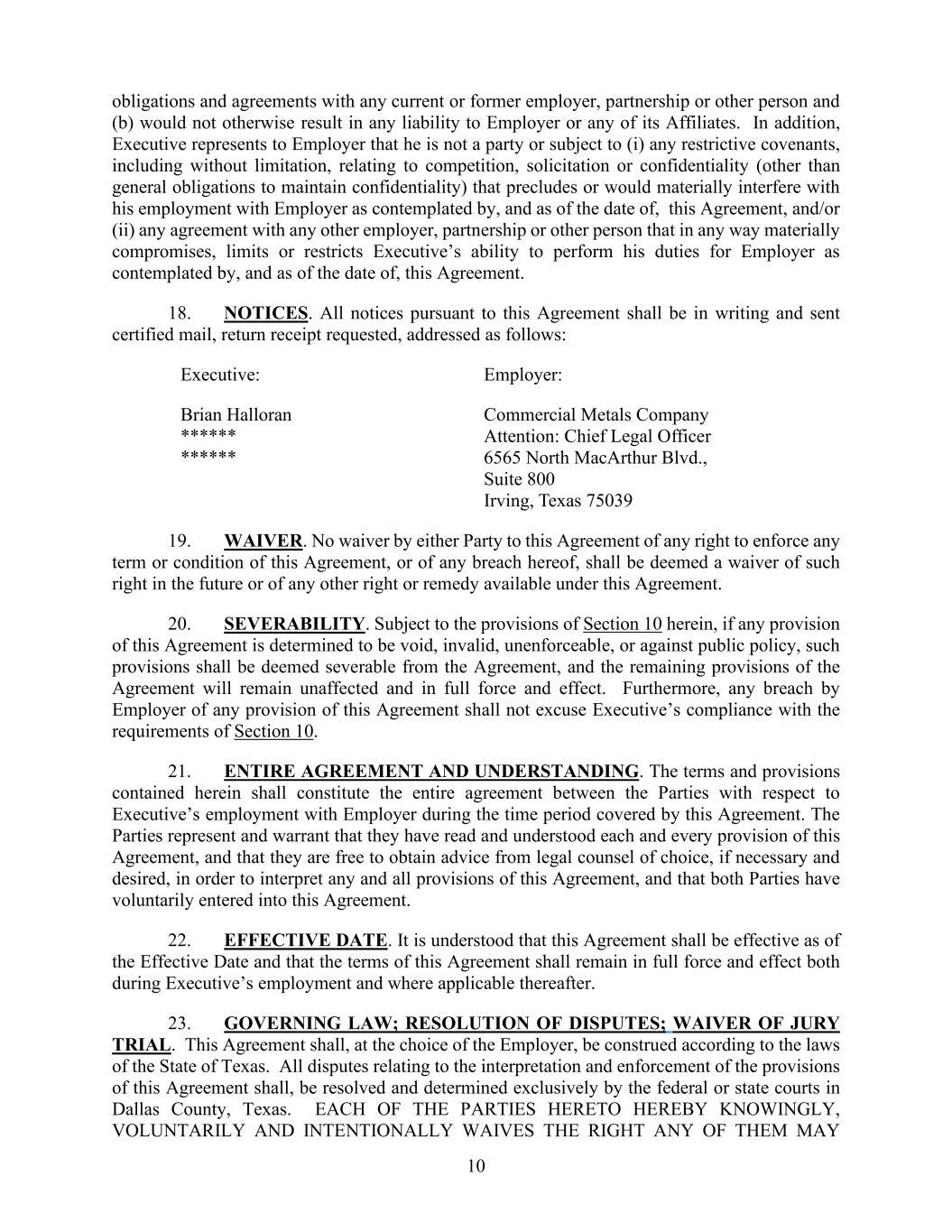 10 obligations and agreements with any current or former employer, partnership or other person and (b) would not otherwise result in any liability to Employer or any of its Affiliates. In addition, Executive represents to Employer that he is not a party or subject to (i) any restrictive covenants, including without limitation, relating to competition, solicitation or confidentiality (other than general obligations to maintain confidentiality) that precludes or would materially interfere with his employment with Employer as contemplated by, and as of the date of, this Agreement, and/or (ii) any agreement with any other employer, partnership or other person that in any way materially compromises, limits or restricts Executive’s ability to perform his duties for Employer as contemplated by, and as of the date of, this Agreement. 18. NOTICES. All notices pursuant to this Agreement shall be in writing and sent certified mail, return receipt requested, addressed as follows: Executive: Employer: Brian Halloran ****** ****** Commercial Metals Company Attention: Chief Legal Officer 6565 North MacArthur Blvd., Suite 800 Irving, Texas 75039 19. WAIVER. No waiver by either Party to this Agreement of any right to enforce any term or condition of this Agreement, or of any breach hereof, shall be deemed a waiver of such right in the future or of any other right or remedy available under this Agreement. 20. SEVERABILITY. Subject to the provisions of Section 10 herein, if any provision of this Agreement is determined to be void, invalid, unenforceable, or against public policy, such provisions shall be deemed severable from the Agreement, and the remaining provisions of the Agreement will remain unaffected and in full force and effect. Furthermore, any breach by Employer of any provision of this Agreement shall not excuse Executive’s compliance with the requirements of Section 10. 21. ENTIRE AGREEMENT AND UNDERSTANDING. The terms and provisions contained herein shall constitute the entire agreement between the Parties with respect to Executive’s employment with Employer during the time period covered by this Agreement. The Parties represent and warrant that they have read and understood each and every provision of this Agreement, and that they are free to obtain advice from legal counsel of choice, if necessary and desired, in order to interpret any and all provisions of this Agreement, and that both Parties have voluntarily entered into this Agreement. 22. EFFECTIVE DATE. It is understood that this Agreement shall be effective as of the Effective Date and that the terms of this Agreement shall remain in full force and effect both during Executive’s employment and where applicable thereafter. 23. GOVERNING LAW; RESOLUTION OF DISPUTES; WAIVER OF JURY TRIAL. This Agreement shall, at the choice of the Employer, be construed according to the laws of the State of Texas. All disputes relating to the interpretation and enforcement of the provisions of this Agreement shall, be resolved and determined exclusively by the federal or state courts in Dallas County, Texas. EACH OF THE PARTIES HERETO HEREBY KNOWINGLY, VOLUNTARILY AND INTENTIONALLY WAIVES THE RIGHT ANY OF THEM MAY