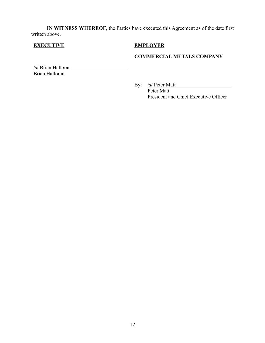 12 IN WITNESS WHEREOF, the Parties have executed this Agreement as of the date first written above. EXECUTIVE EMPLOYER COMMERCIAL METALS COMPANY /s/ Brian Halloran Brian Halloran By: /s/ Peter Matt Peter Matt President and Chief Executive Officer