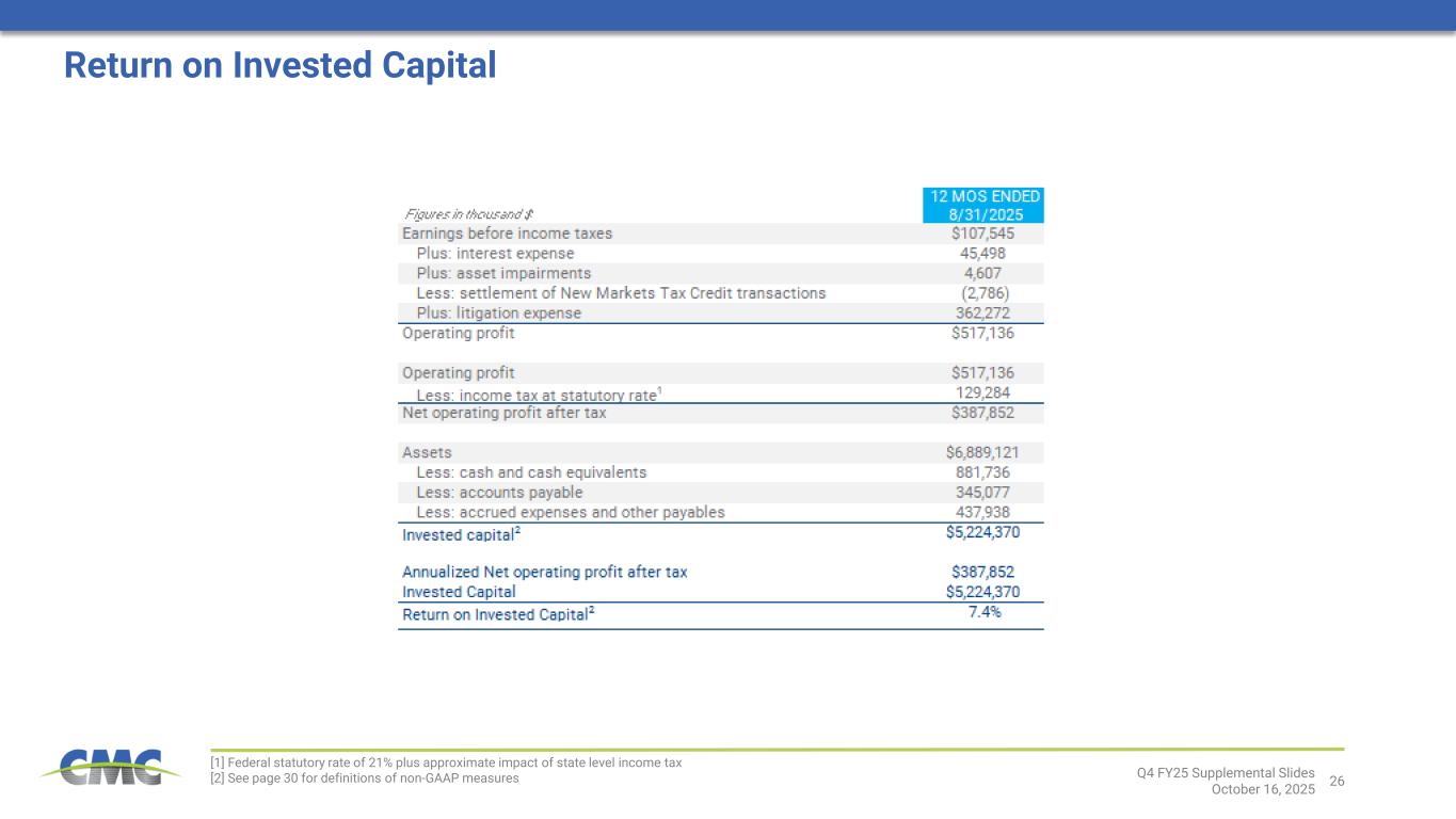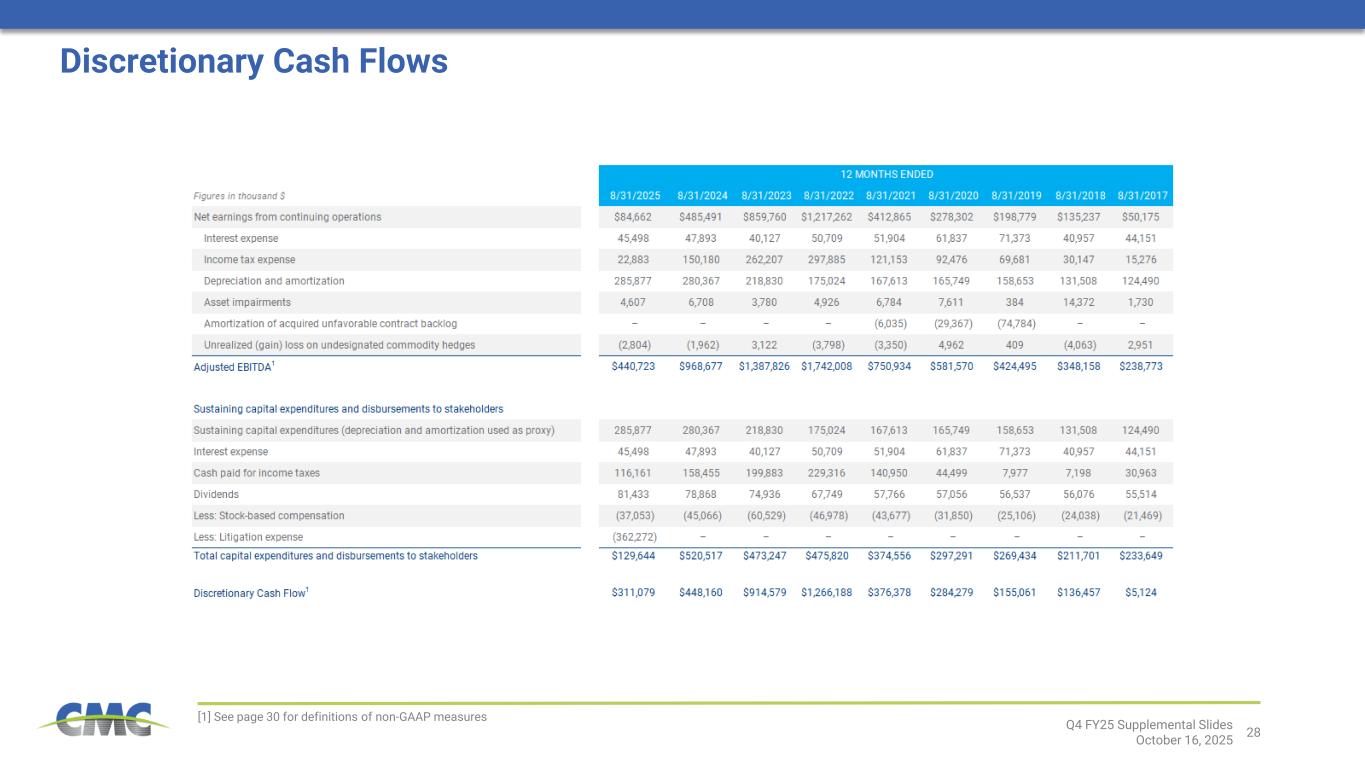 当社のバランスシートと流動性は引き続き良好であった。2025年8月31日現在、現金および現金同等物は合計10億ドル、利用可能流動性はほぼ19億ドルであった。当四半期中、CMCは総額5,000万ドル相当の普通株式97万4,462株を買い戻した。2025年8月31日現在、2億500万ドルの自社株買戻し枠が残っている。