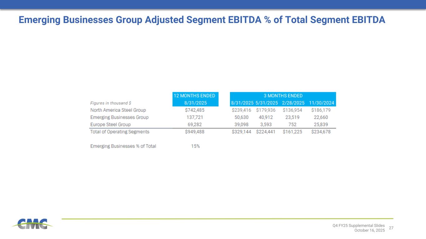テキサス州アービング-2025年10月16日-コマーシャル・メタルズ・カンパニー(NYSE:CMC)は本日、2025年8月31日を期末とする会計年度第4四半期および会計年度の業績を発表した。