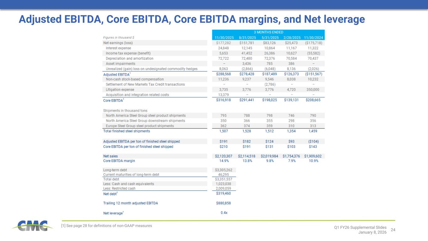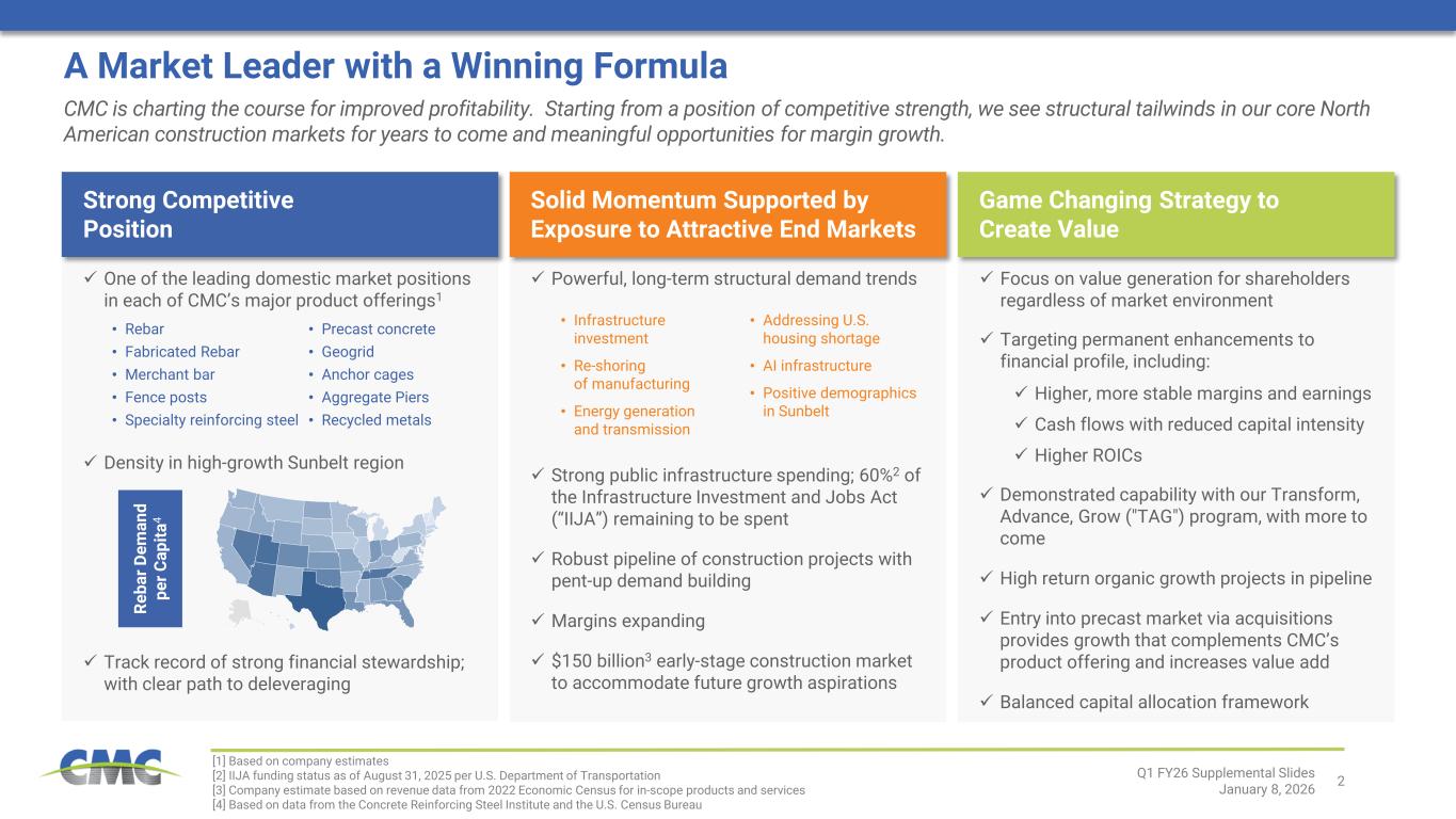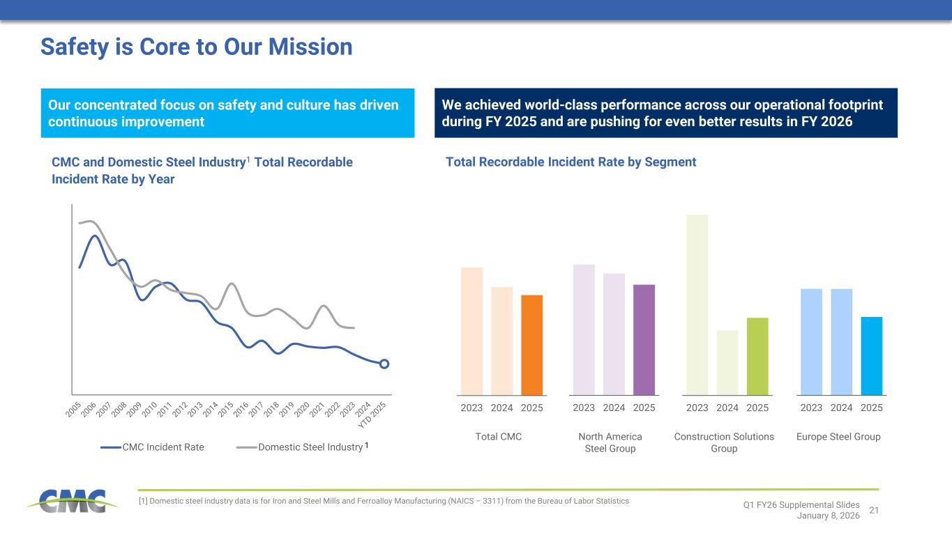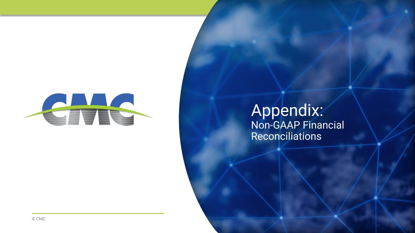当社の将来に関する記述は、本ニュースリリース作成時点における経営陣の予想と確信に基づいています。 当社の予想は合理的であると確信しておりますが、これらの予想が正しいと証明される保証はなく、実際の結果は大きく異なる可能性があります。法令で要求される場合を除き、当社は、前提条件の変更、予想される事象または予期せぬ事象の発生、新たな情報または状況、その他の変更を反映するために、将来に関する記述を更新、修正、または明確化する義務を負いません。 実際の結果が当社の予想と大きく異なる可能性のある重要な要因には、米国証券取引委員会(SEC)への提出書類に記載されている事項が含まれます。これには、2025年8月31日終了年度におけるForm 10-K年次報告書のPart I、Item 1A「リスク要因」に記載されている事項、ならびに以下の事項が含まれますが、これらに限定されません: 当社製品への需要や建設活動全般に影響を与える経済状況の変化、およびこうした変化が極めて循環的な鉄鋼業界に与える影響;金属価格の急激かつ大幅な変動(商品価格下落による在庫評価損の可能性、または商品価格上昇による垂直統合型鉄鋼事業における下流契約の収益性低下);業界(特に中国)における過剰生産能力、競合鉄鋼メーカーやその他の鉄鋼供給業者(輸入数量・価格を含む)による製品供給状況; 米国で進行中の複数の電気アーク炉プロジェクトから稼働開始が見込まれる追加製鋼能力の影響;政治的混乱・変動、地域紛争、テロリズム、戦争を含む地政学的状況が世界経済、インフレ、エネルギー供給、原材料に与える影響;環境・社会・ガバナンス(ESG)問題への関心の高まり(ESG目標、環境正義、規制イニシアチブを含む); 新規プロジェクトの試運転に伴う操業・立ち上げリスクならびに市場リスクにより、当社が予想する成果(CMC 2026年度第1四半期 - 7)を実現できない可能性